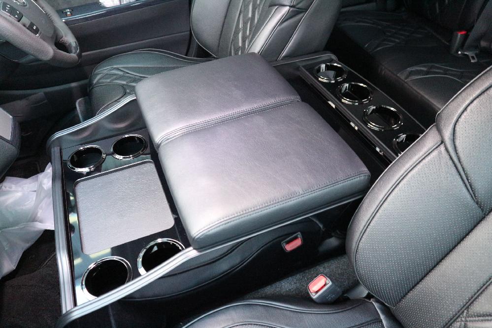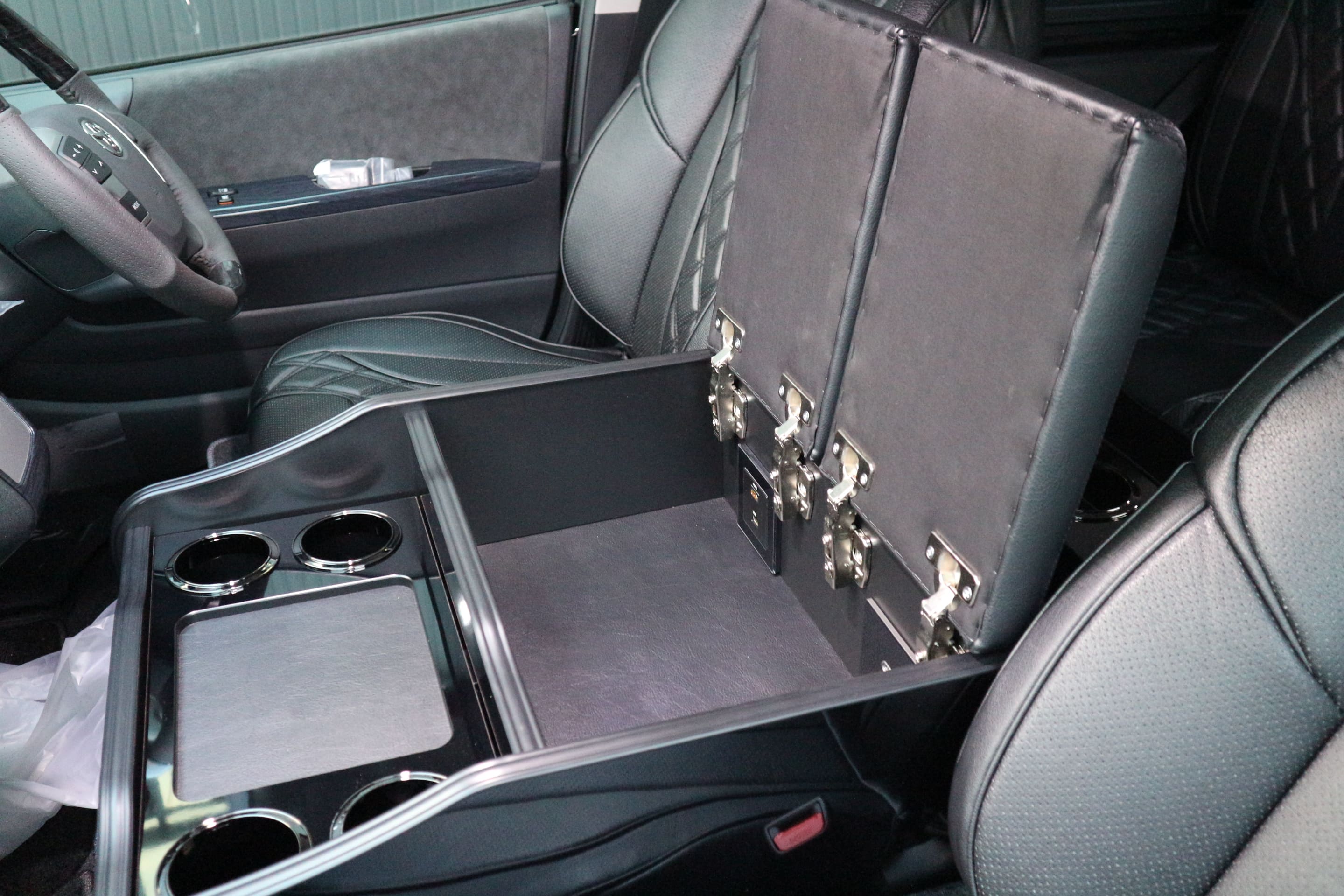 セパレートラウンジ展開 3列目後ろ向き2名シート展開 ベットマット背もたれ展開 後ろ向き専用シートベルト搭載 オプションサイドレール式テーブル(ロングレッグ)