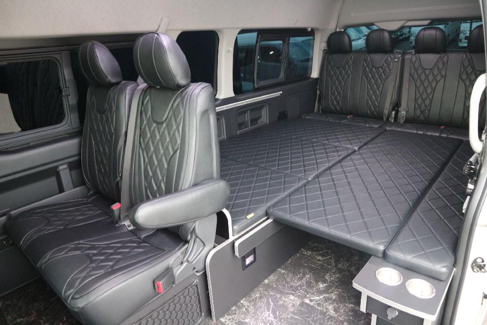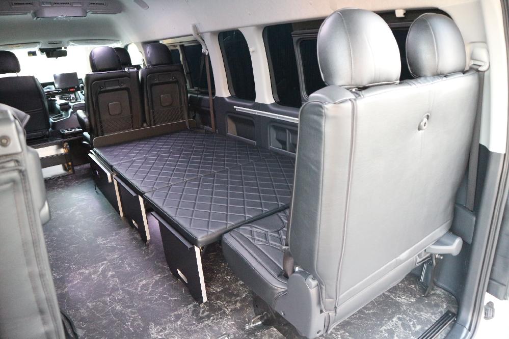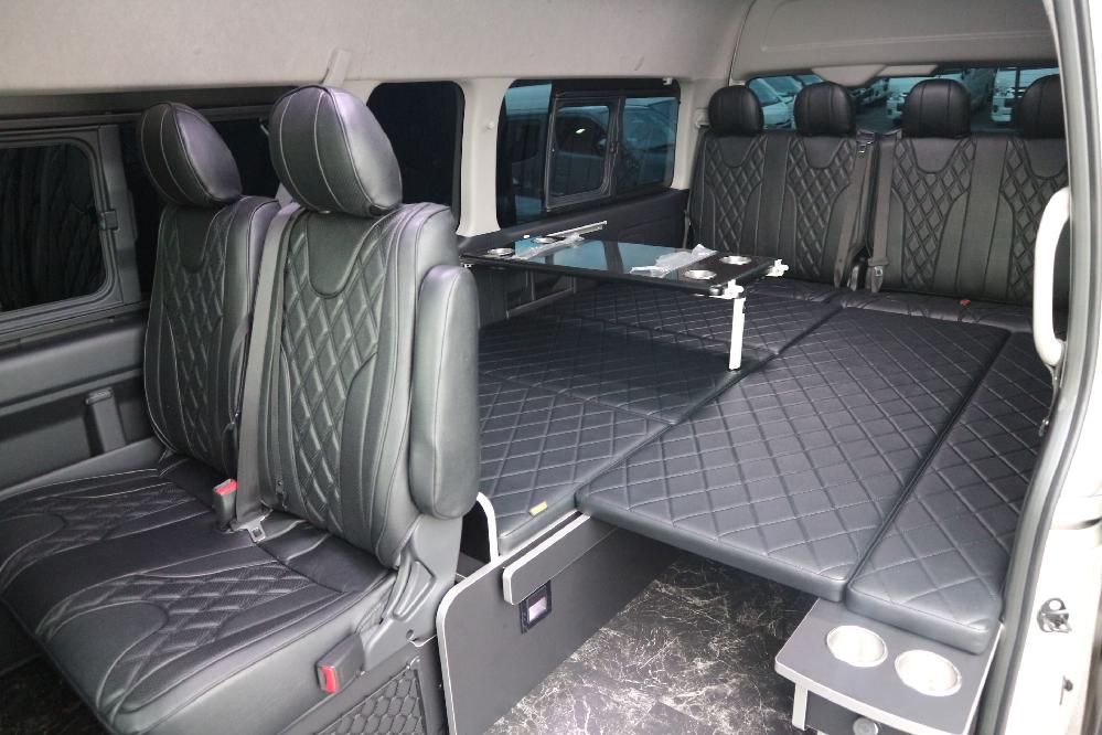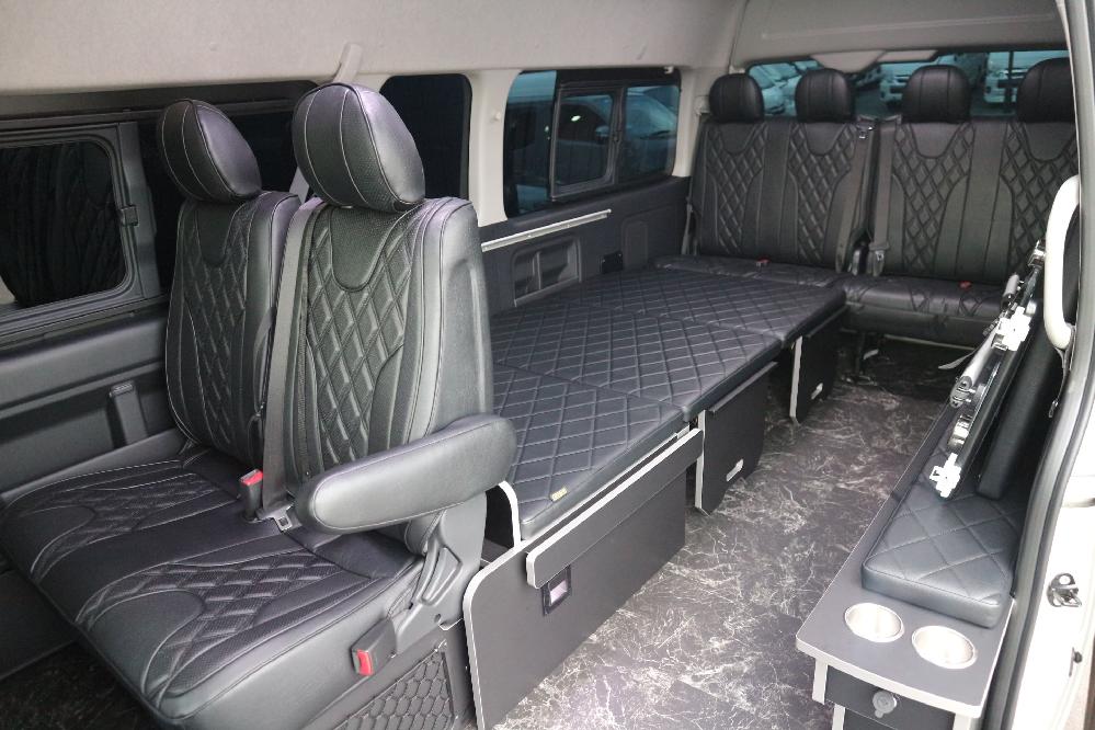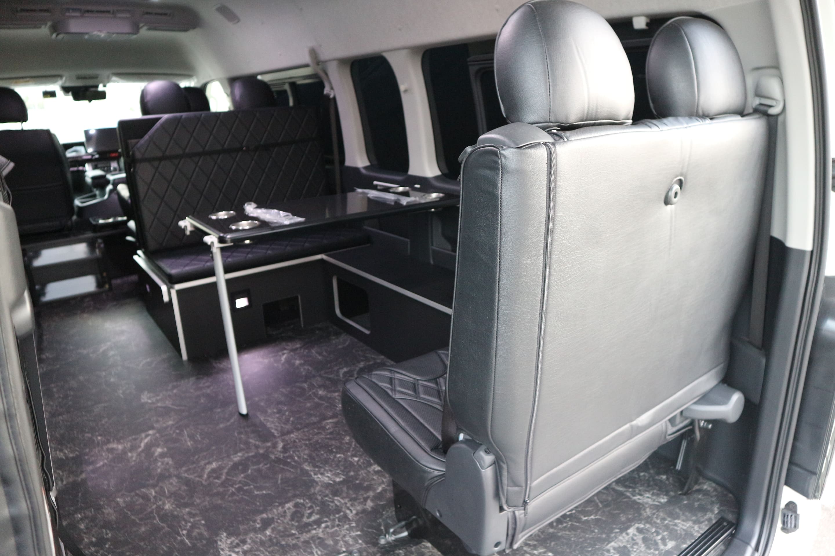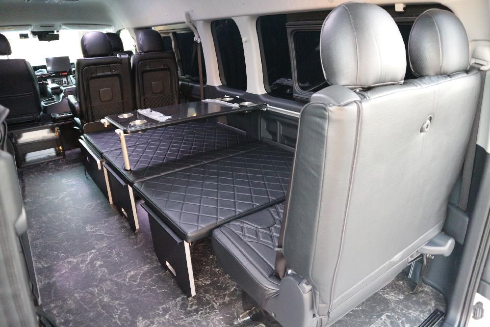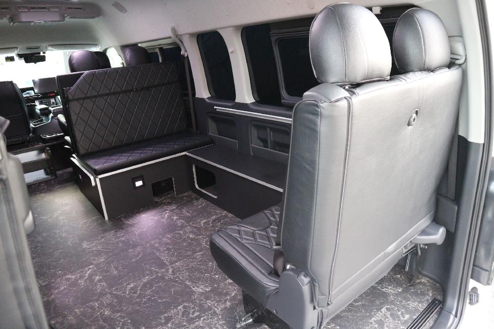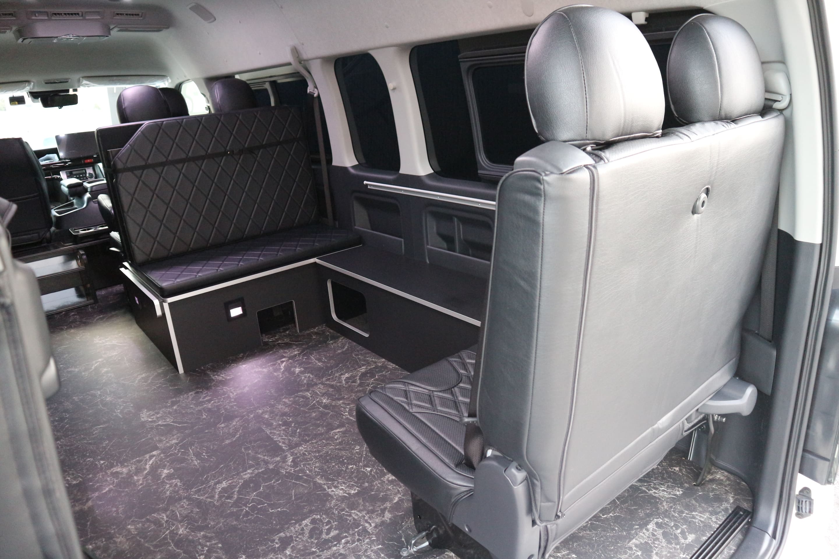 IF-WB8リビングサルーン 200系ハイエースコミューターGL スーパーロング 前向き8名後ろ向き2名10人乗り対面ラウンジベッド家具施工