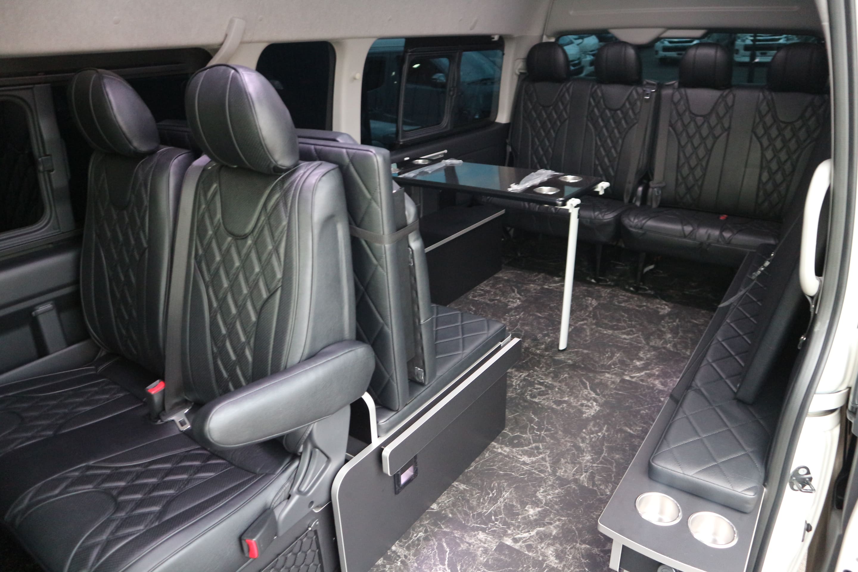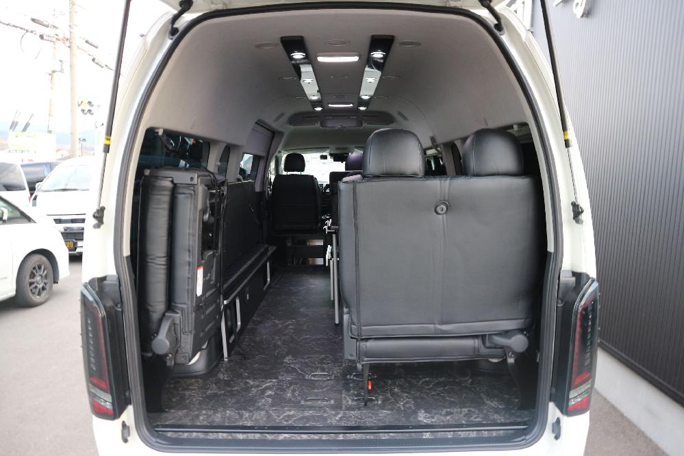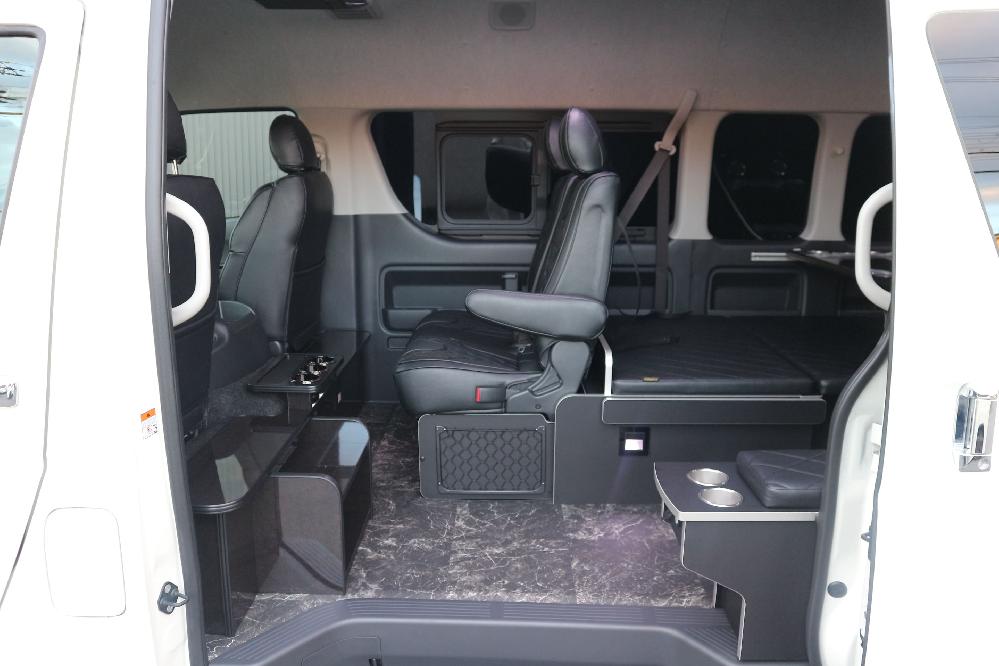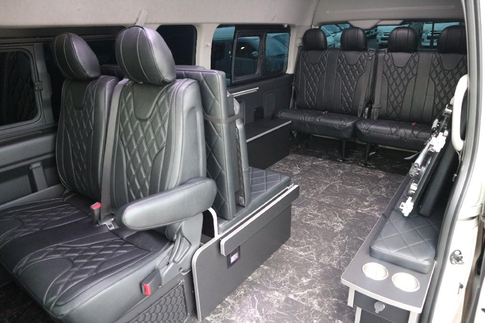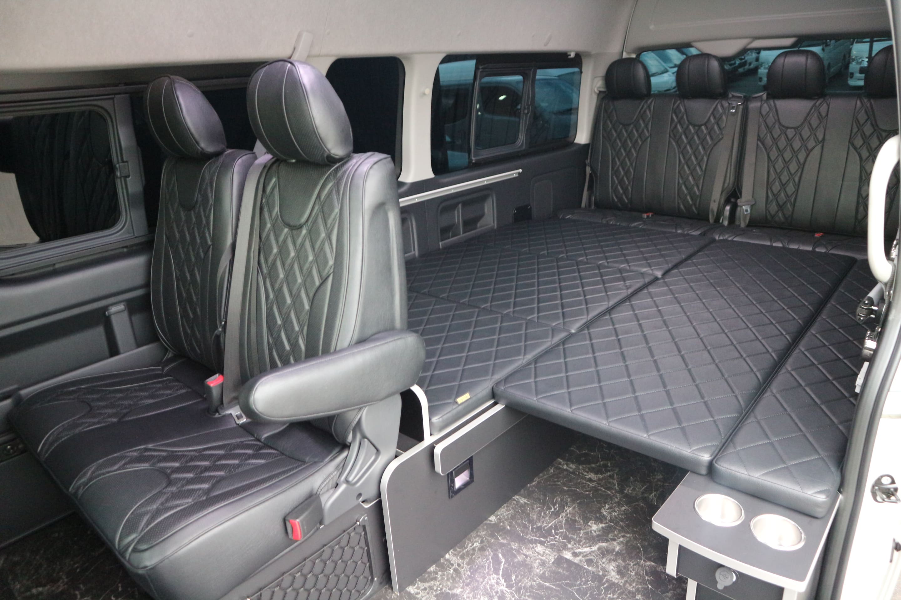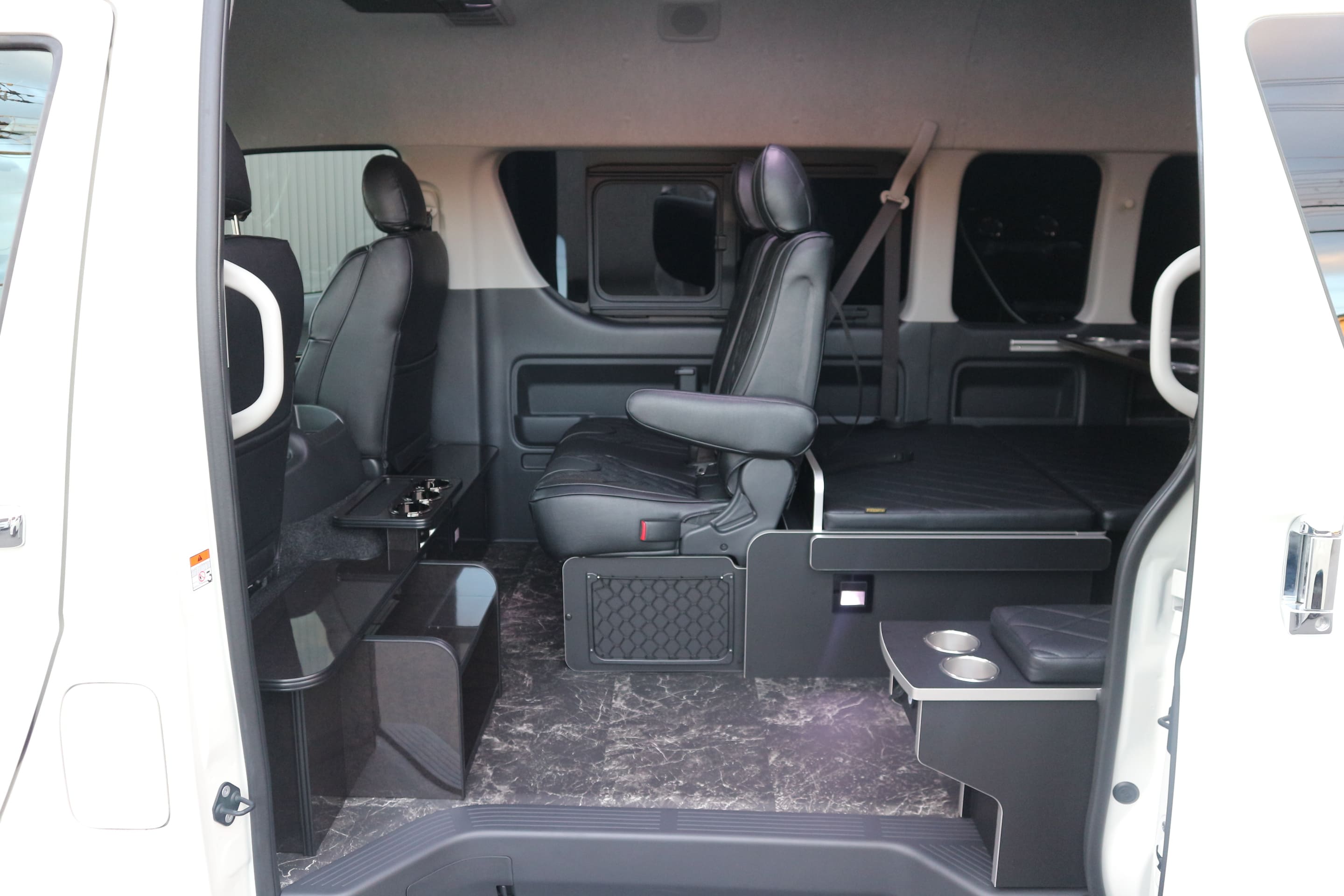 IF-WB8リビングサルーン 200系ハイエースコミューターGL スーパーロング 前向き8名後ろ向き2名10人乗り対面ラウンジベッド家具施工