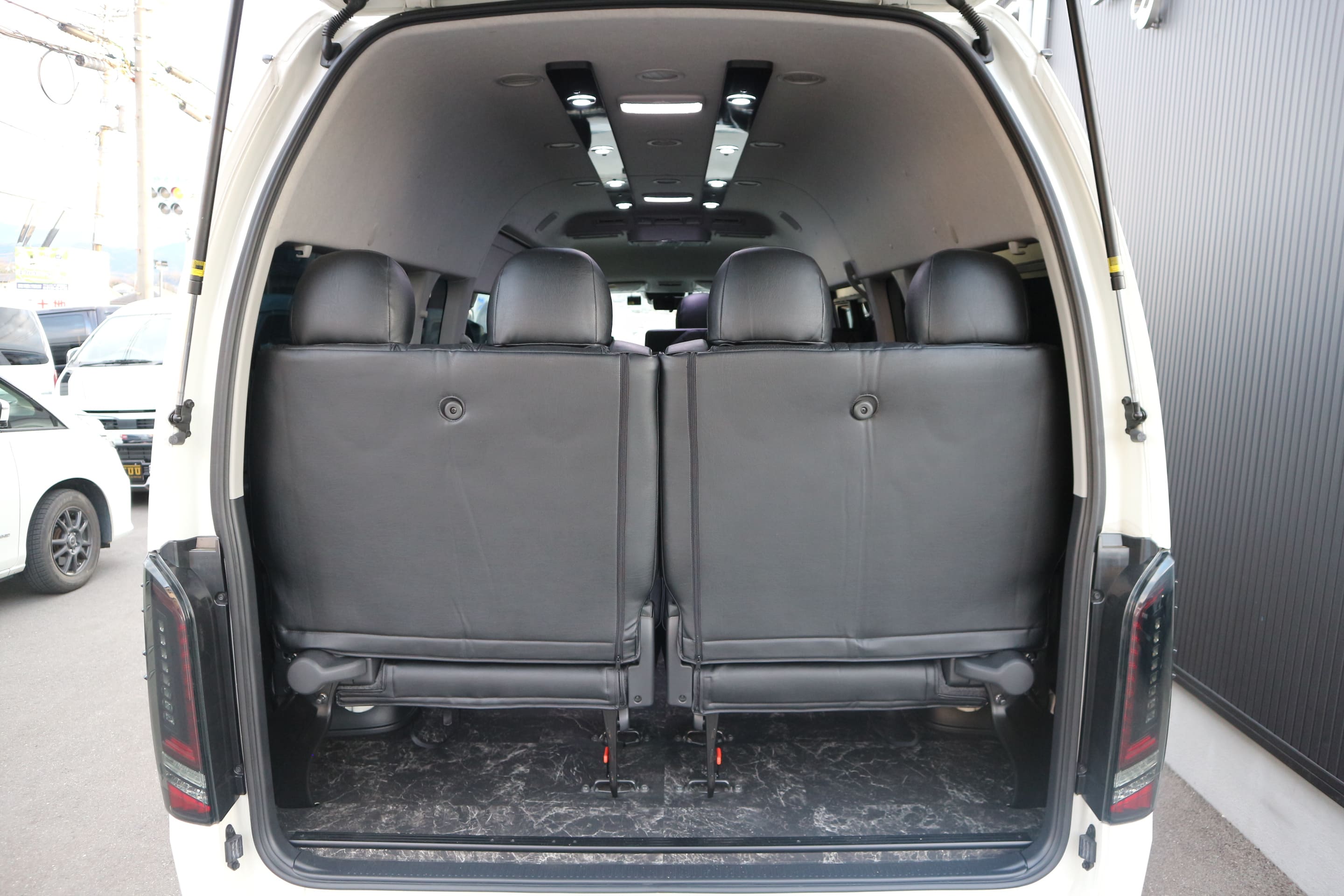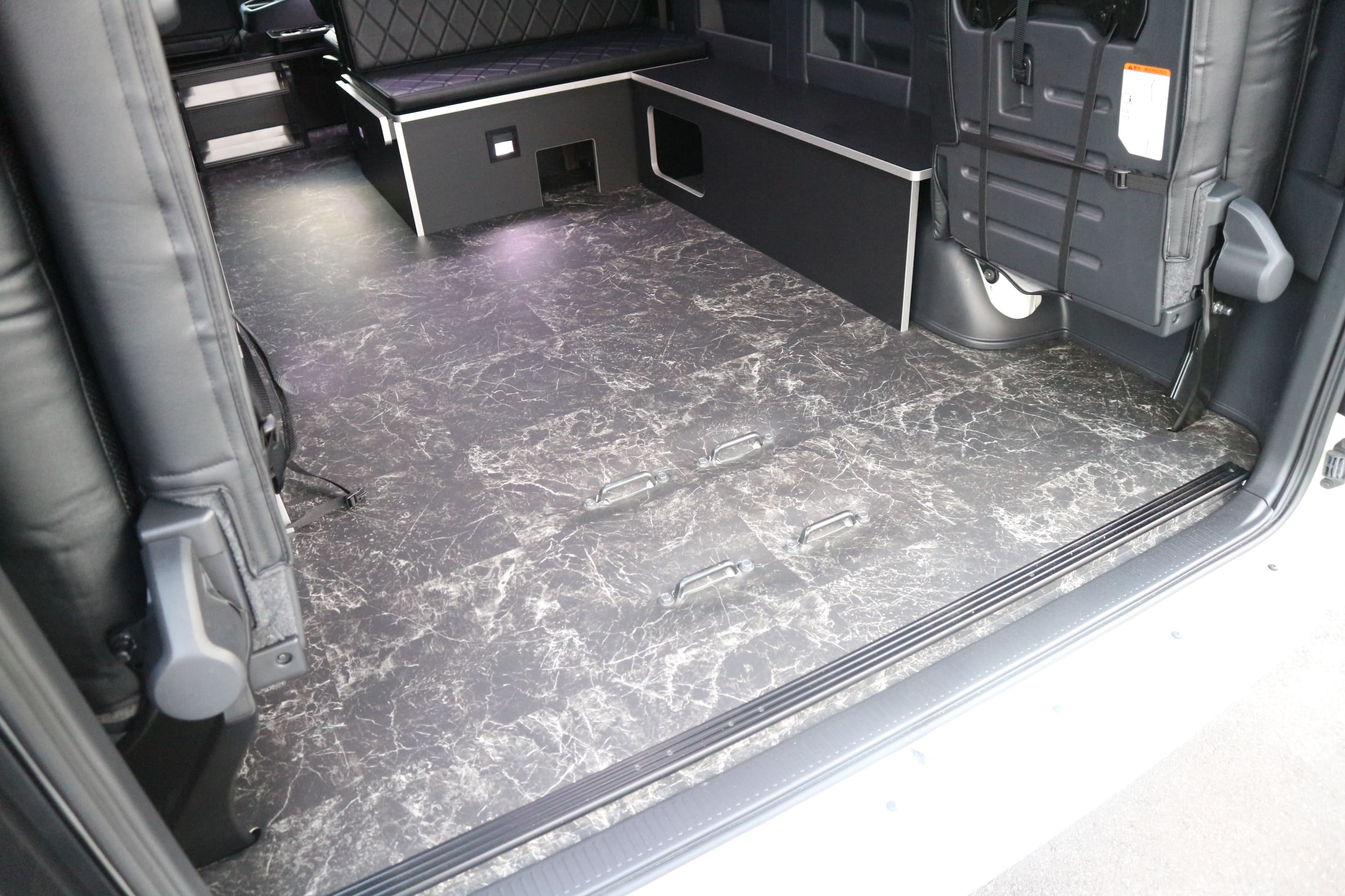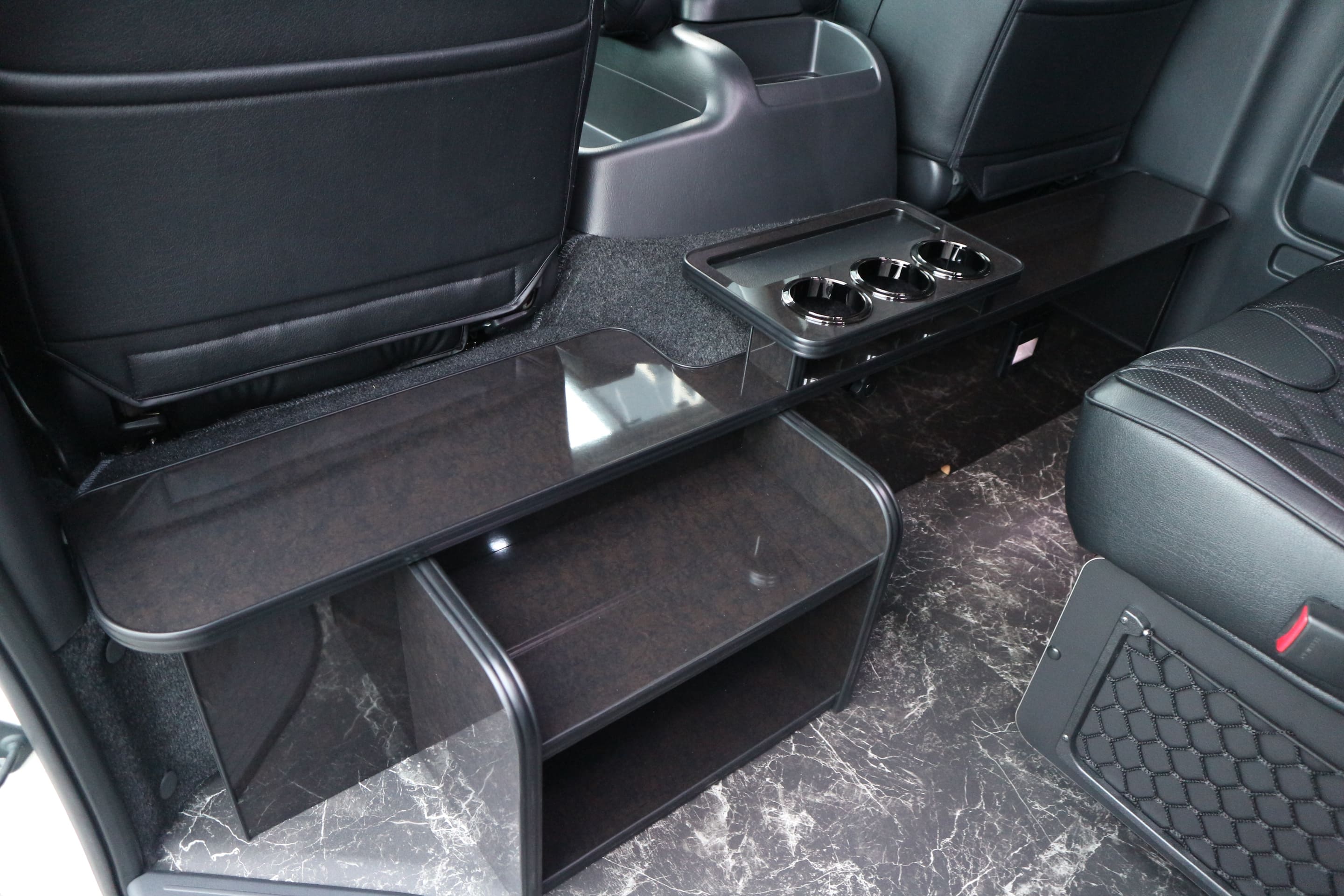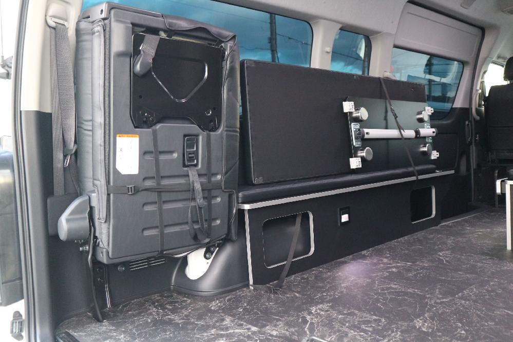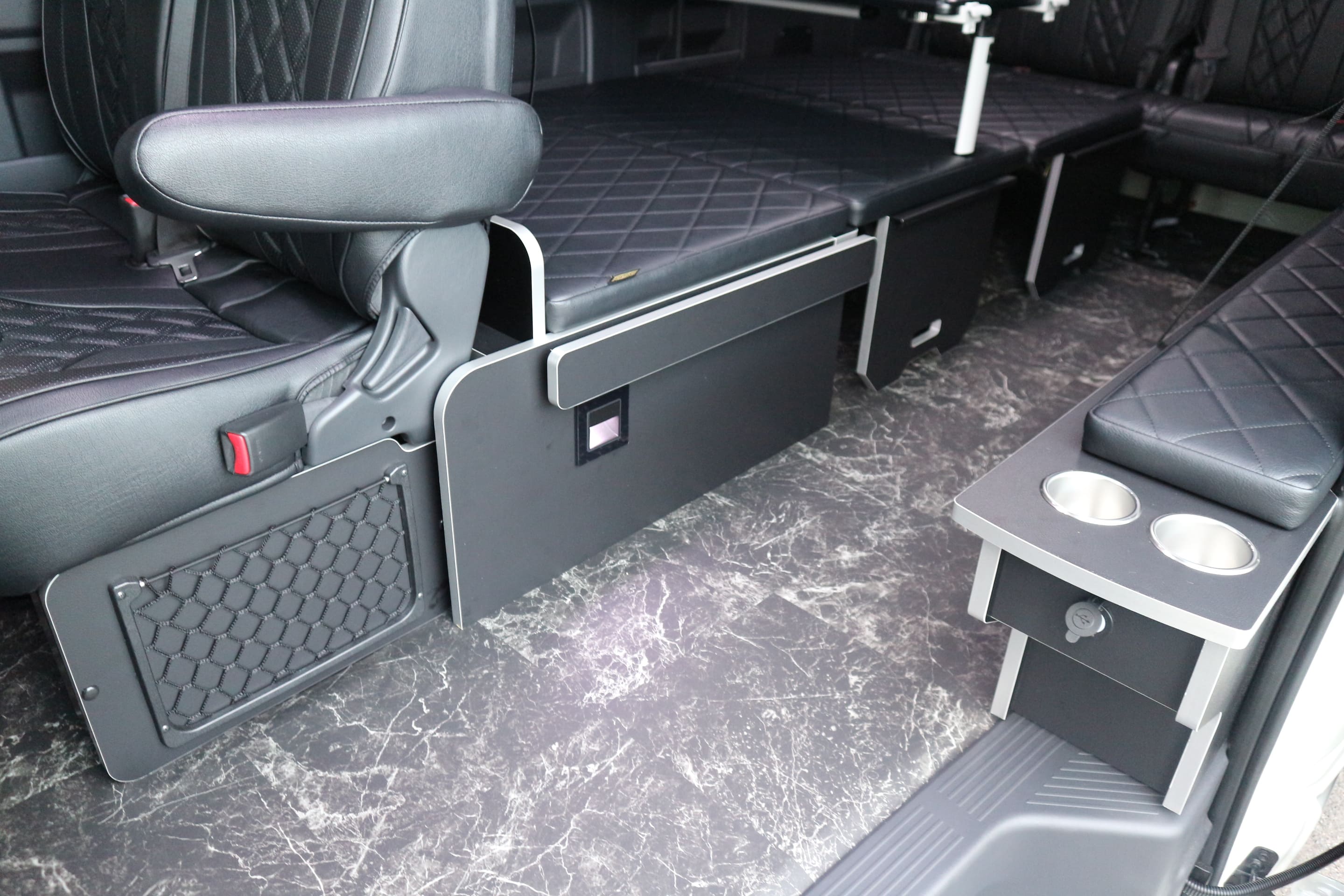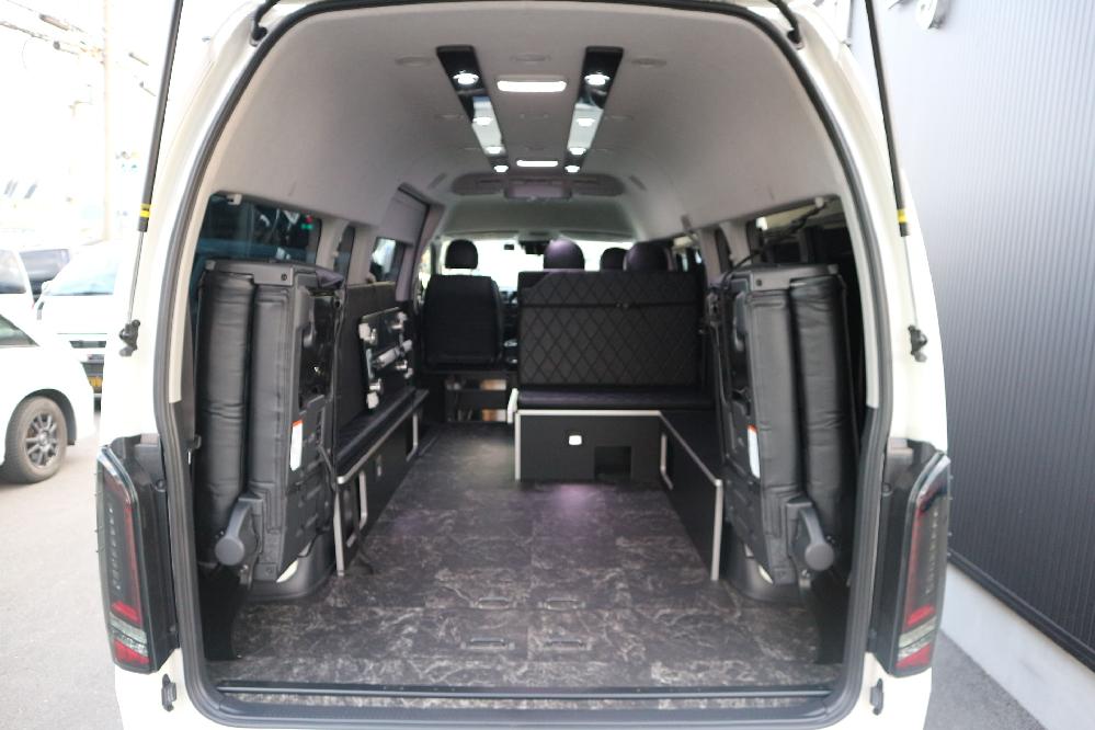IF-WB8リビングサルーン 200系ハイエースコミューターGL スーパーロング 前向き8名後ろ向き2名10人乗り対面ラウンジベッド家具施工
