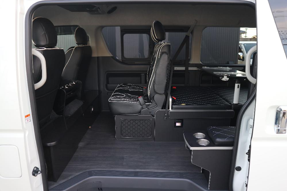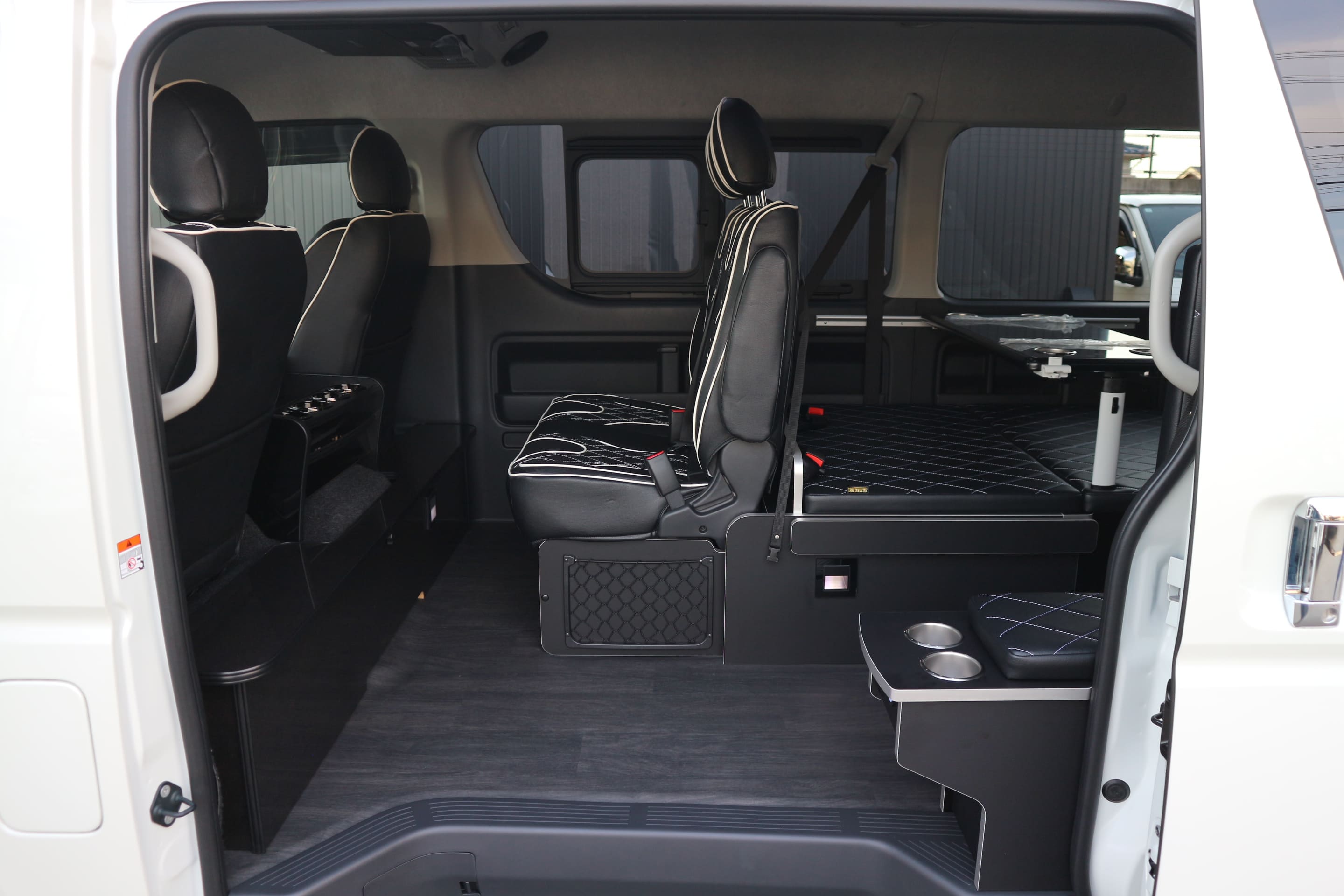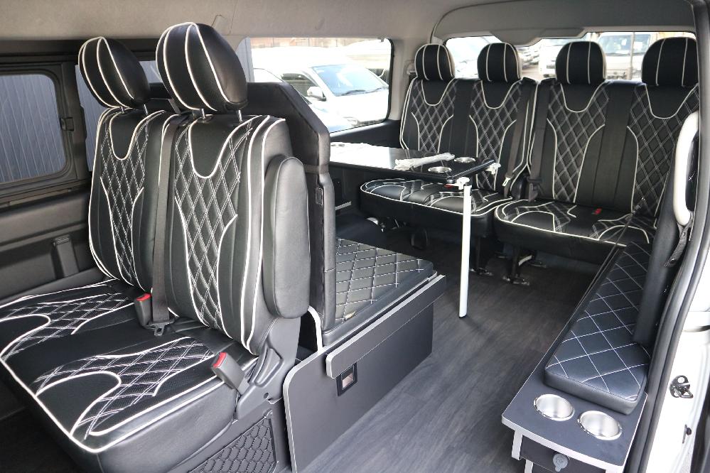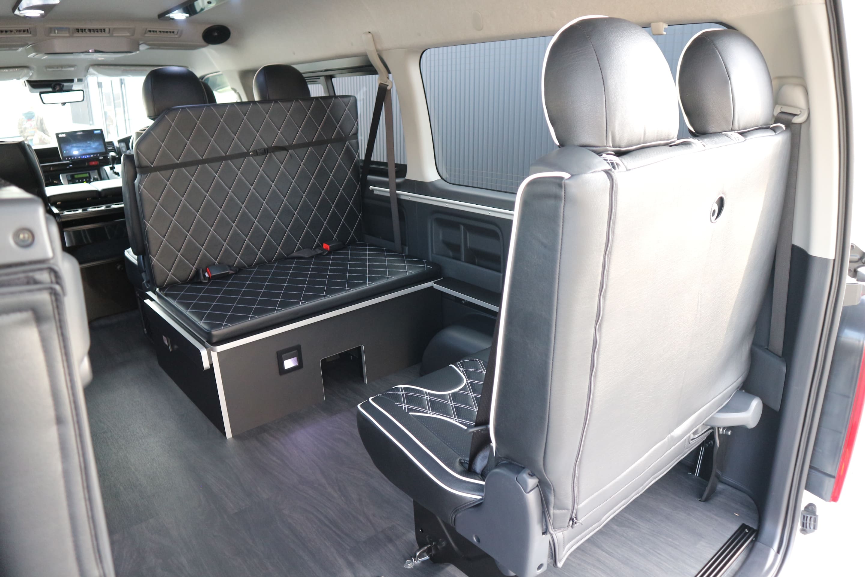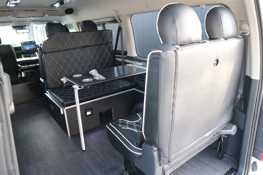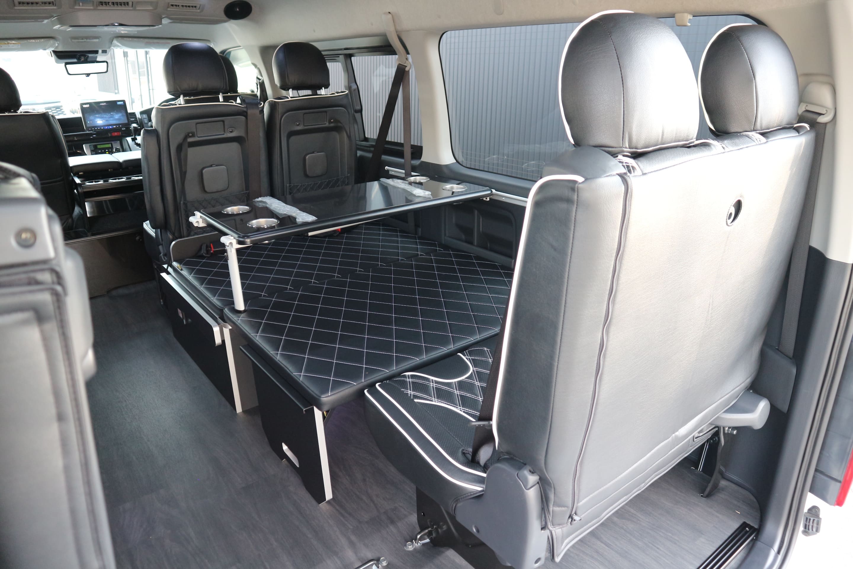 HOME > ギャラリー:IF-WB8 : ハイエースワゴンGL前向き8名後ろ向き2名10人乗り対面ラウンジベット家具 > IF-WB8リビングサルーン 200系ハイエースワゴンGL ワイドボディー 前向き8名後ろ向き2名10人乗り対面ラウンジベッド家具施工