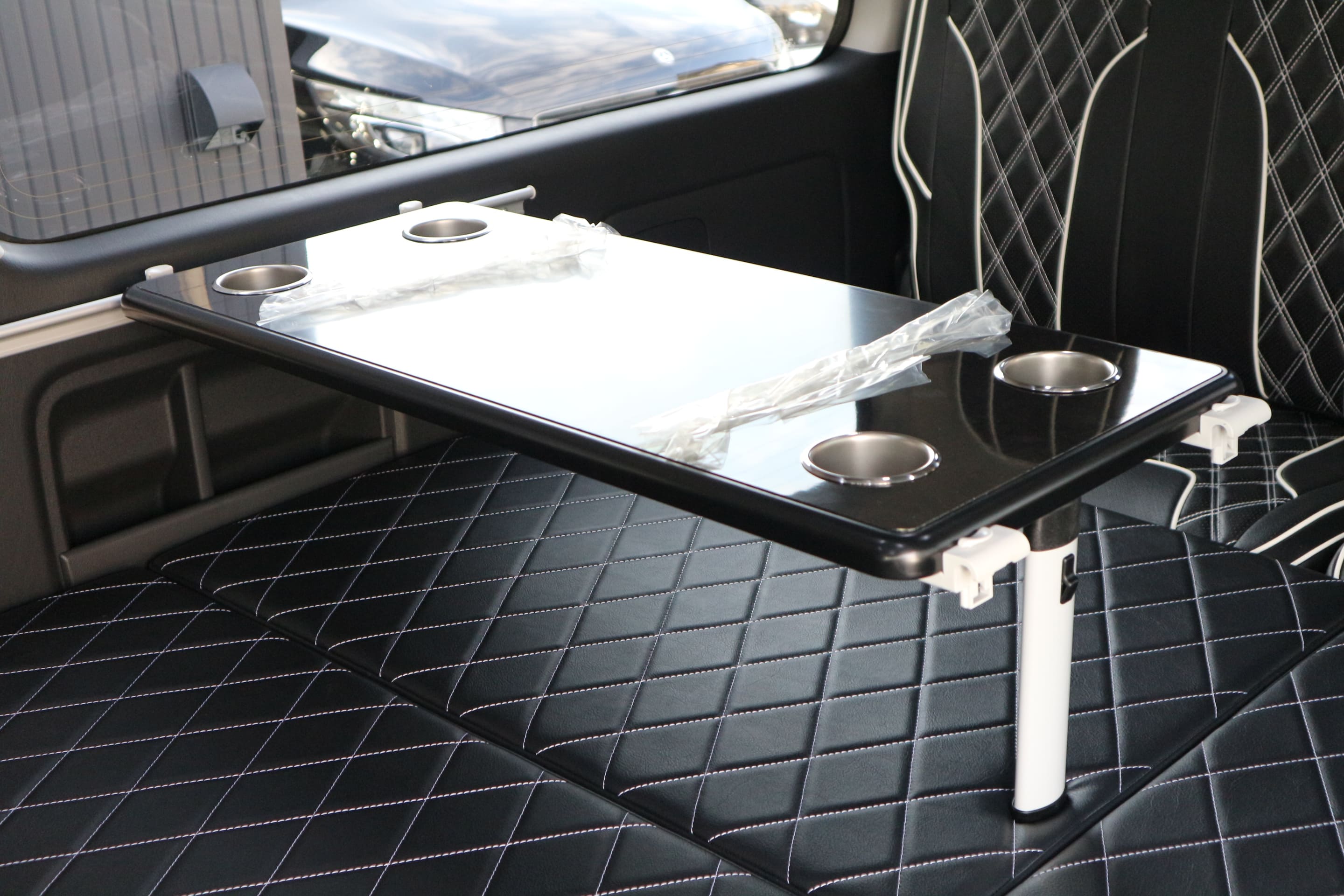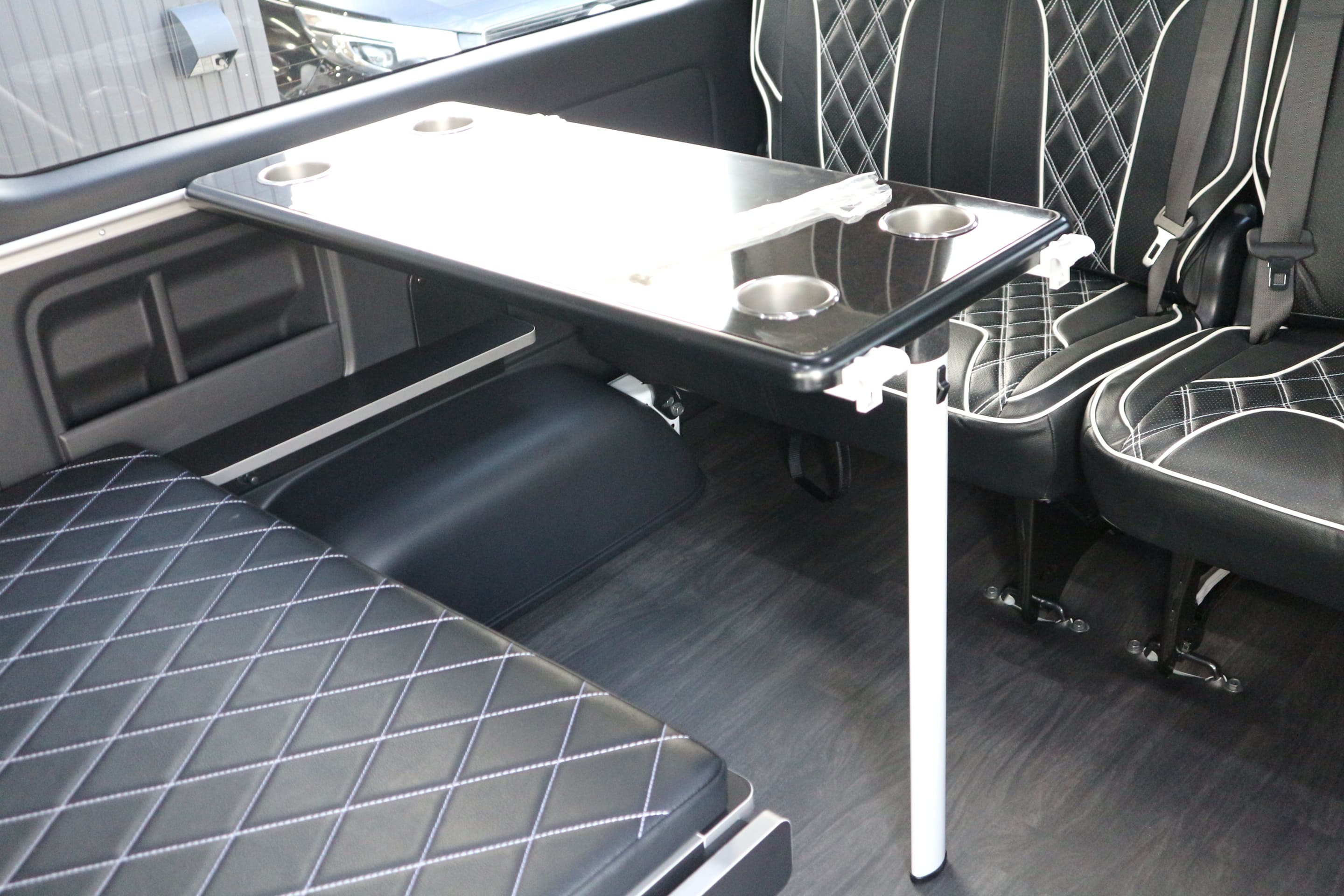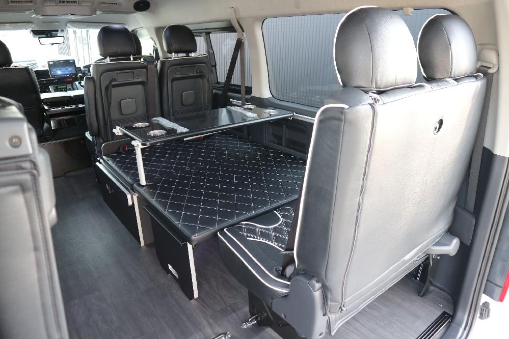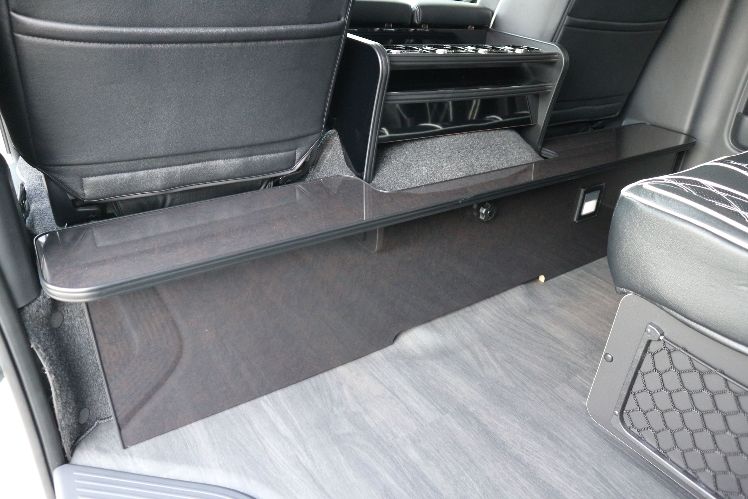 オプションサイドレールテーブル(ロングレッグ) 対面ラウンジ展開 2列目ワゴンGL純正2名シート 3列目ワゴンGL純正シート取り外し IF-WB8後ろ向き2名専用ベット家具 通路足下間接照明