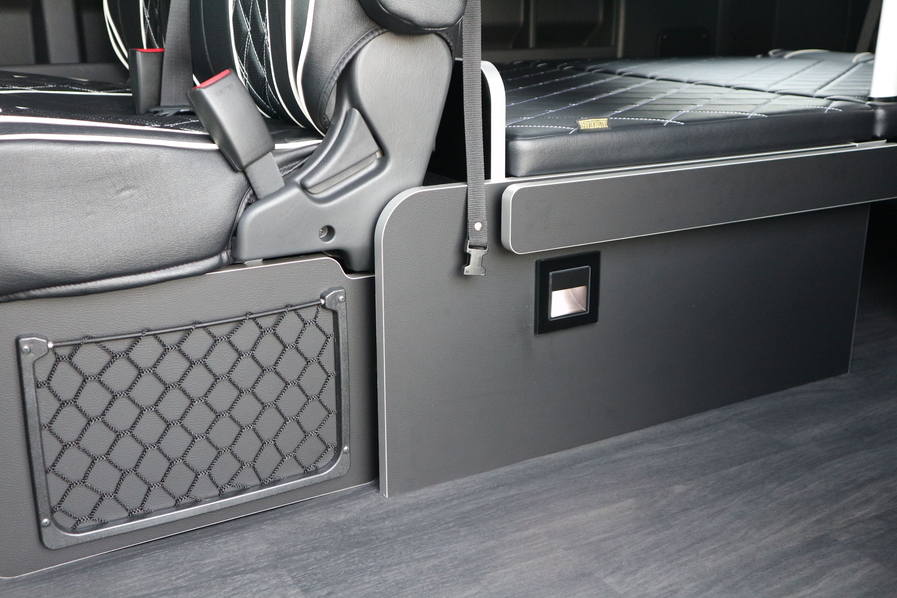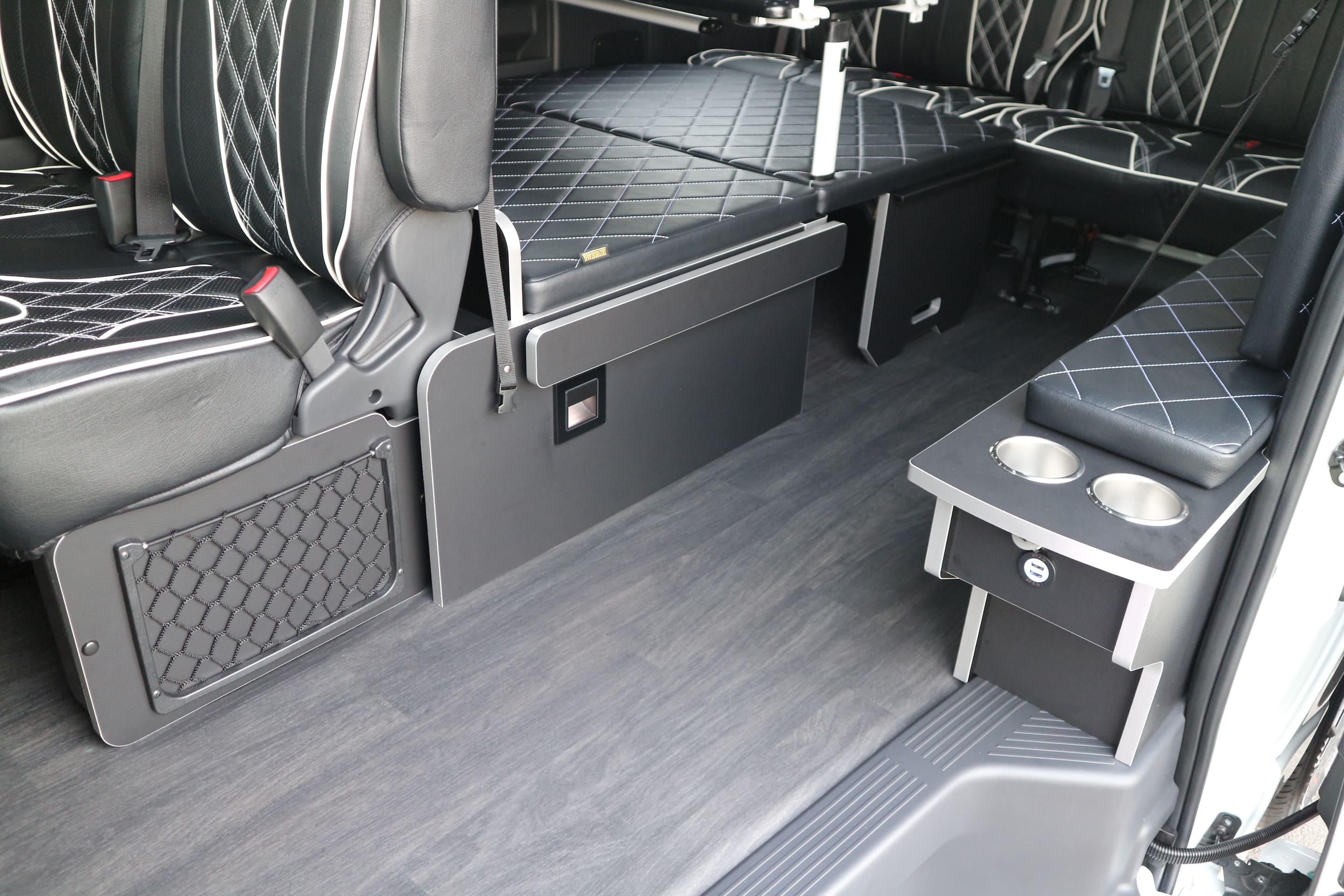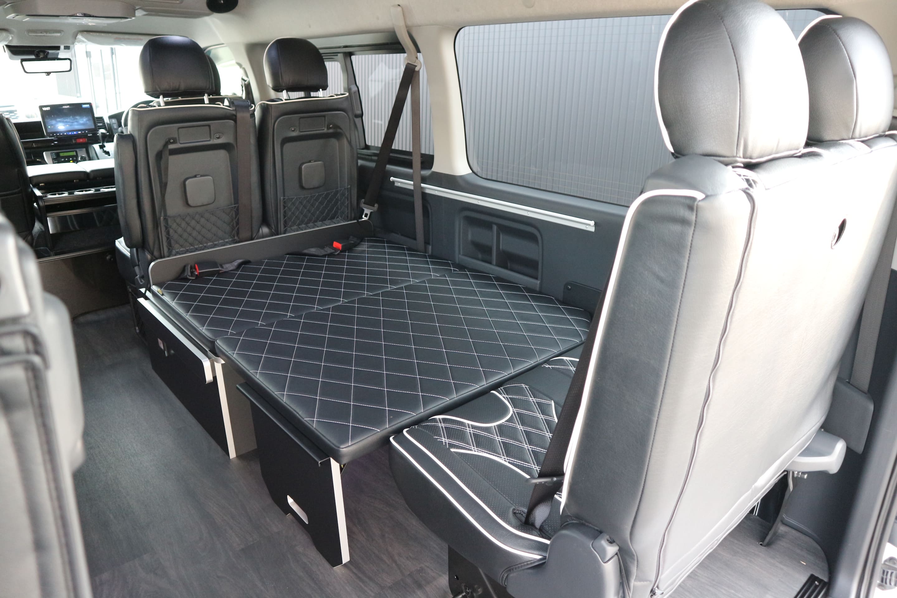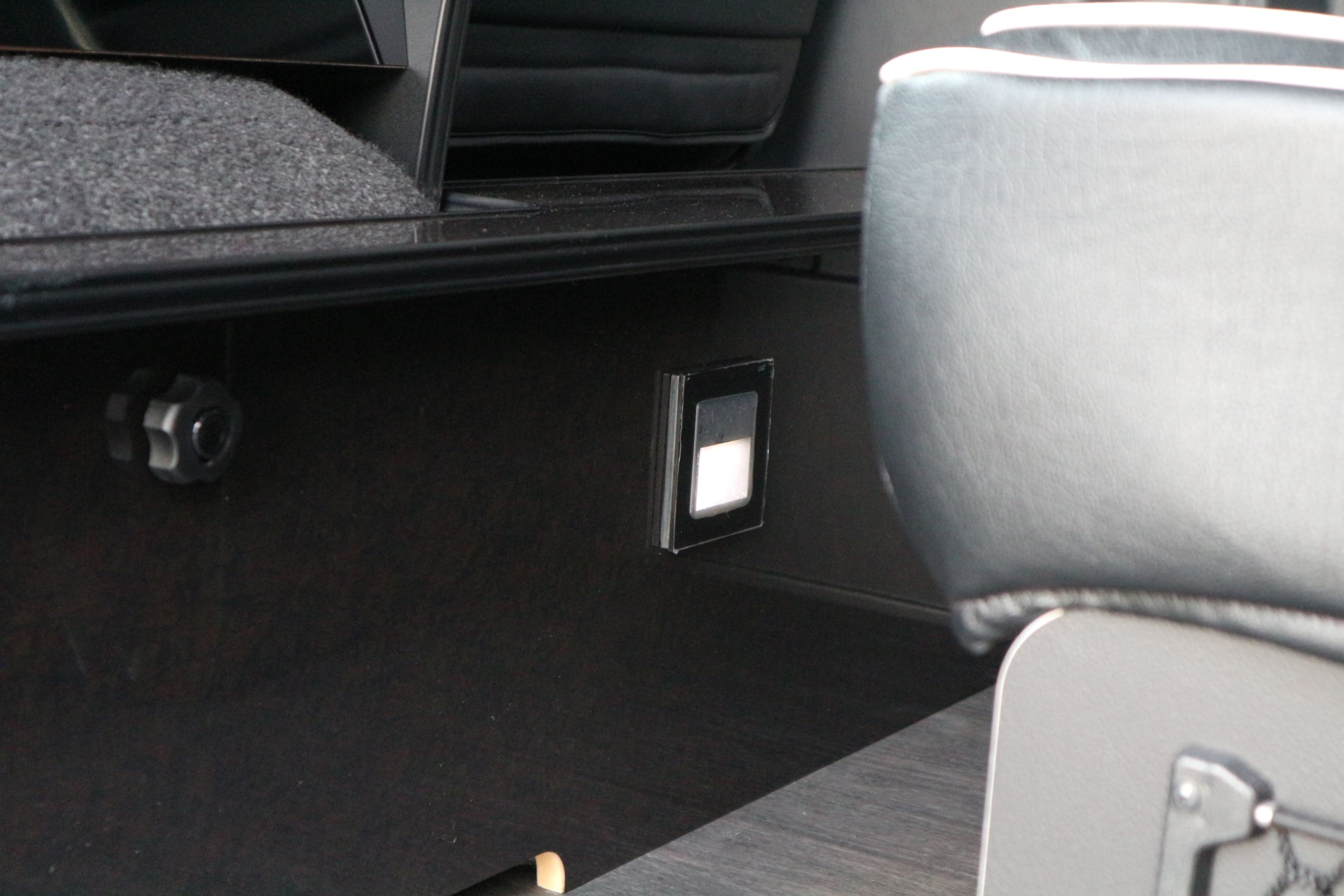 オプションサイドレールテーブル(ロングレッグ) 対面ラウンジ展開 2列目ワゴンGL純正2名シート 3列目ワゴンGL純正シート取り外し IF-WB8後ろ向き2名専用ベット家具 通路足下間接照明