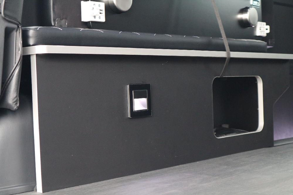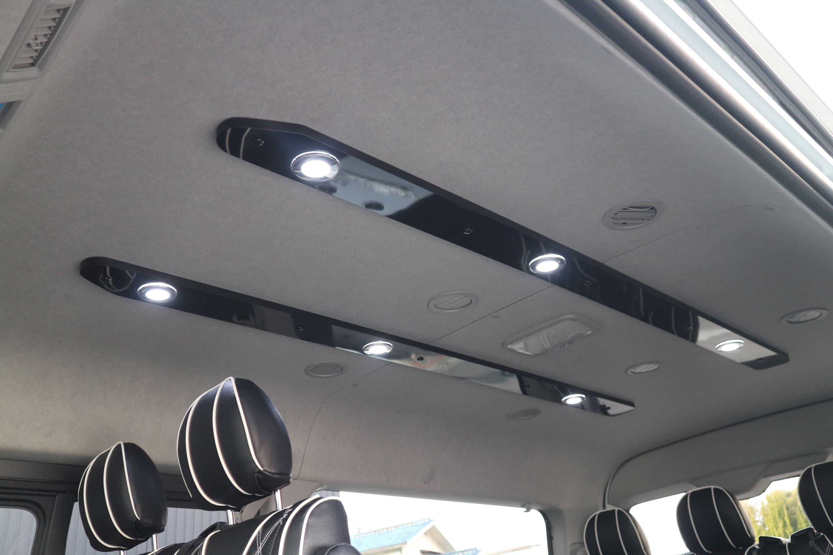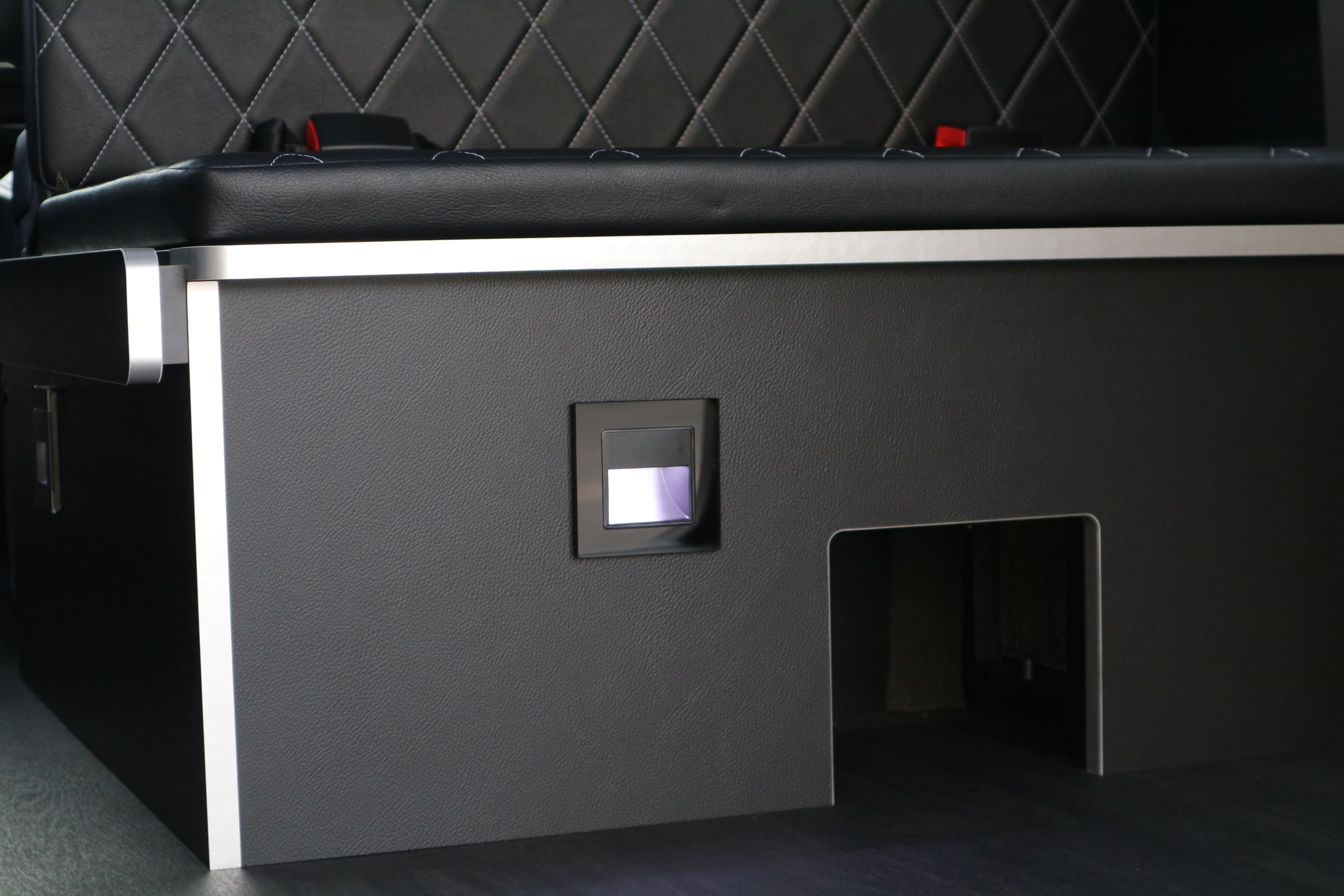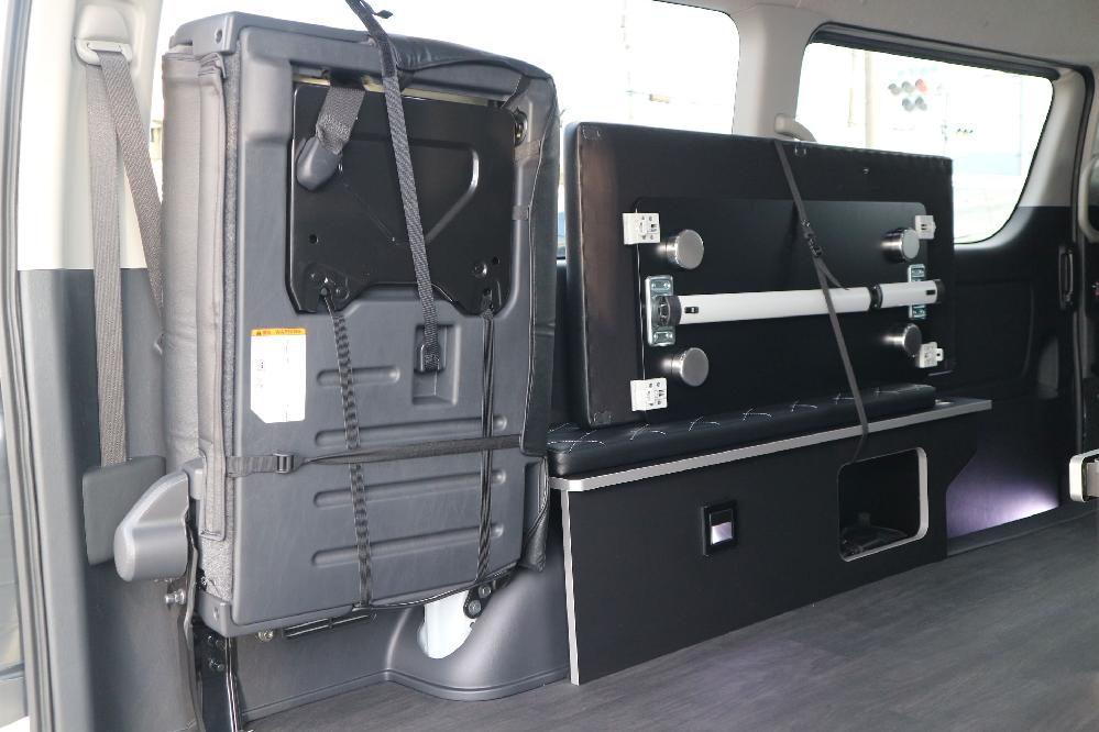 オプションサイドレールテーブル(ロングレッグ) 対面ラウンジ展開 2列目ワゴンGL純正2名シート 3列目ワゴンGL純正シート取り外し IF-WB8後ろ向き2名専用ベット家具 通路足下間接照明