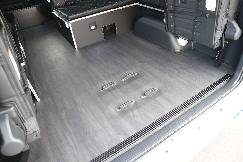 ワゴンGL純正4列目セパレート跳ね上げシート ラゲージスペース確保 フロアフローリング施工(SDR9166カリンクロ) スペアタイヤ取り出し出来ます。 フロアビス打ち無し 足下間接照明