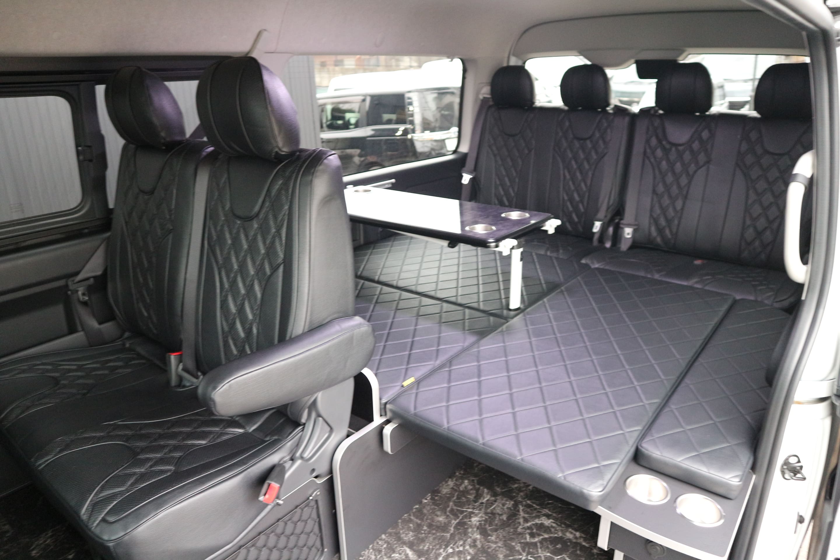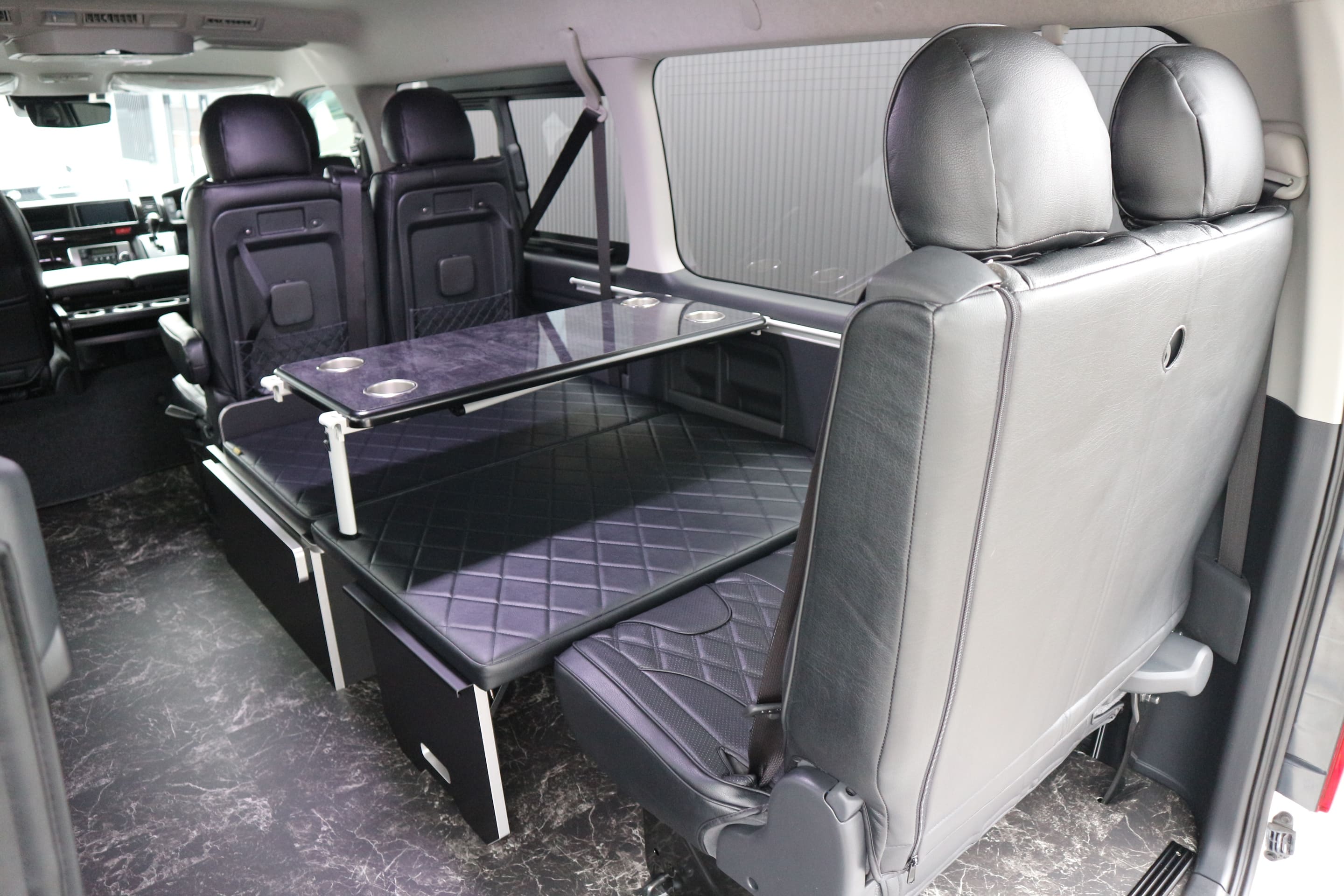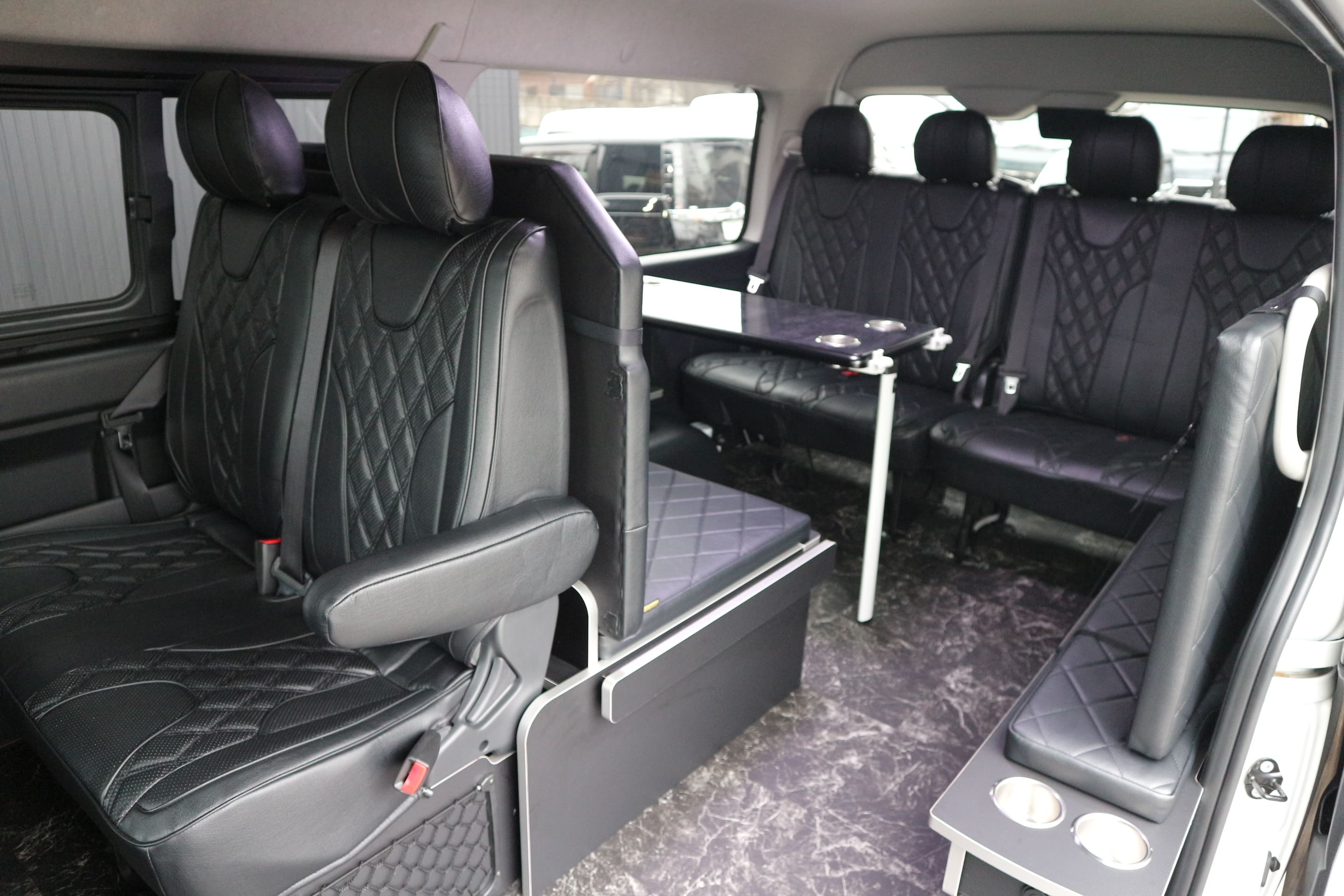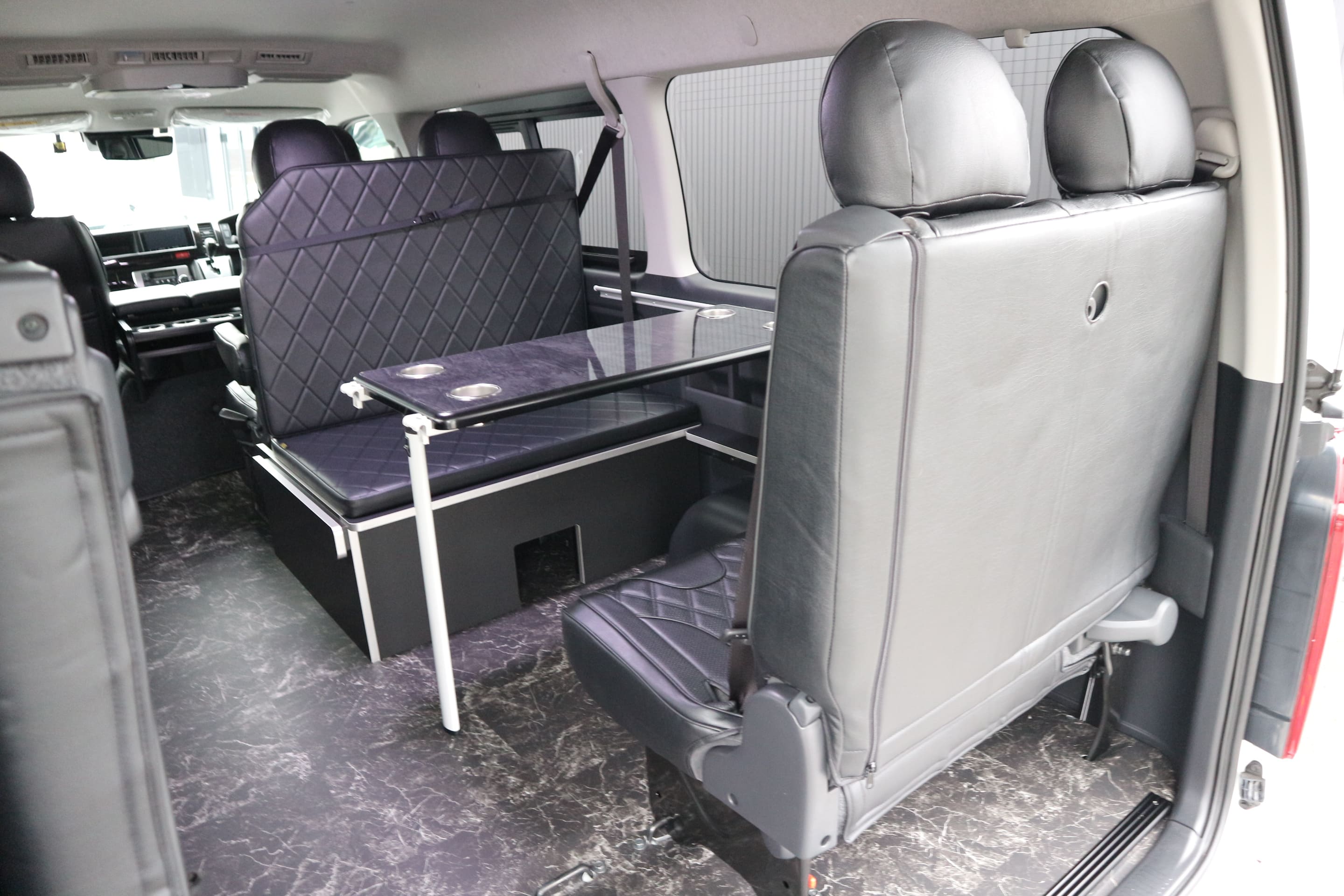 HOME > ギャラリー:IF-WB8 : ハイエースワゴンGL前向き8名後ろ向き2名10人乗り対面ラウンジベット家具 > IF-WB8 200系ハイエースワゴンGL ワイドボディー 前向き8名後ろ向き2名10人乗り対面ラウンジベッド家具施工