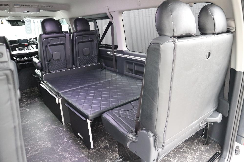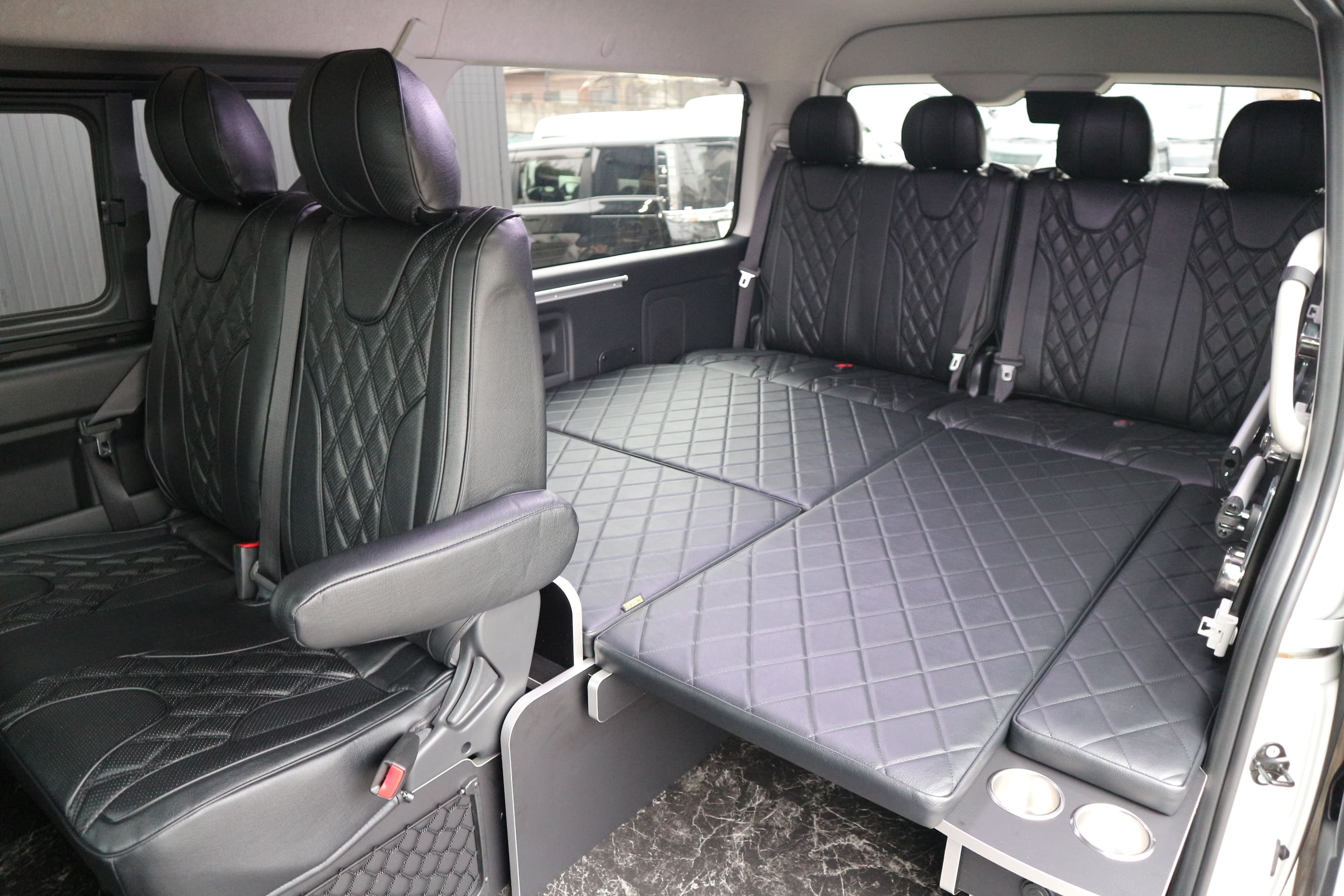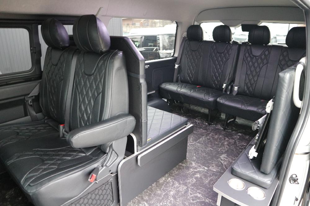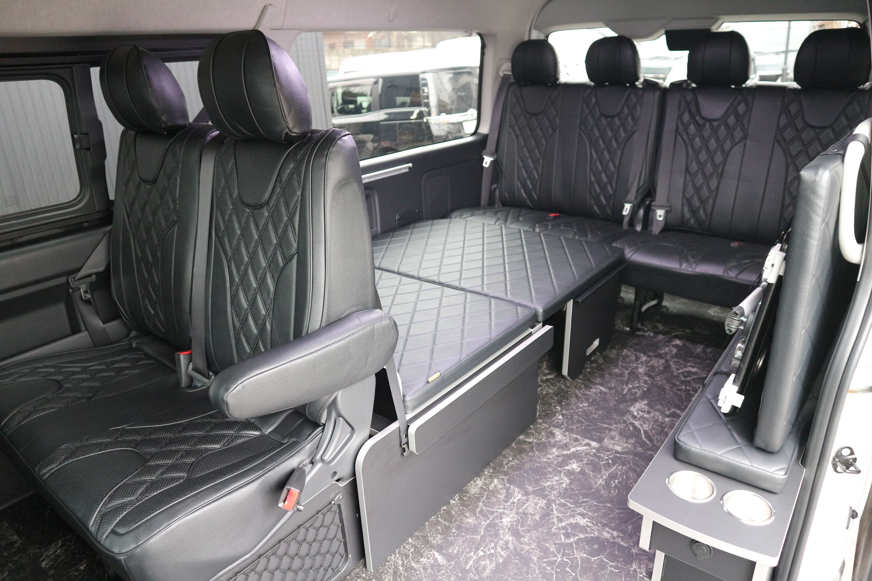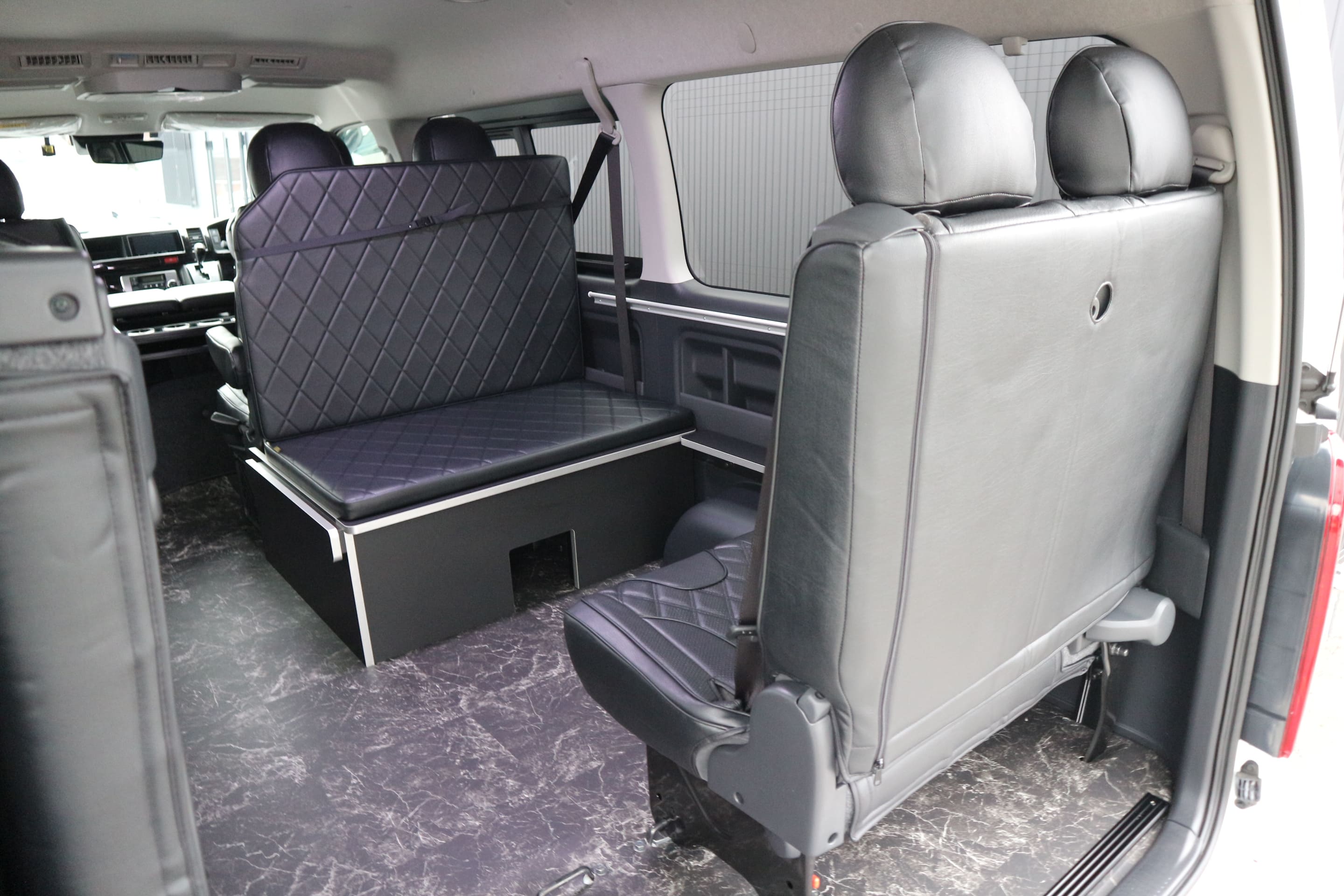 HOME > ギャラリー:IF-WB8 : ハイエースワゴンGL前向き8名後ろ向き2名10人乗り対面ラウンジベット家具 > IF-WB8 200系ハイエースワゴンGL ワイドボディー 前向き8名後ろ向き2名10人乗り対面ラウンジベッド家具施工