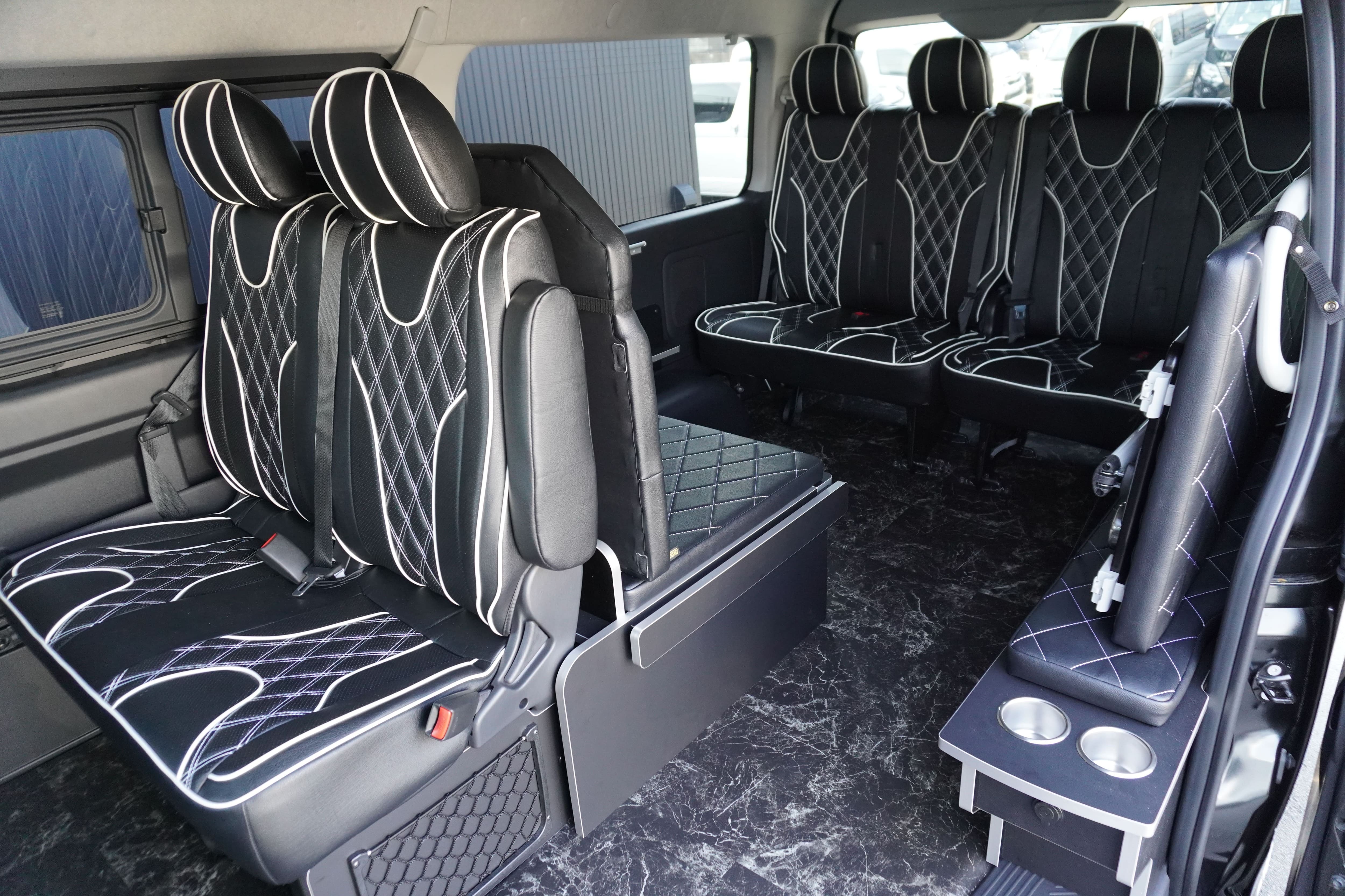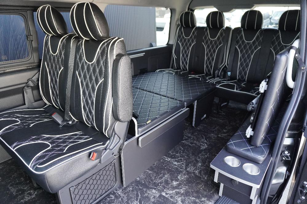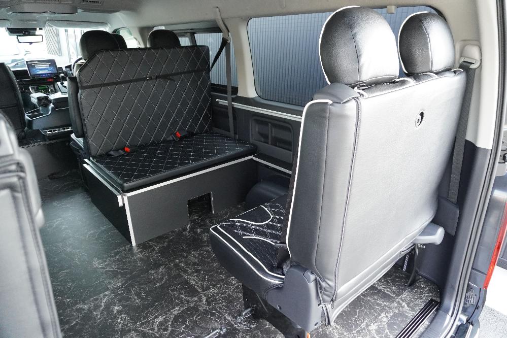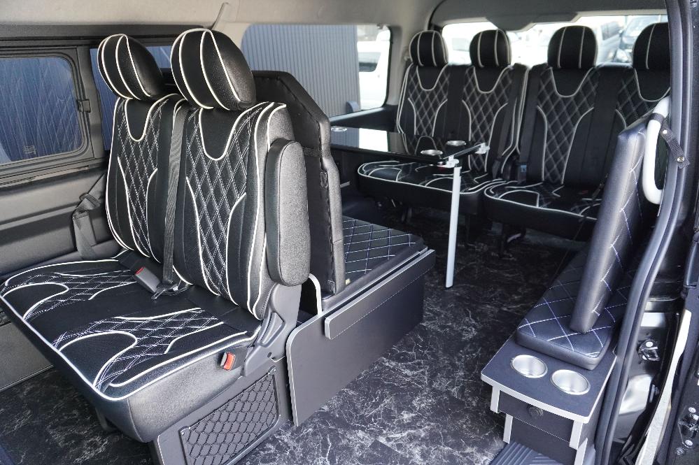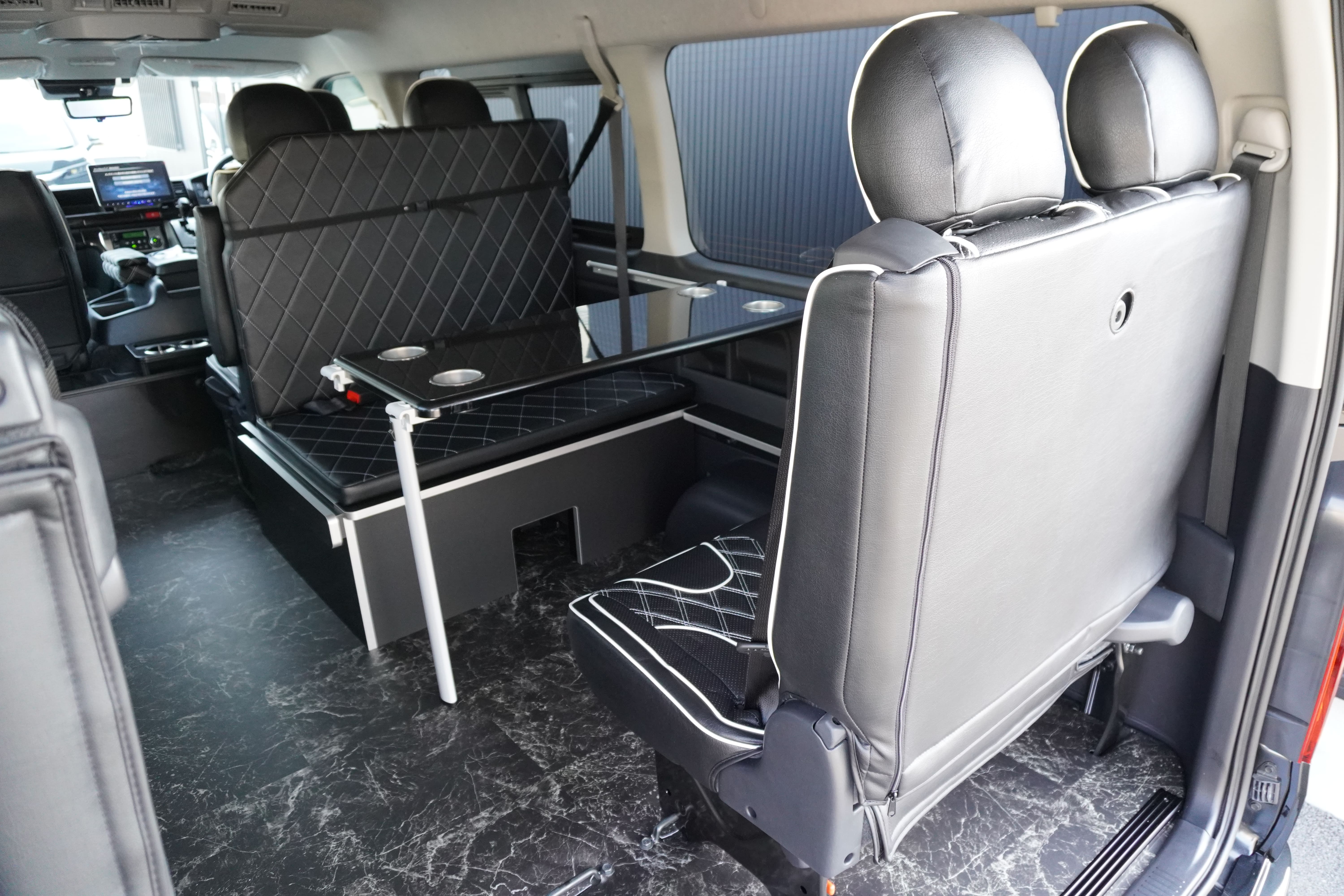 HOME > ギャラリー:IF-WB8 : ハイエースワゴンGL前向き8名後ろ向き2名10人乗り対面ラウンジベット家具 > IF-WB8 200系ハイエースワゴンGL ワイドボディー 前向き8名後ろ向き2名10人乗り対面ラウンジベッド家具施工