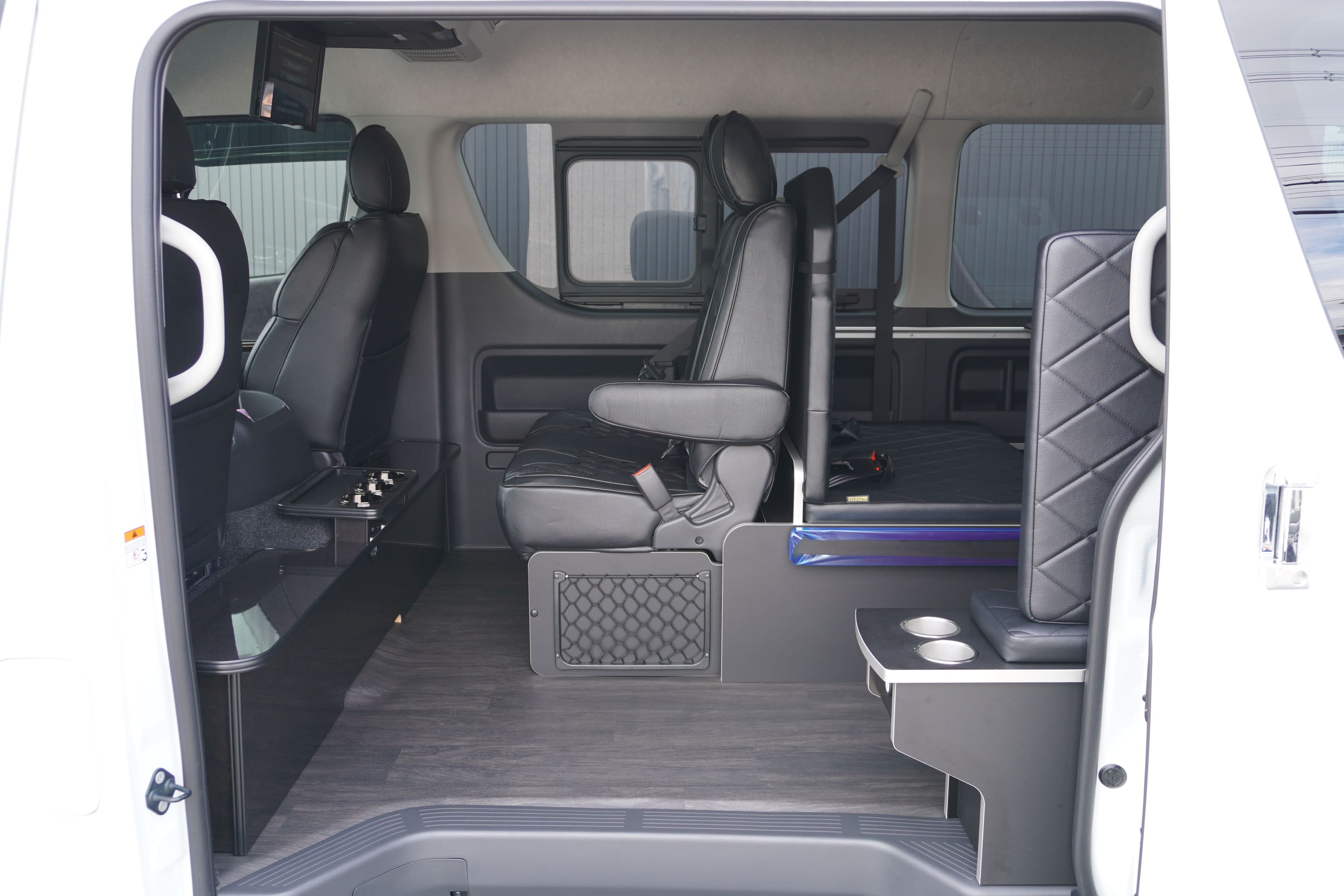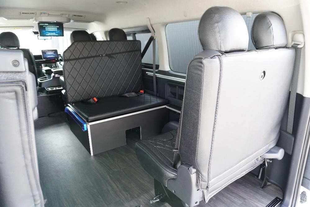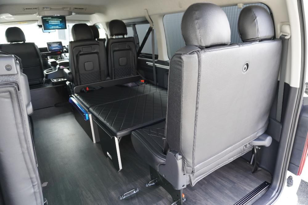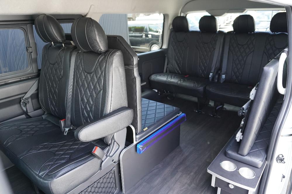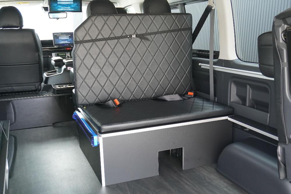 HOME > ギャラリー:IF-WB8 : ハイエースワゴンGL前向き8名後ろ向き2名10人乗り対面ラウンジベット家具 > IF-WB8 200系ハイエースワゴンGL ワイドボディー 前向き8名後ろ向き2名10人乗り対面ラウンジベッド家具施工