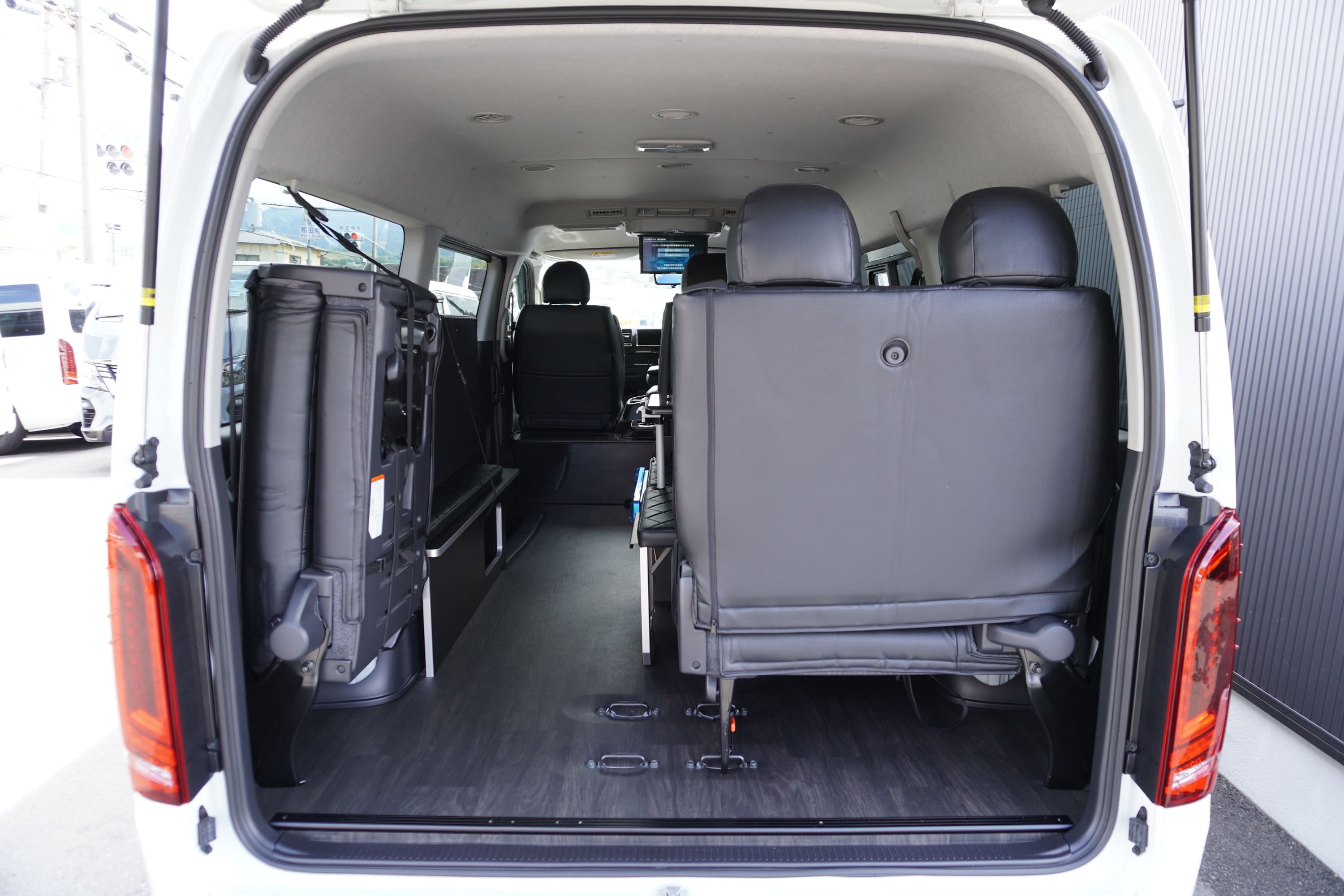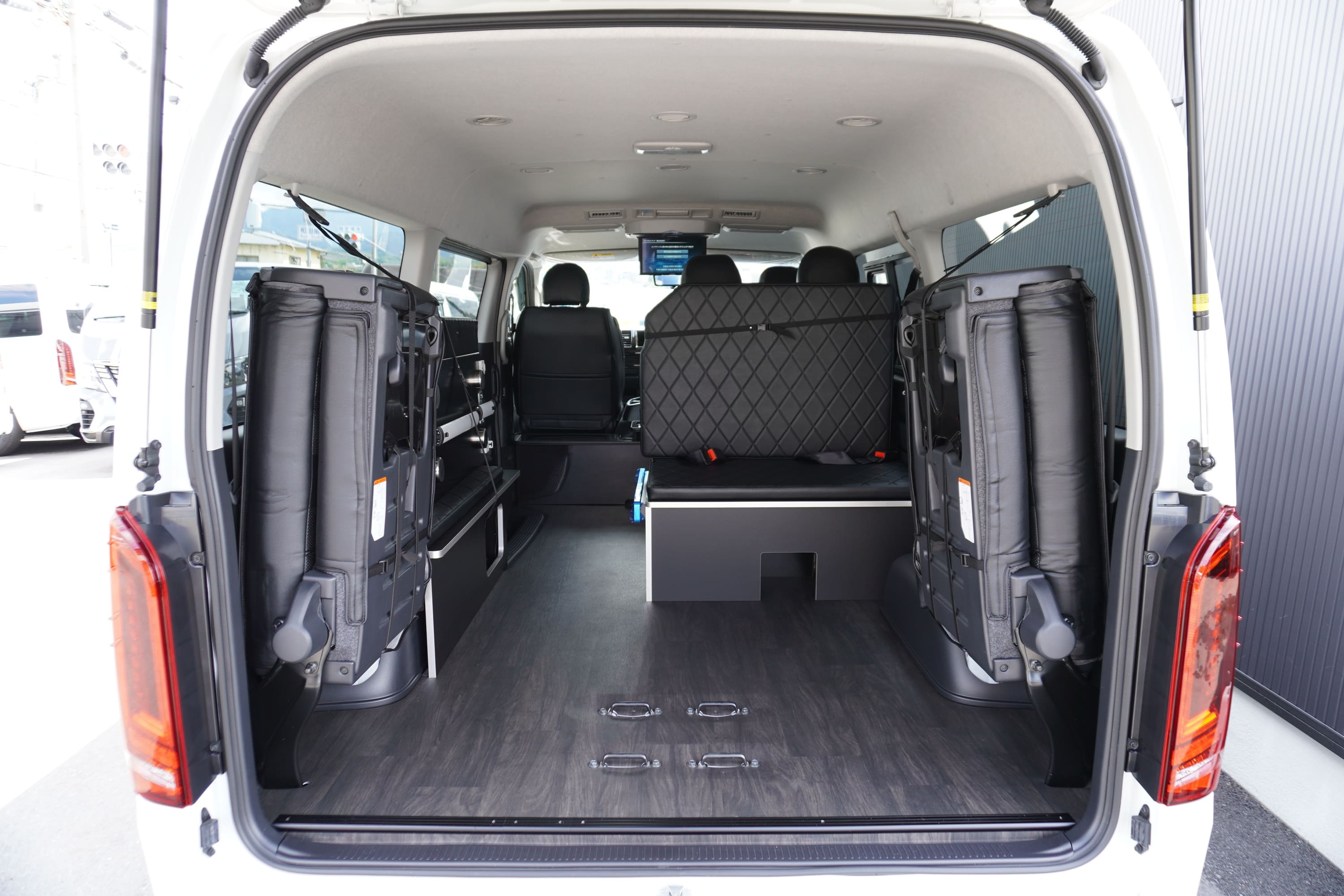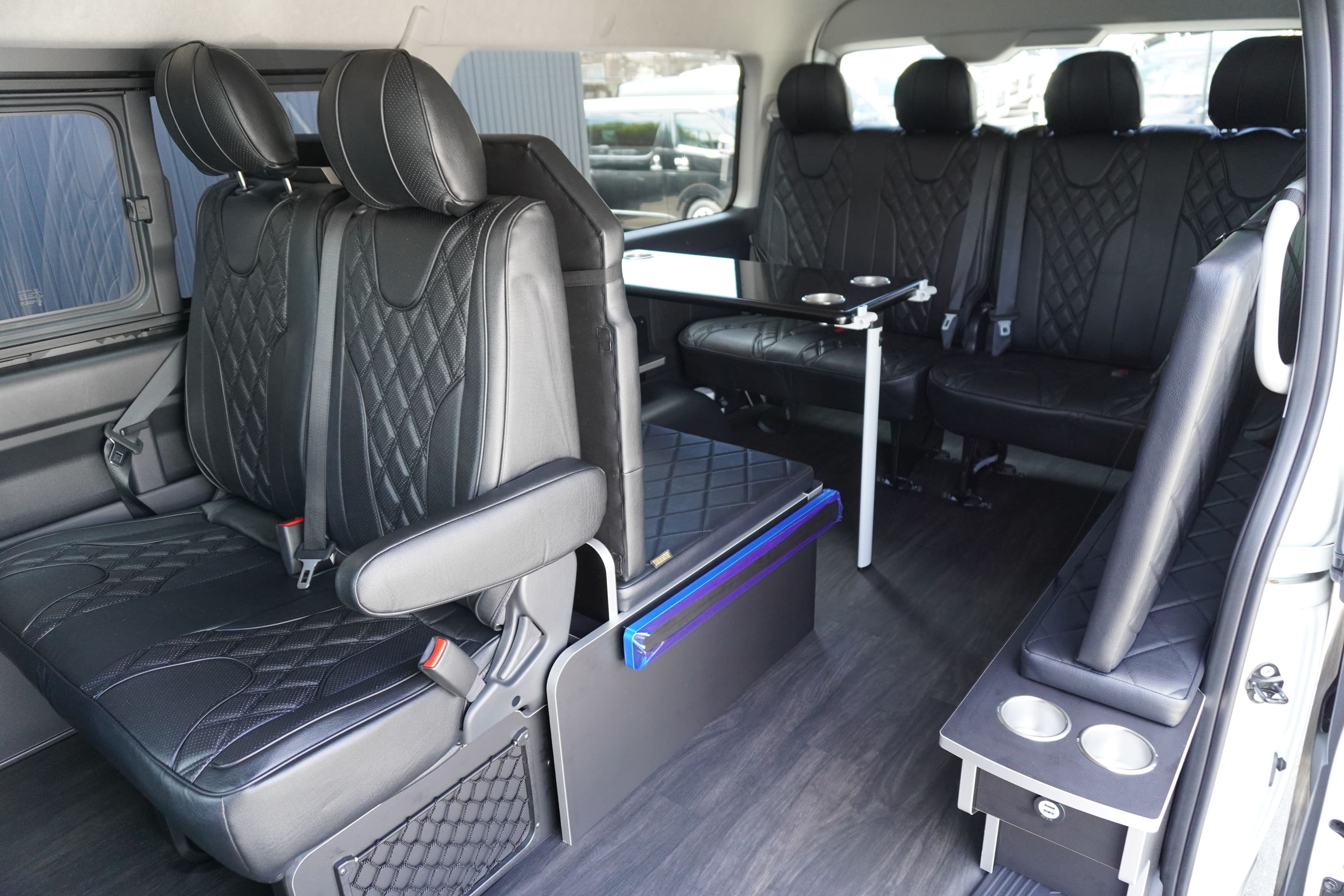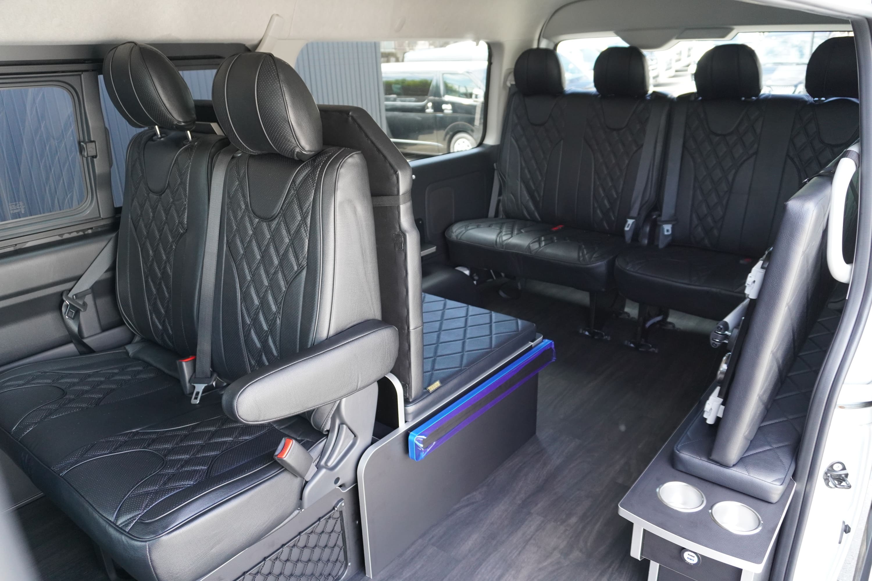 HOME > ギャラリー:IF-WB8 : ハイエースワゴンGL前向き8名後ろ向き2名10人乗り対面ラウンジベット家具 > IF-WB8 200系ハイエースワゴンGL ワイドボディー 前向き8名後ろ向き2名10人乗り対面ラウンジベッド家具施工