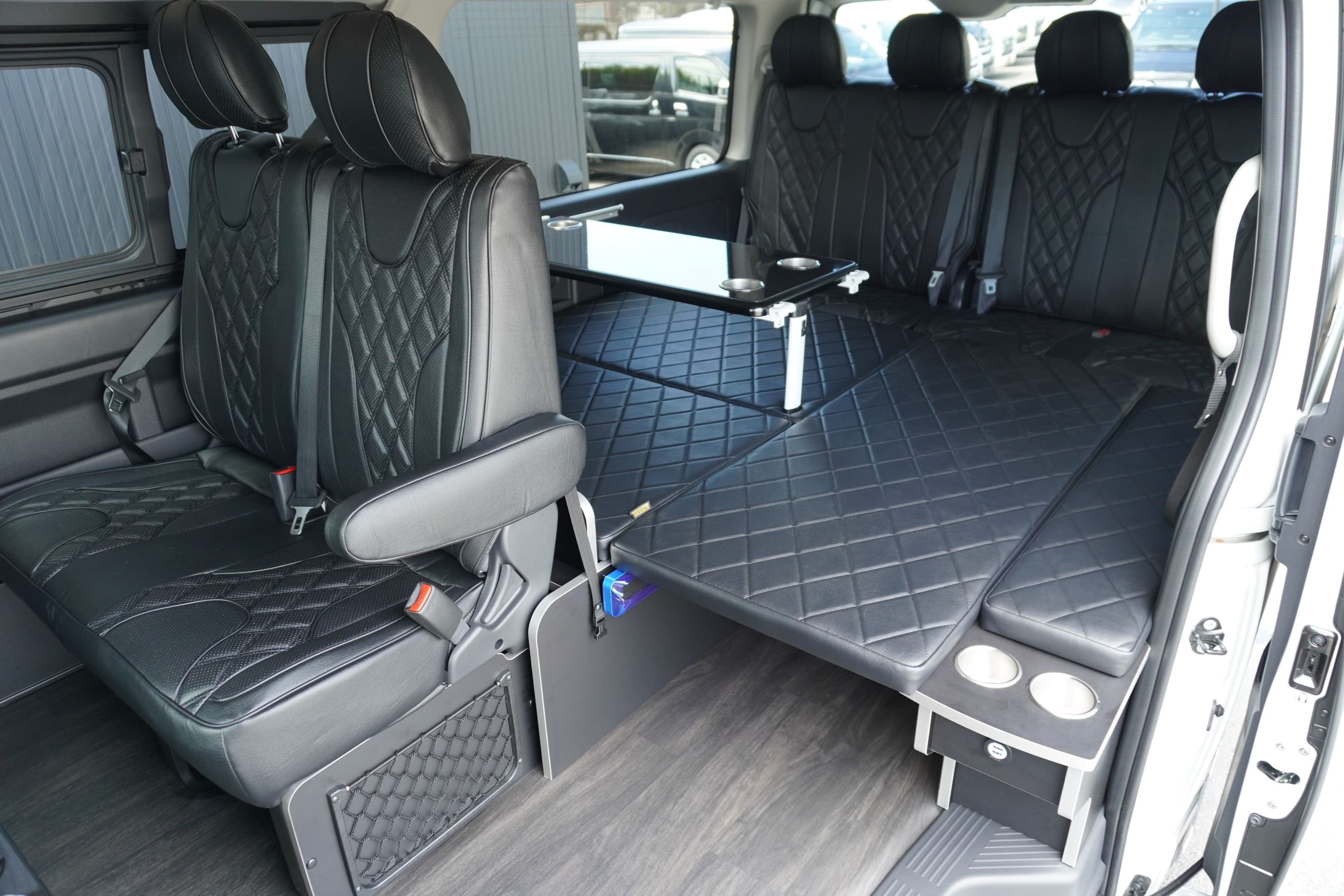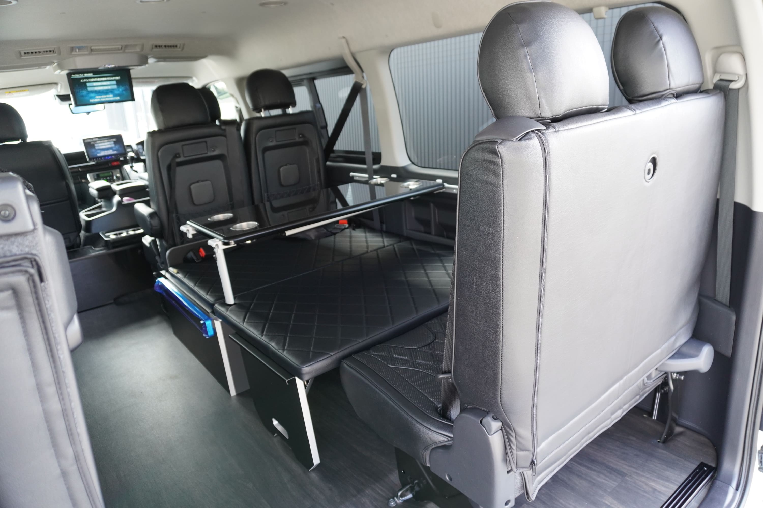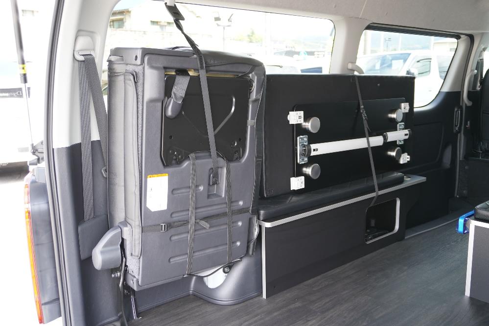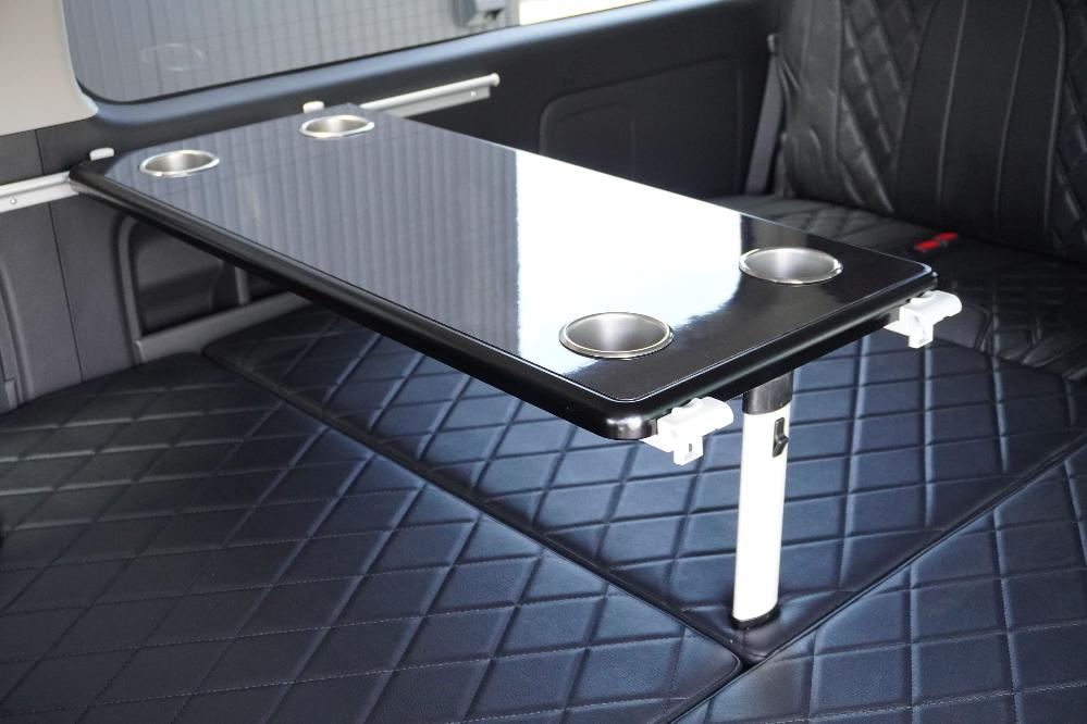 オプションサイドレールテーブル(ロングレッグ) 対面ラウンジ展開 2列目ワゴンGL純正2名シート 3列目ワゴンGL純正シート取り外し IF-WB8後ろ向き2名専用ベット家具