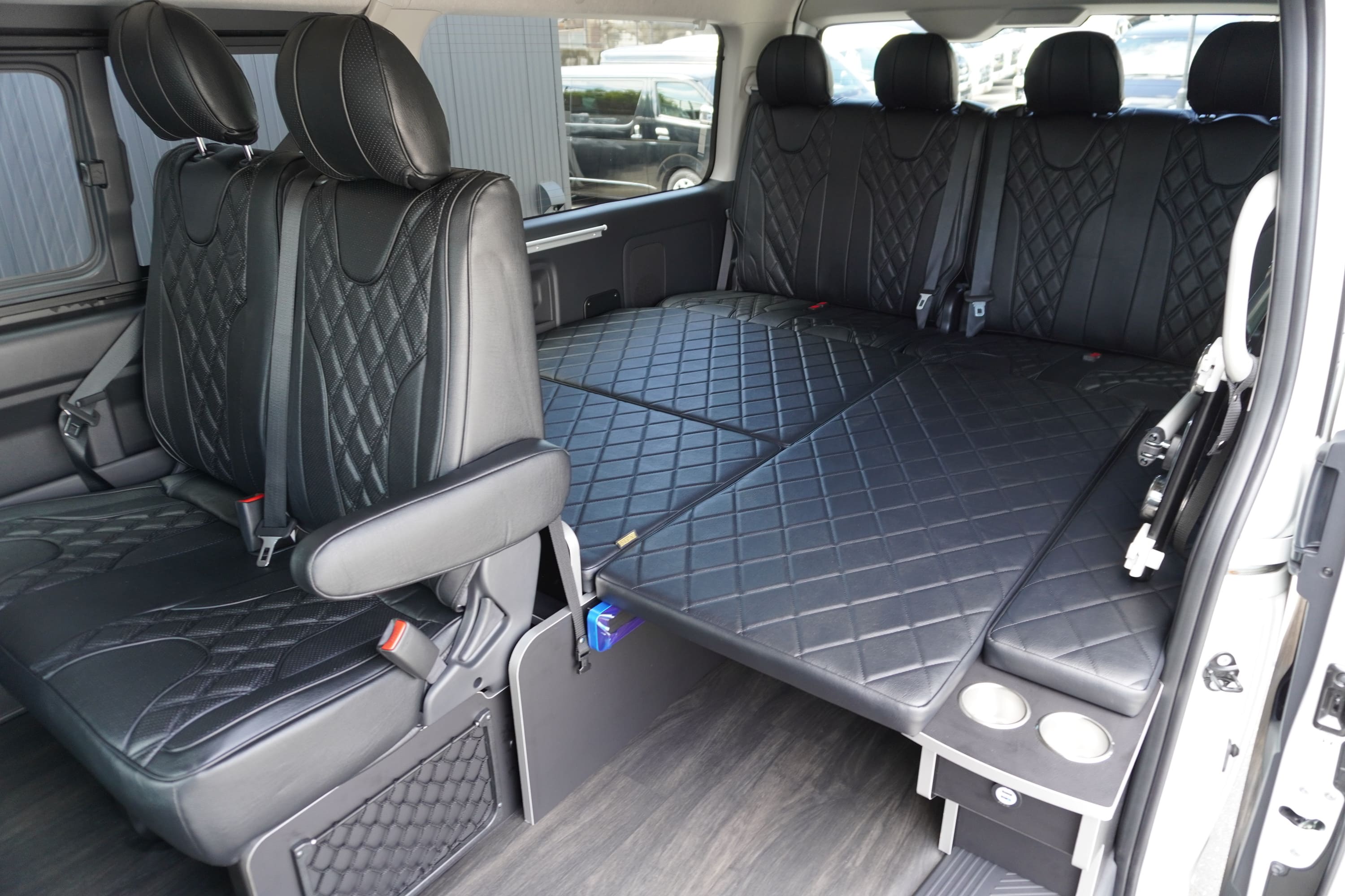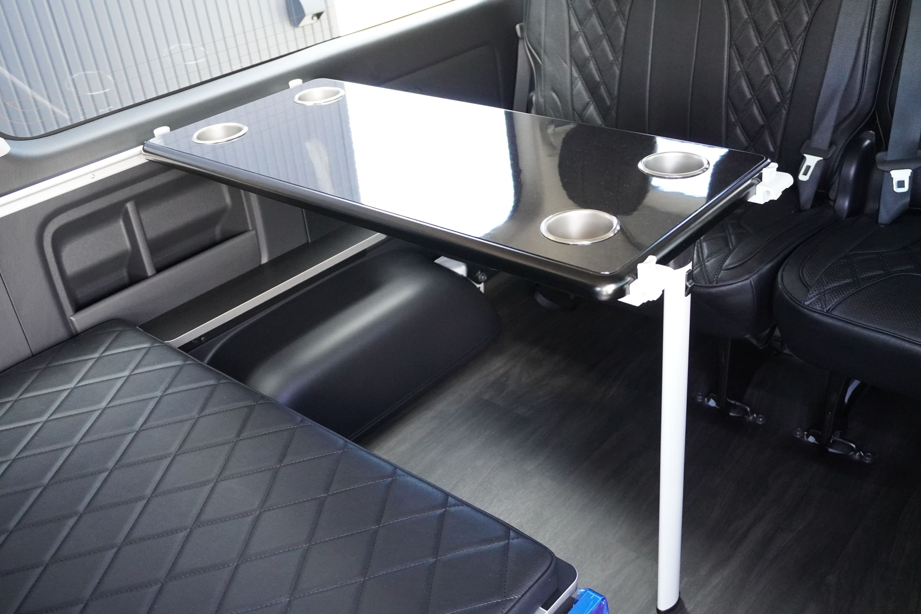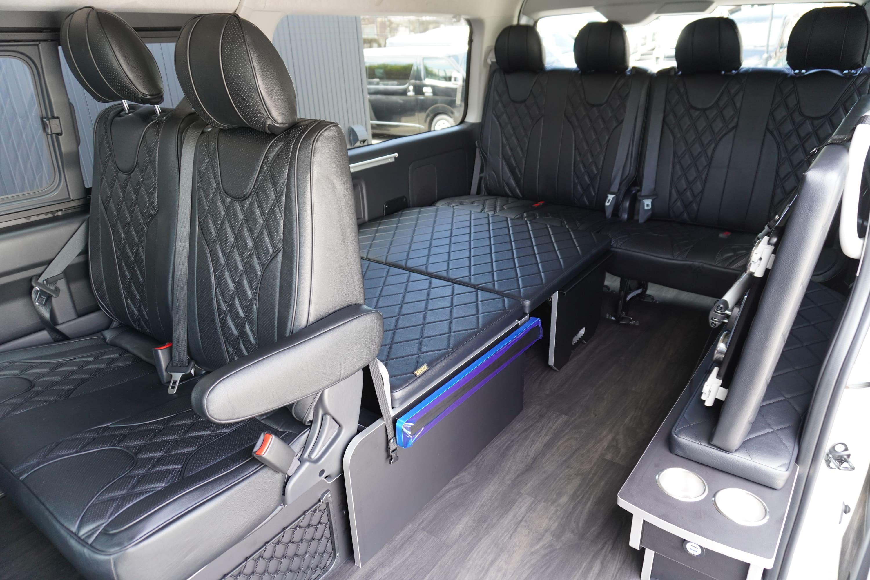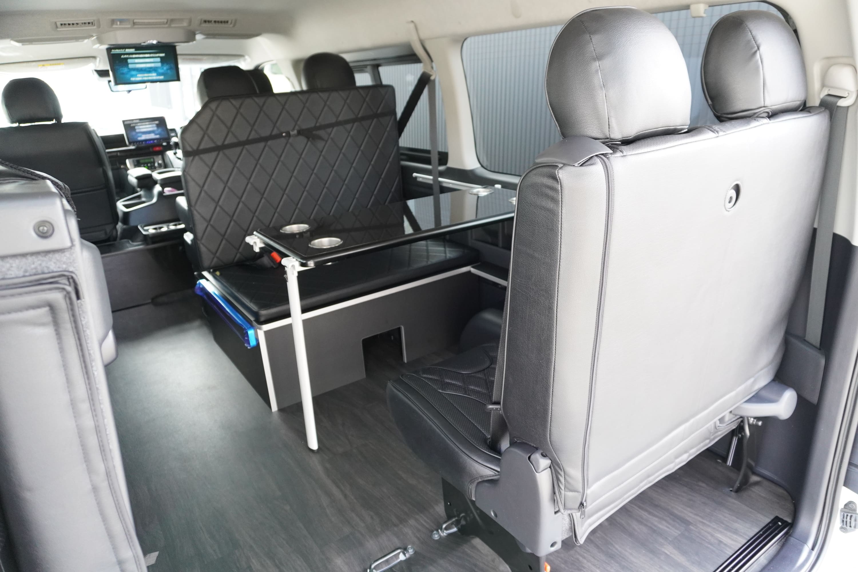 オプションサイドレールテーブル(ロングレッグ) 対面ラウンジ展開 2列目ワゴンGL純正2名シート 3列目ワゴンGL純正シート取り外し IF-WB8後ろ向き2名専用ベット家具