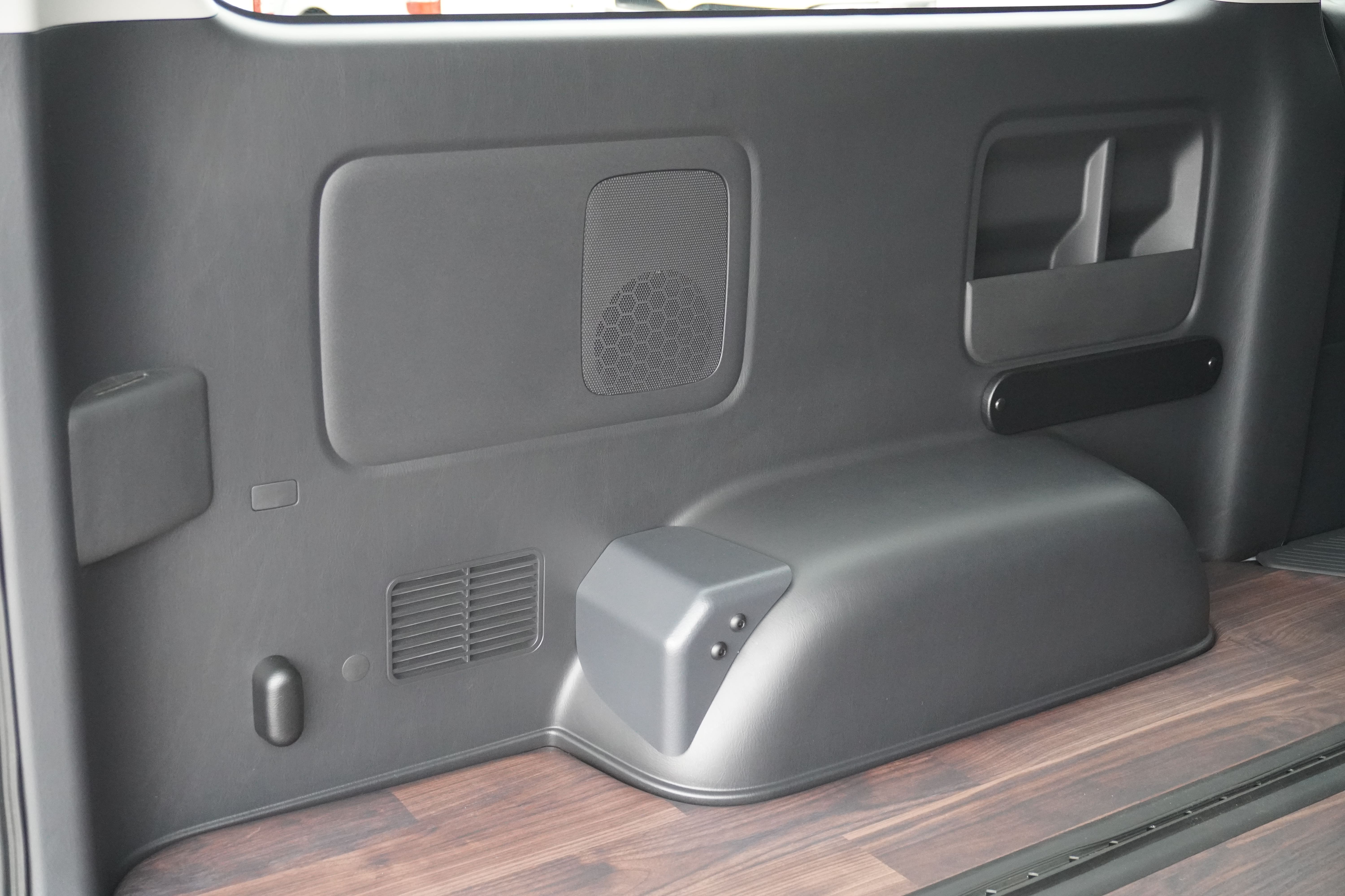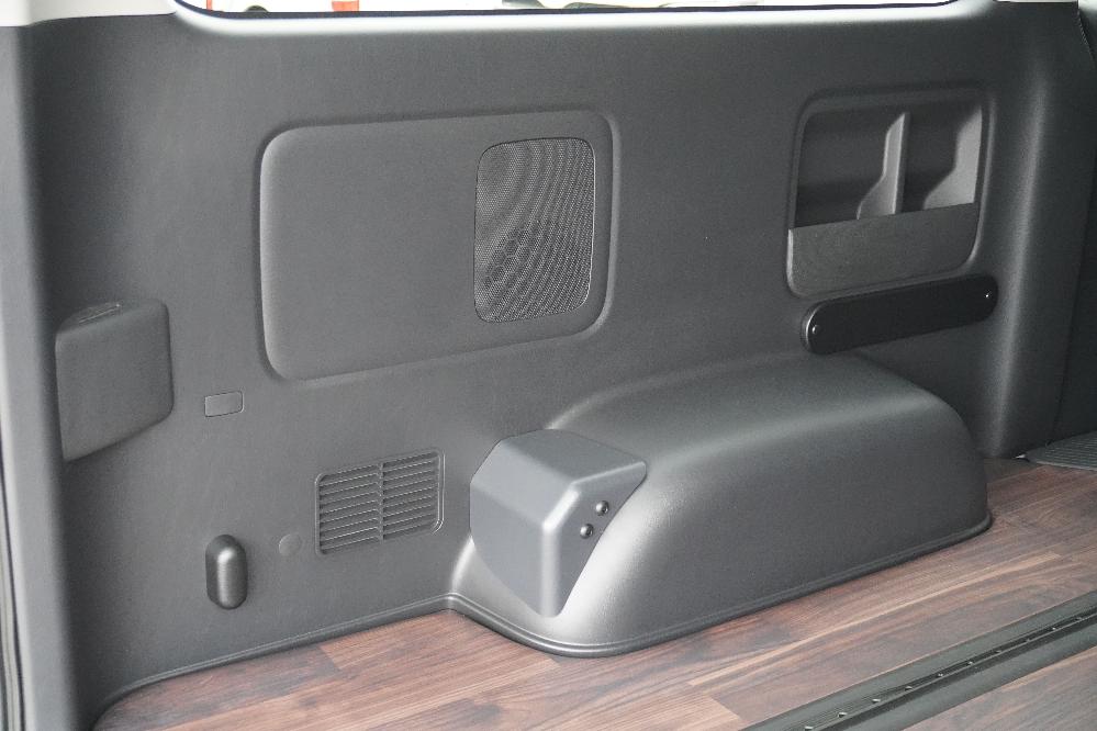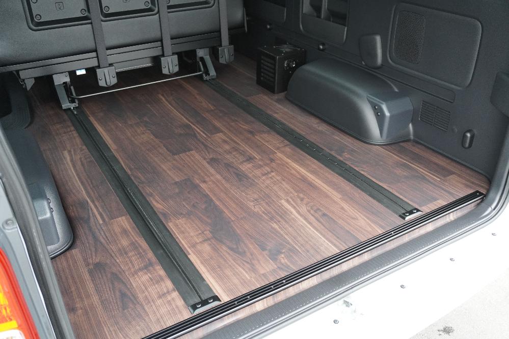 ラゲージスペース確保 フロアフローリング施工 ロングスライドレール スペアタイヤ取り出し出来ます。 フロアビス打ち無し