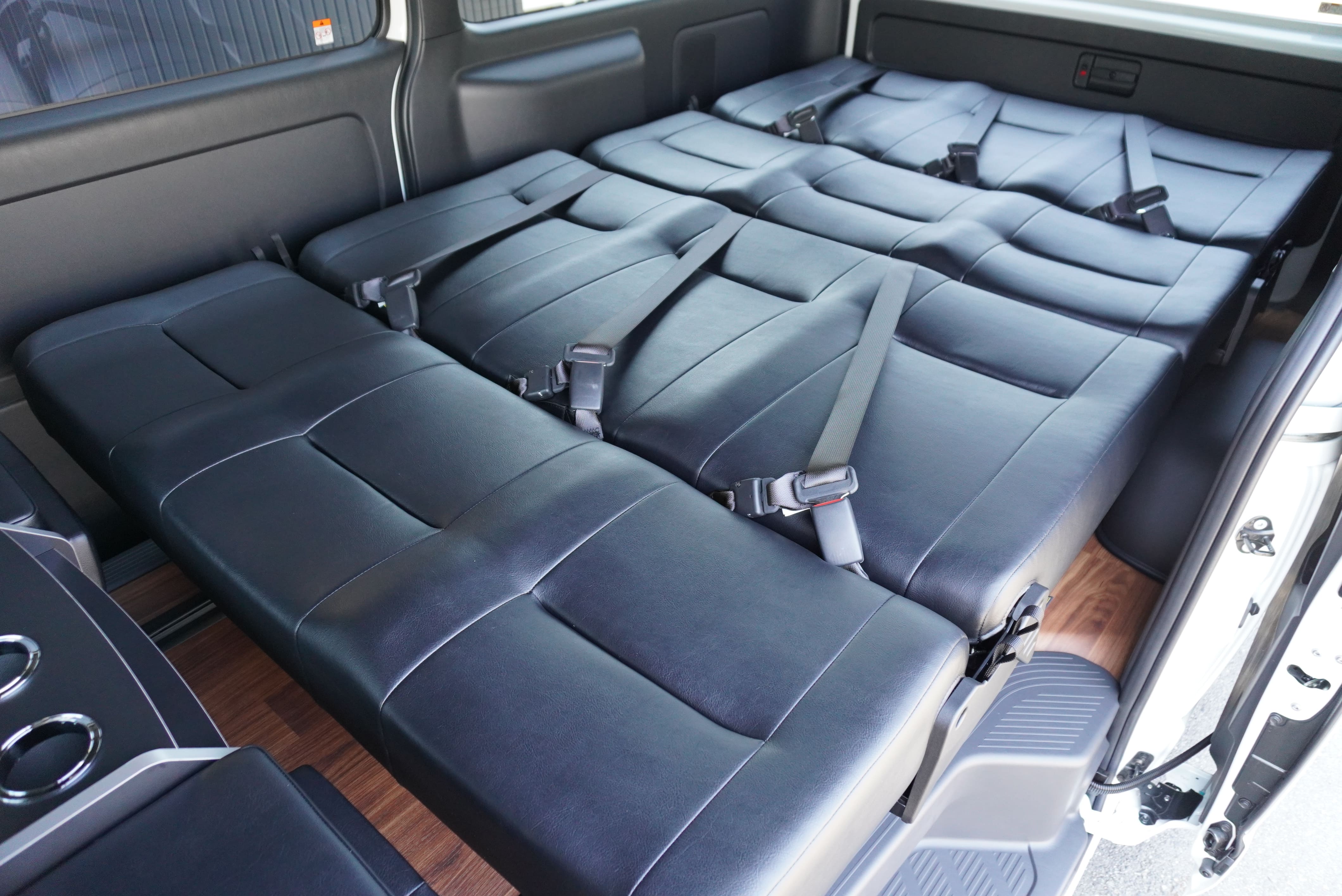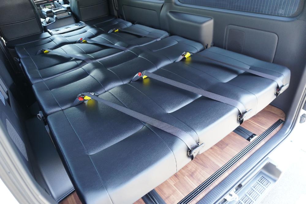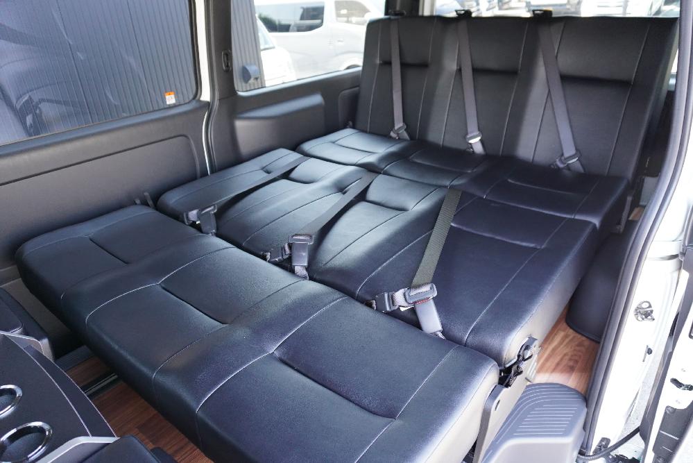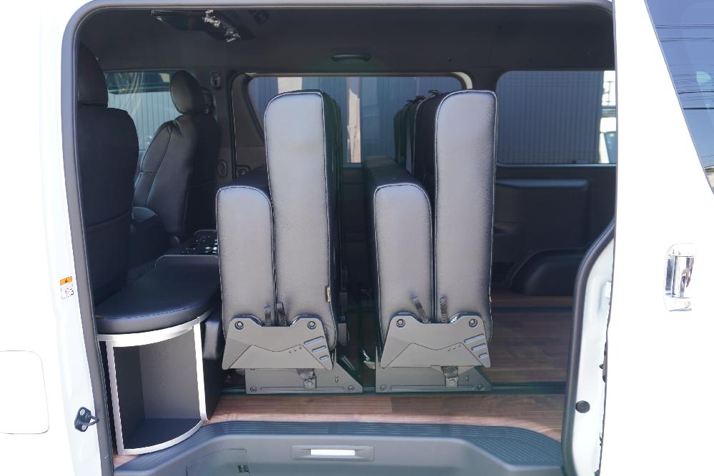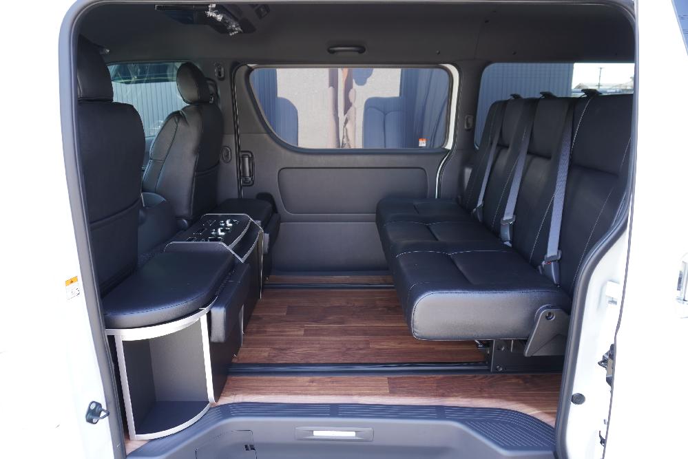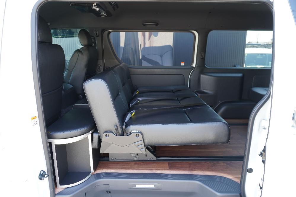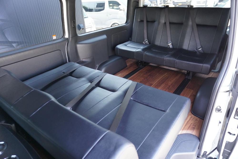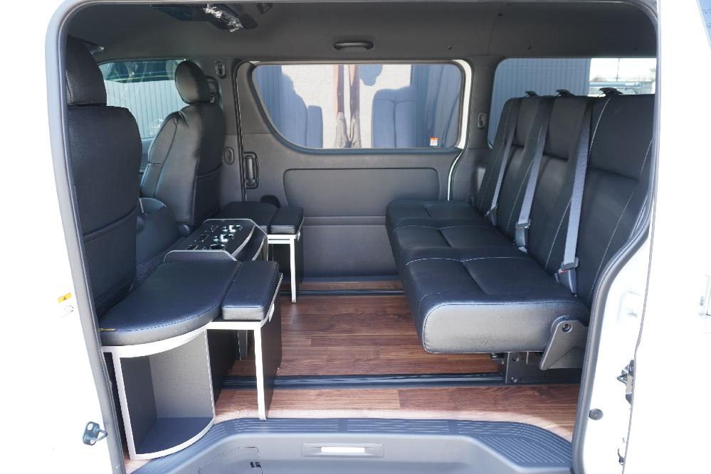 HOME > ギャラリー:IF-VR8/IF-SW8: REVOシート2脚1・4ナンバーのまま8人乗りor3・5ナンバー乗用車登録8人乗り > IF-SW8 200系ハイエースバンS-GLダークプライムU ワイドボディー REVOシート2脚8人乗り施工