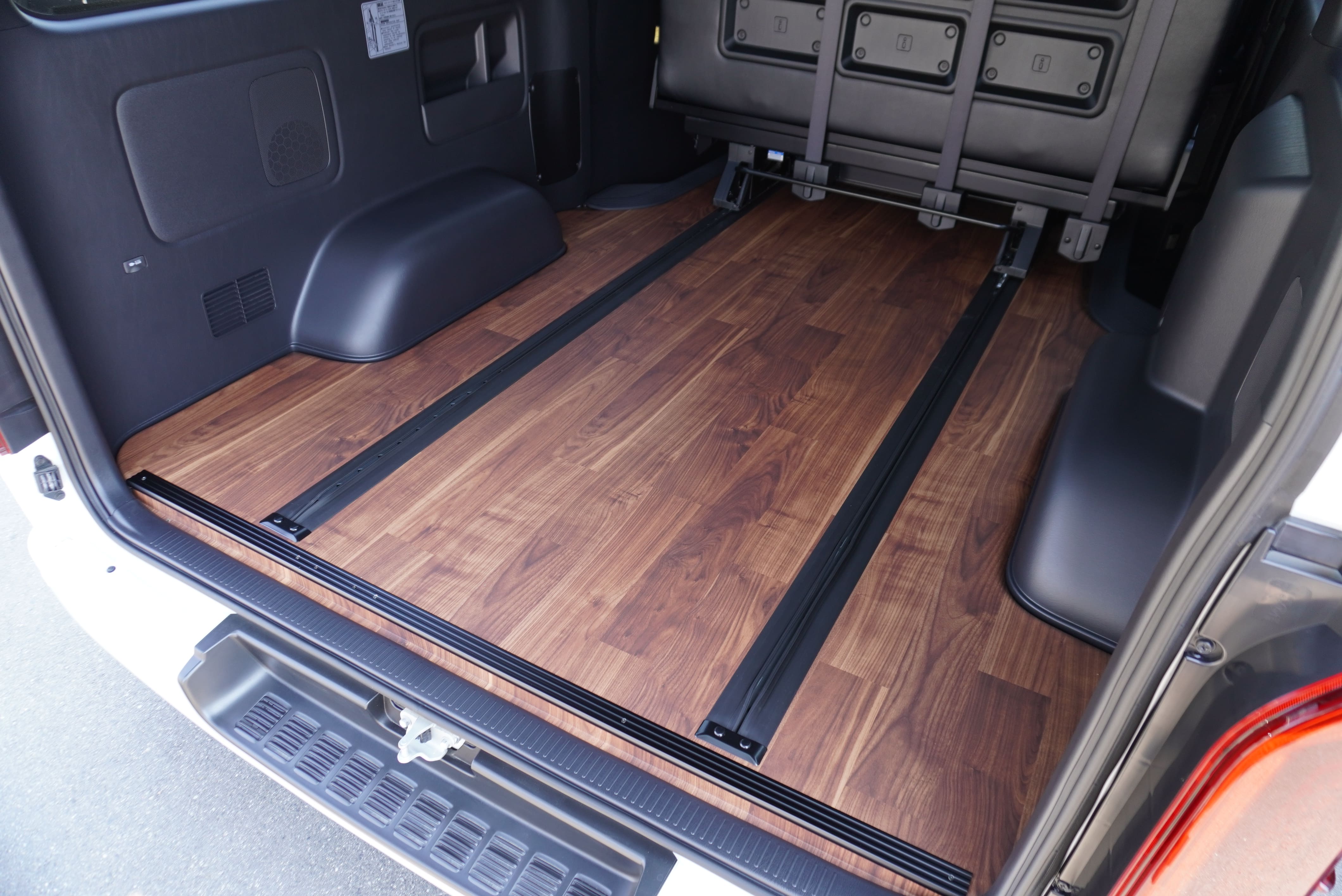 フロアフローリング施工 ロングスライドレール スペアタイヤ取り出しできます フロアビス打ち無し