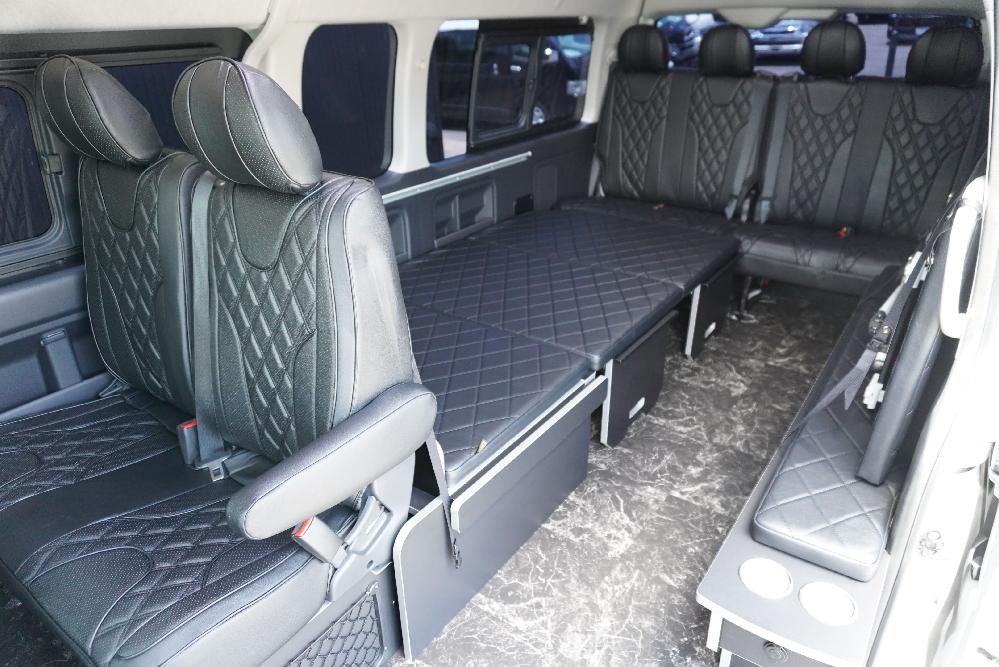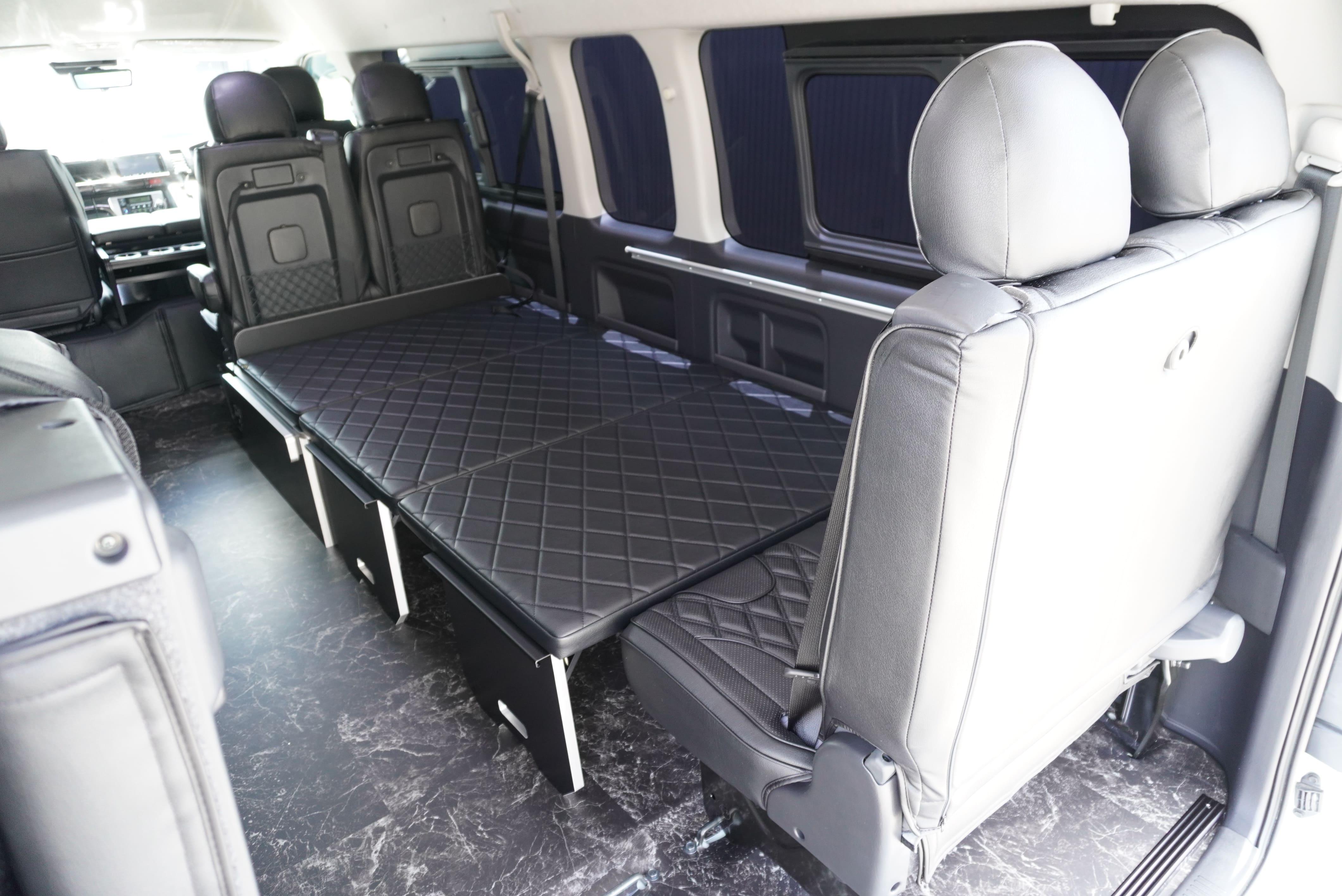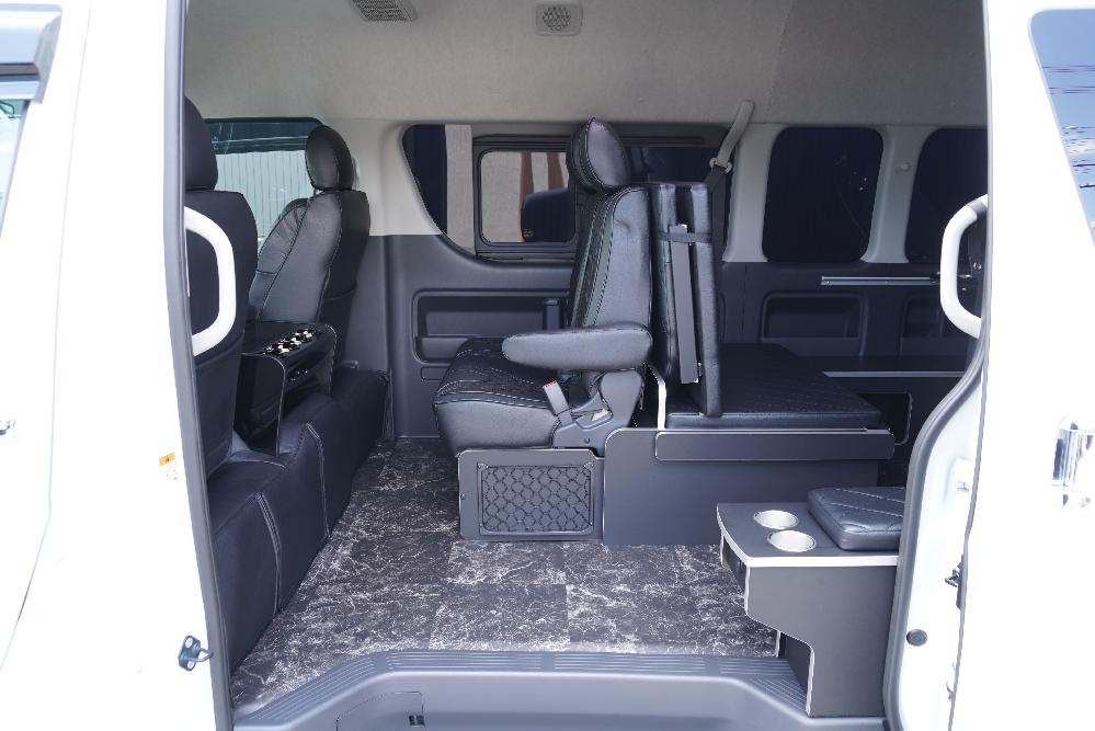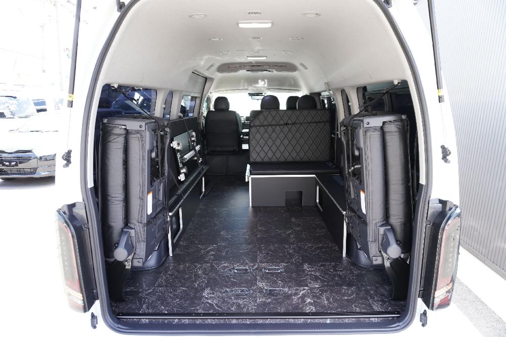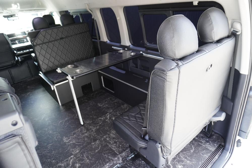 HOME > ギャラリー:IF-WB8 : ハイエースワゴンGL前向き8名後ろ向き2名10人乗り対面ラウンジベット家具 > IF-WB8 200系ハイエースコミューターGL スーパーロング 前向き8名後ろ向き2名10人乗り対面ラウンジベッド家具施工