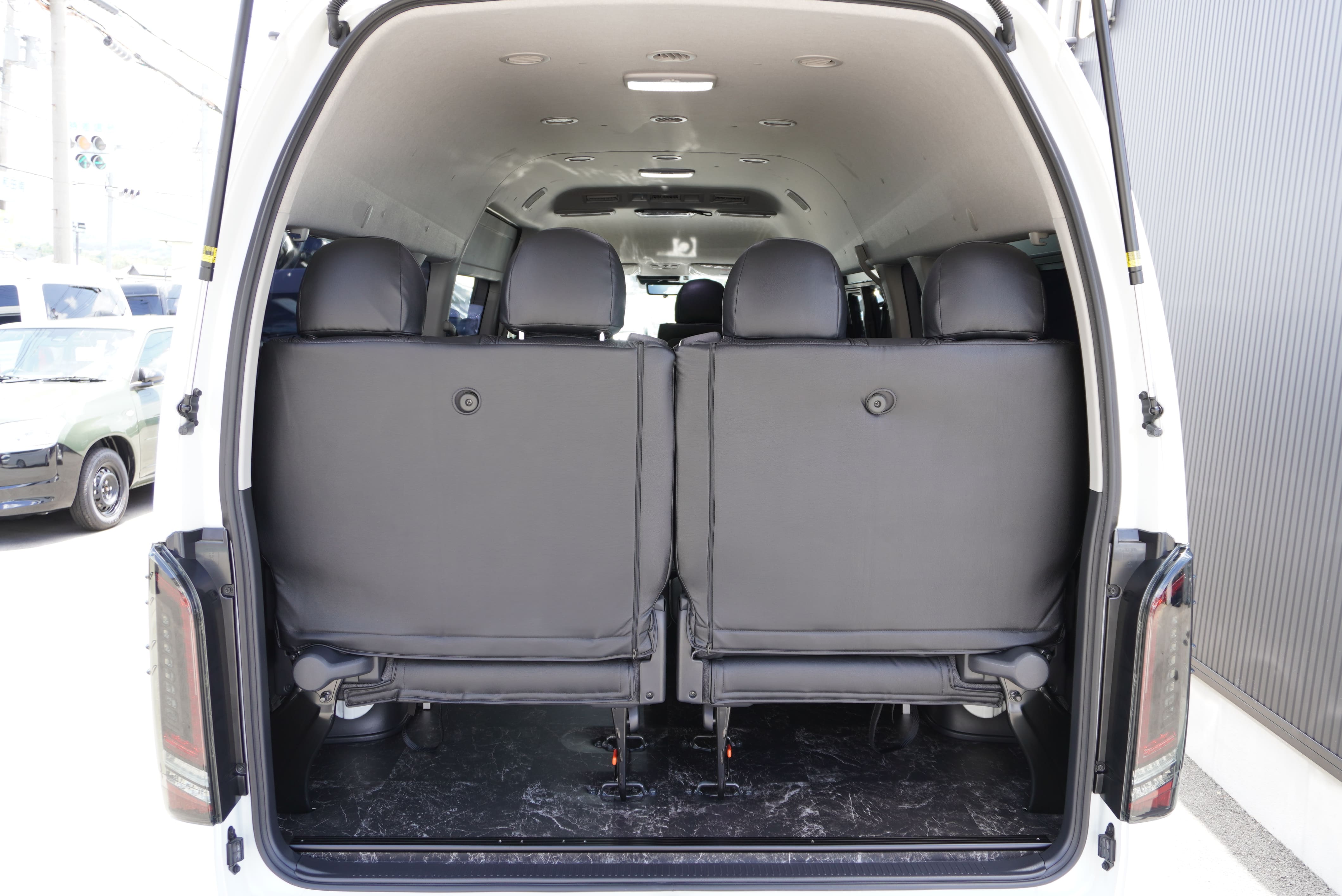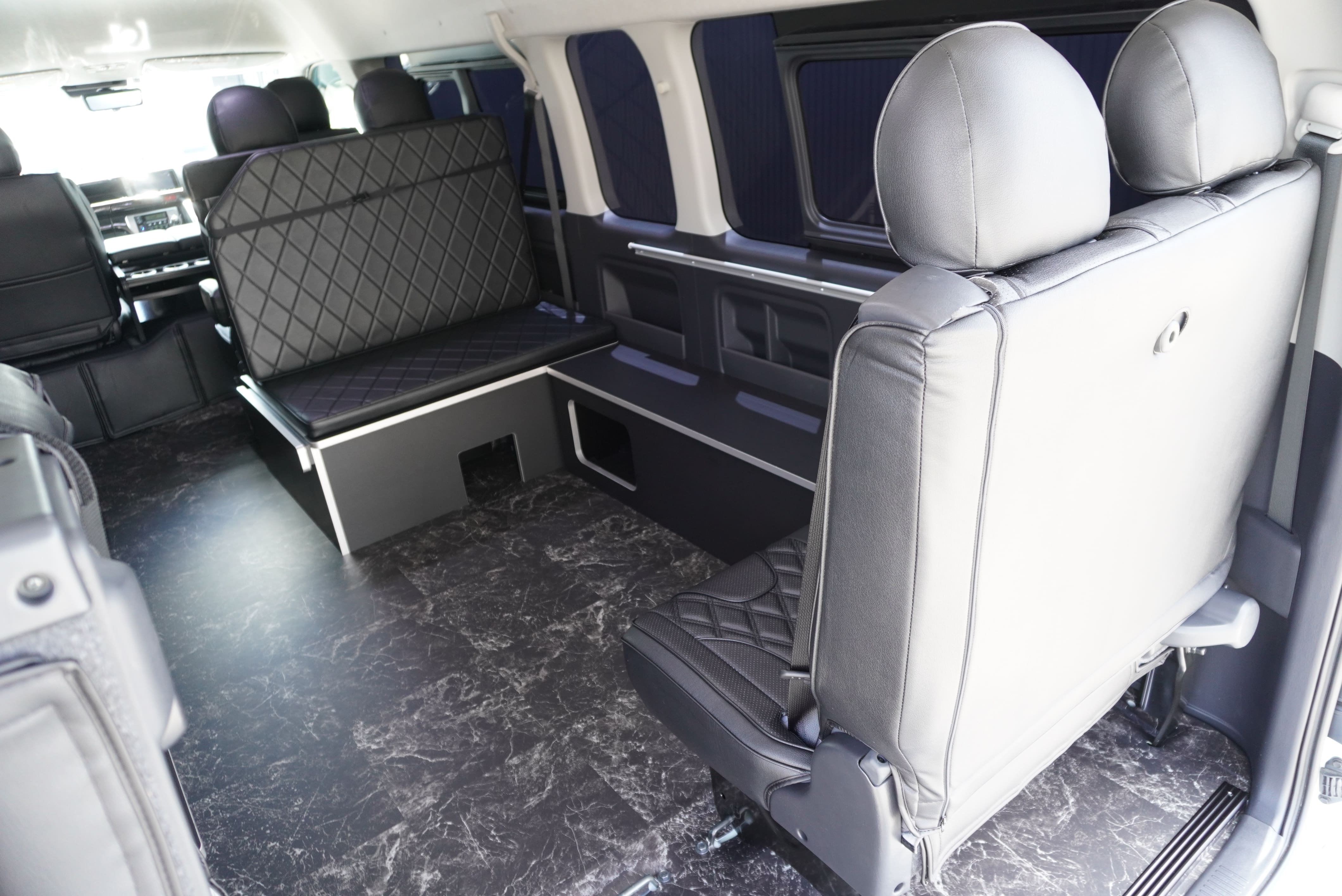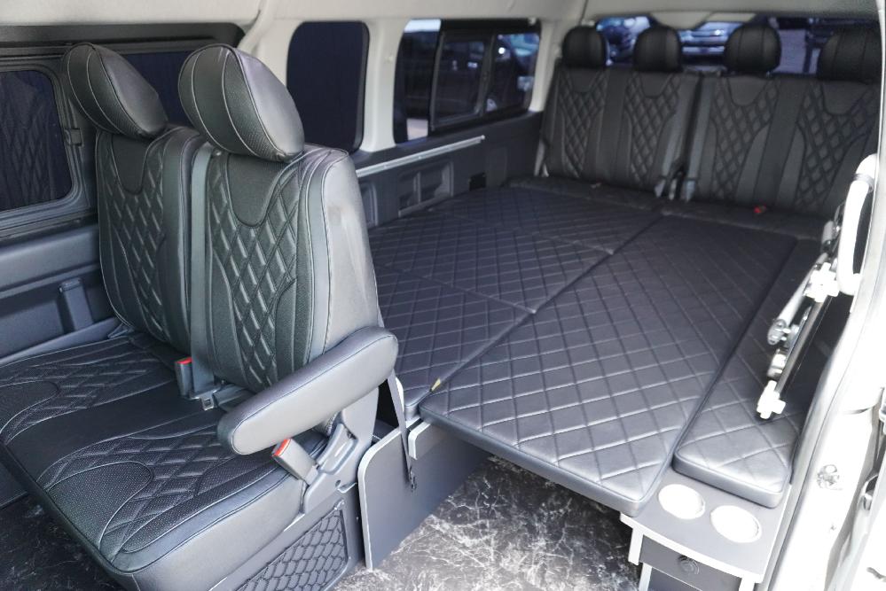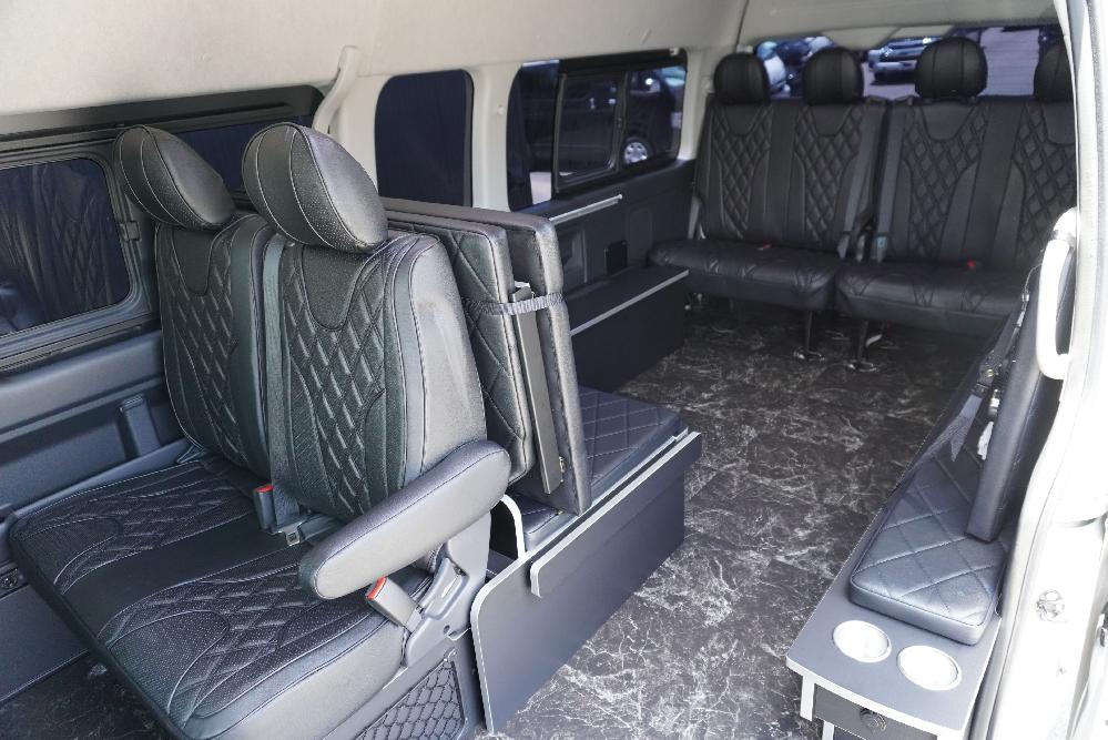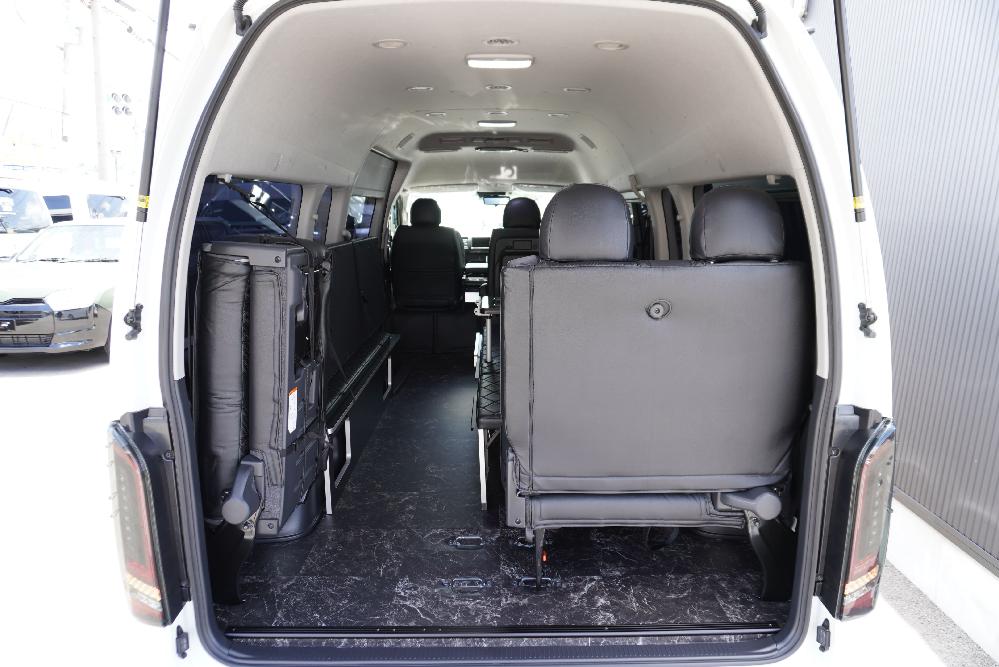 HOME > ギャラリー:IF-WB8 : ハイエースワゴンGL前向き8名後ろ向き2名10人乗り対面ラウンジベット家具 > IF-WB8 200系ハイエースコミューターGL スーパーロング 前向き8名後ろ向き2名10人乗り対面ラウンジベッド家具施工