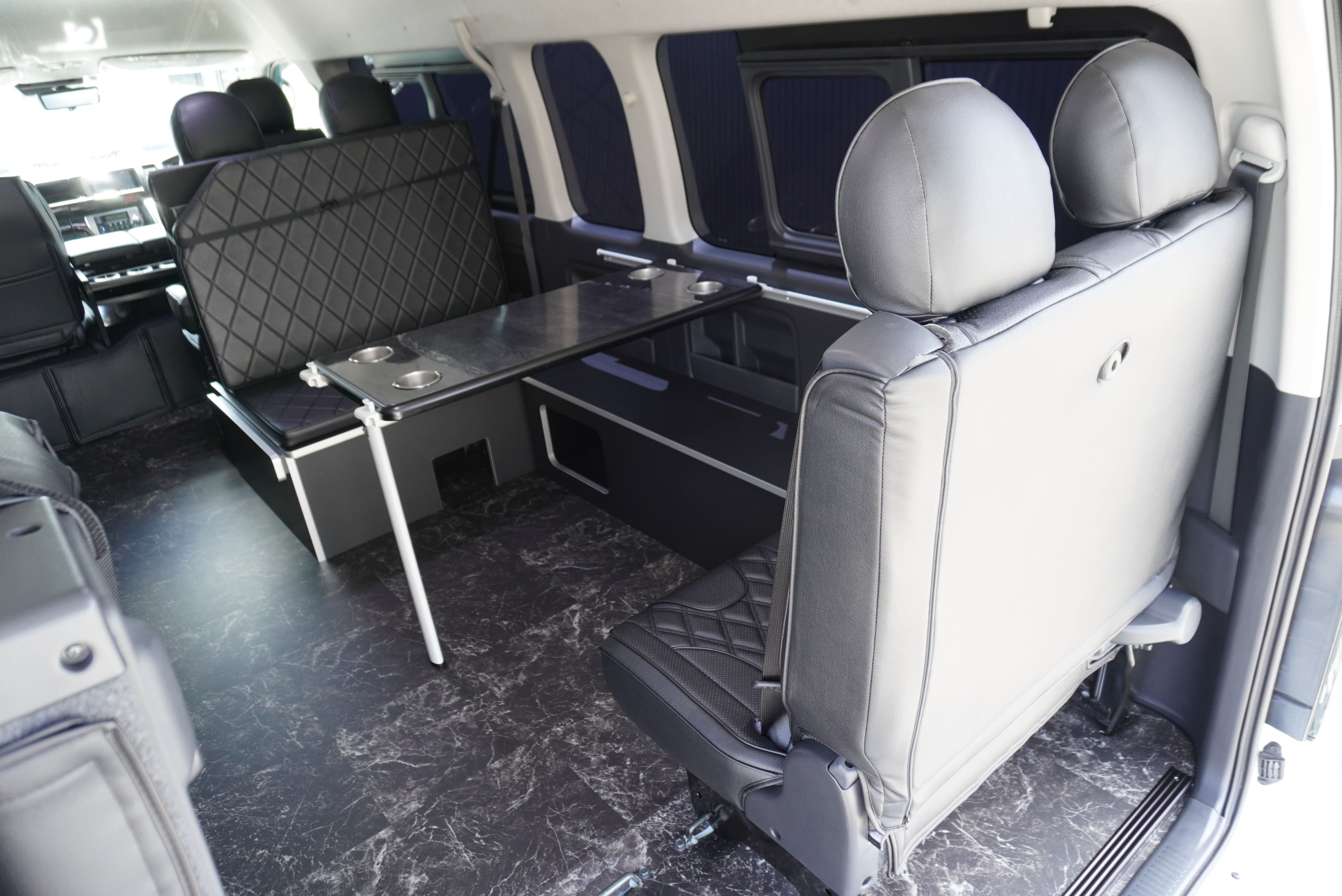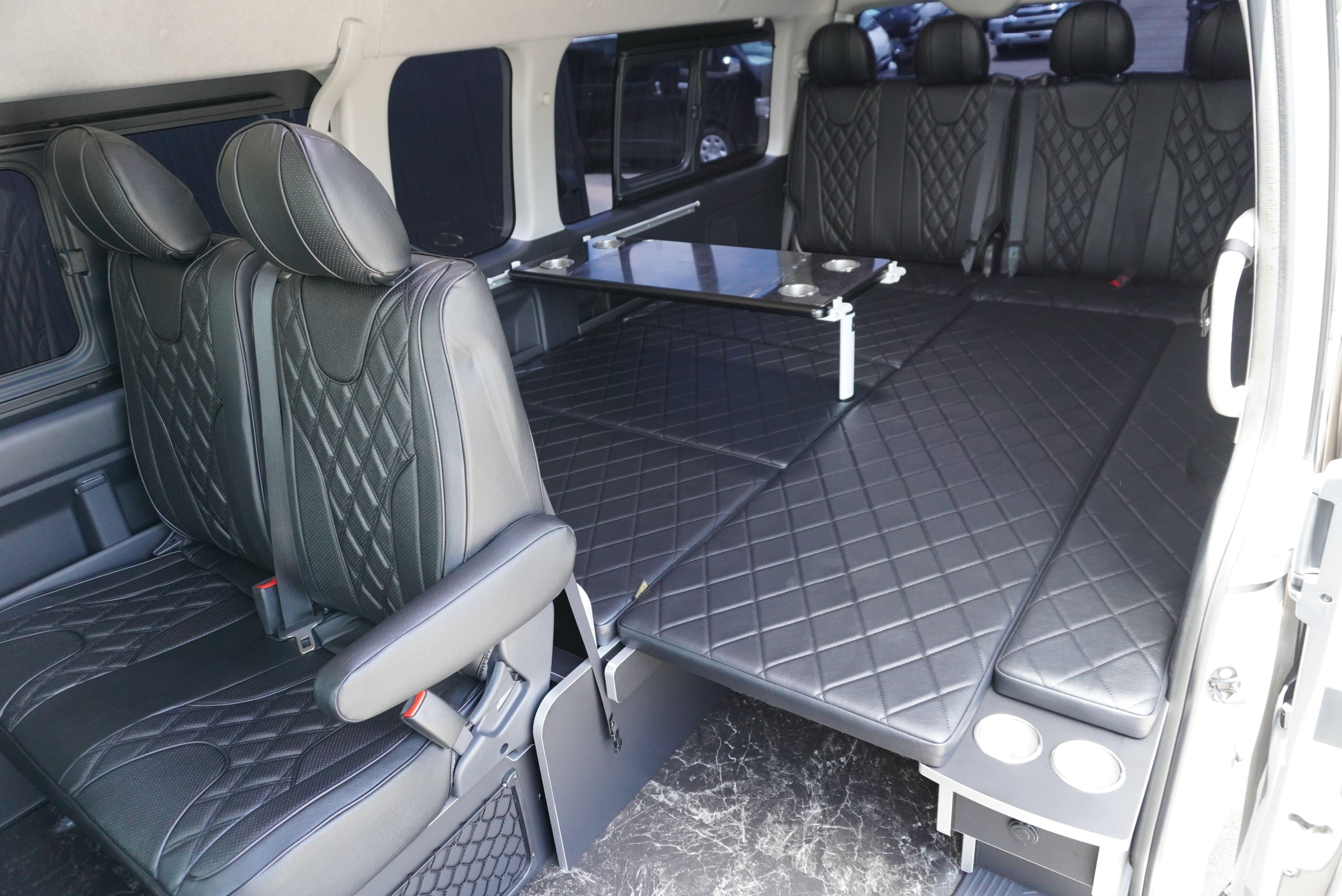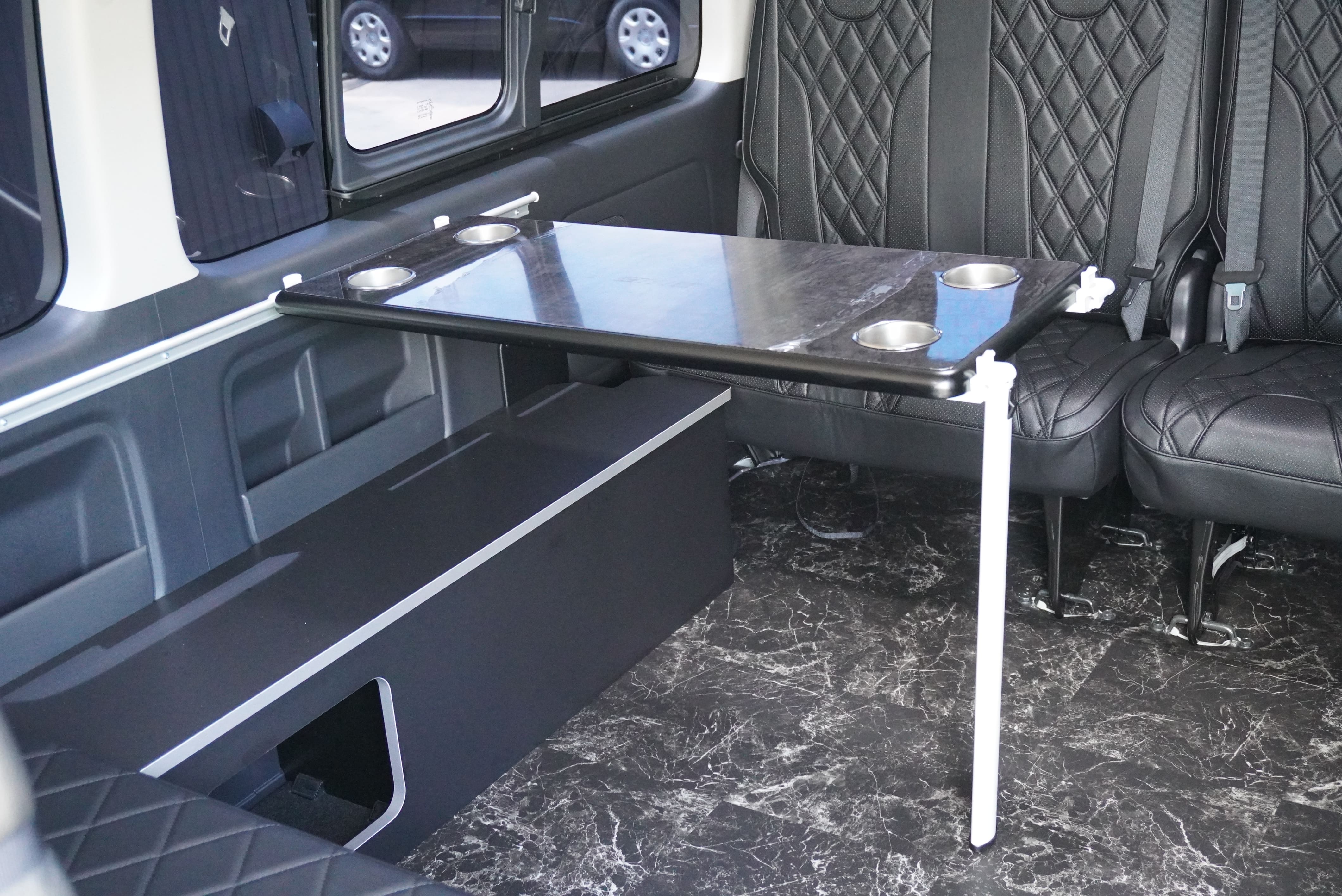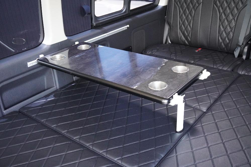 オプションサイドレールテーブル(ロングレッグ) 対面ラウンジ展開 2列目ワゴンGL純正2名シート 3列目ワゴンGL純正シート取り外し IF-WB8後ろ向き2名専用ベット家具