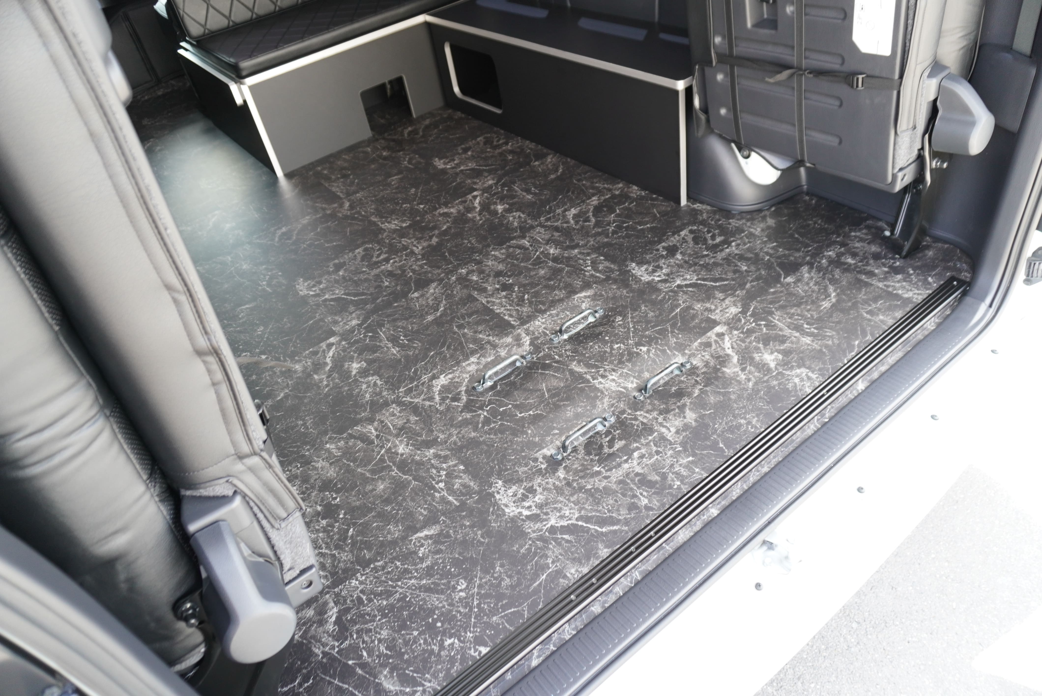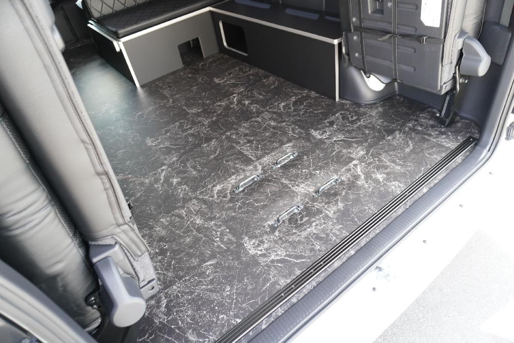 コミューターGL純正4列目セパレート跳ね上げシート ラゲージスペース確保 フロアフローリング施工(SDR9163ブリリアントストーン) スペアタイヤ取り出し出来ます。 フロアビス打ち無し