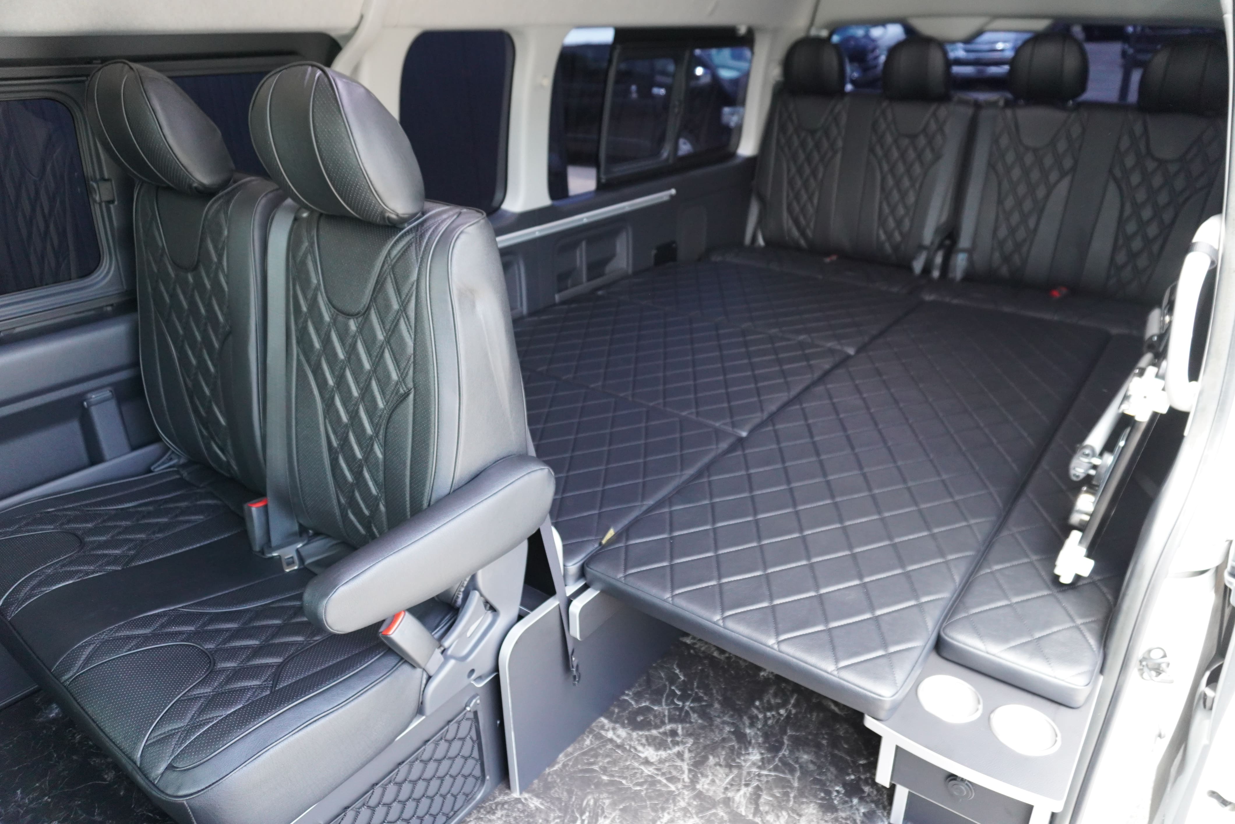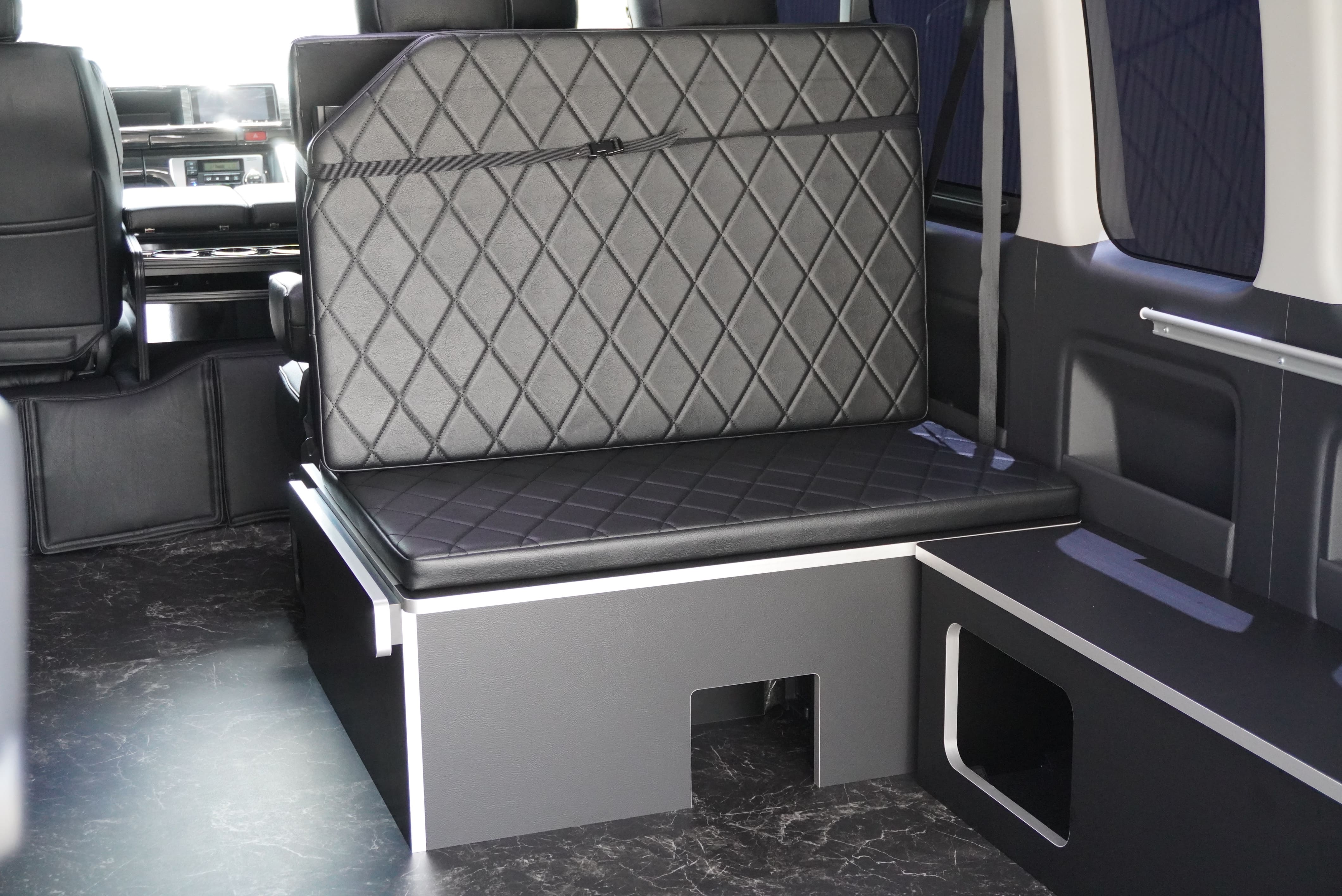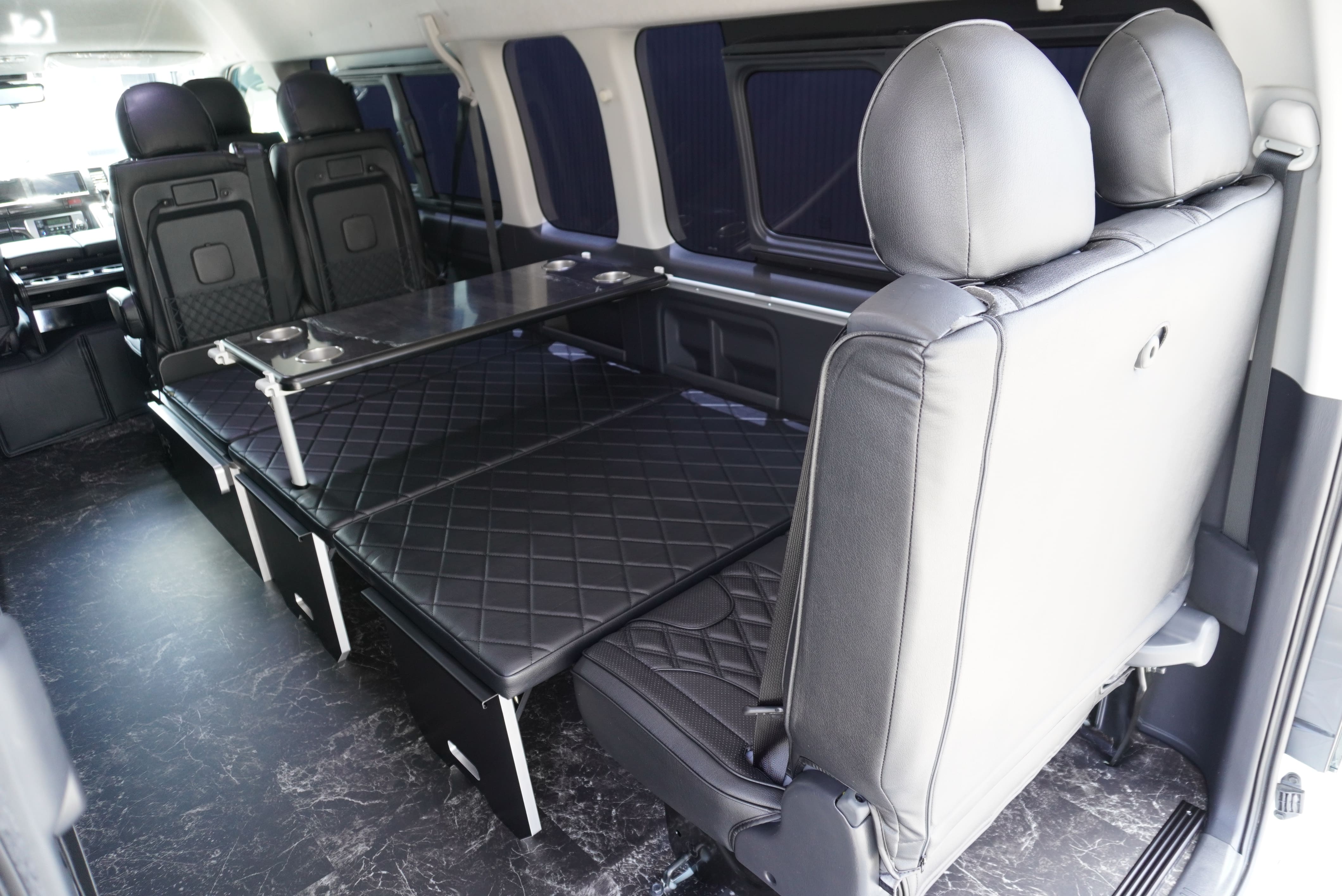 オプションサイドレールテーブル(ロングレッグ) 3列目後ろ向き2名シート展開 ベットマット背もたれ展開 後ろ向き専用シートベルト搭載