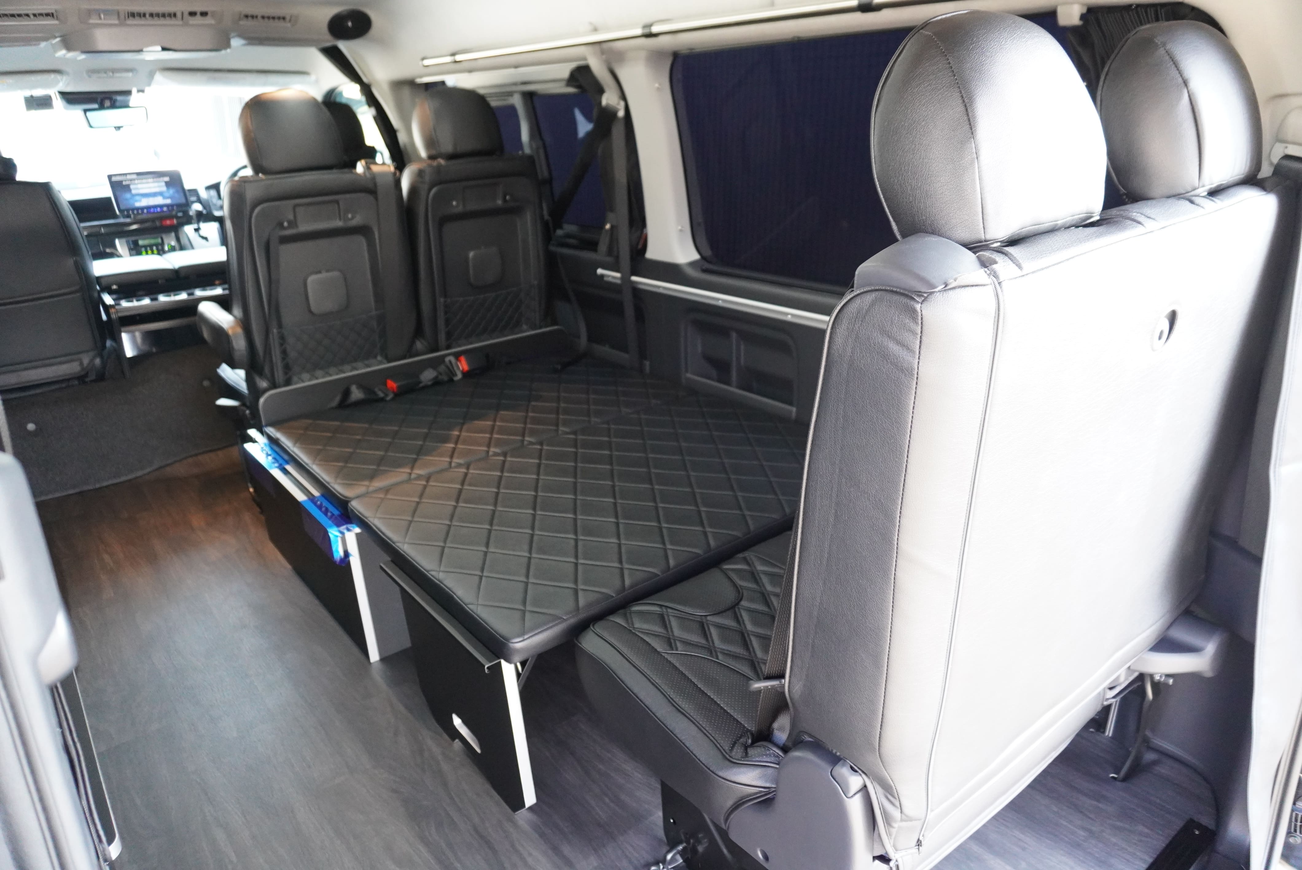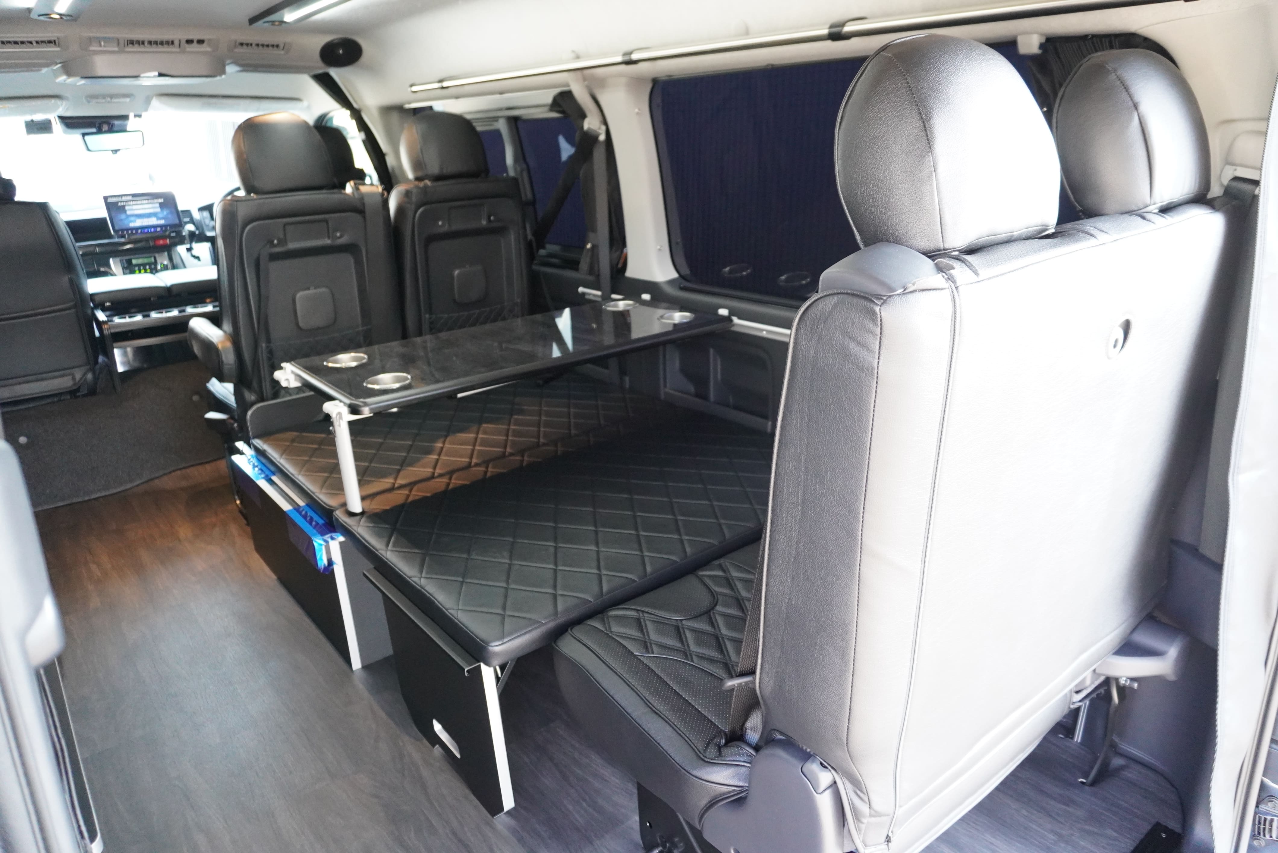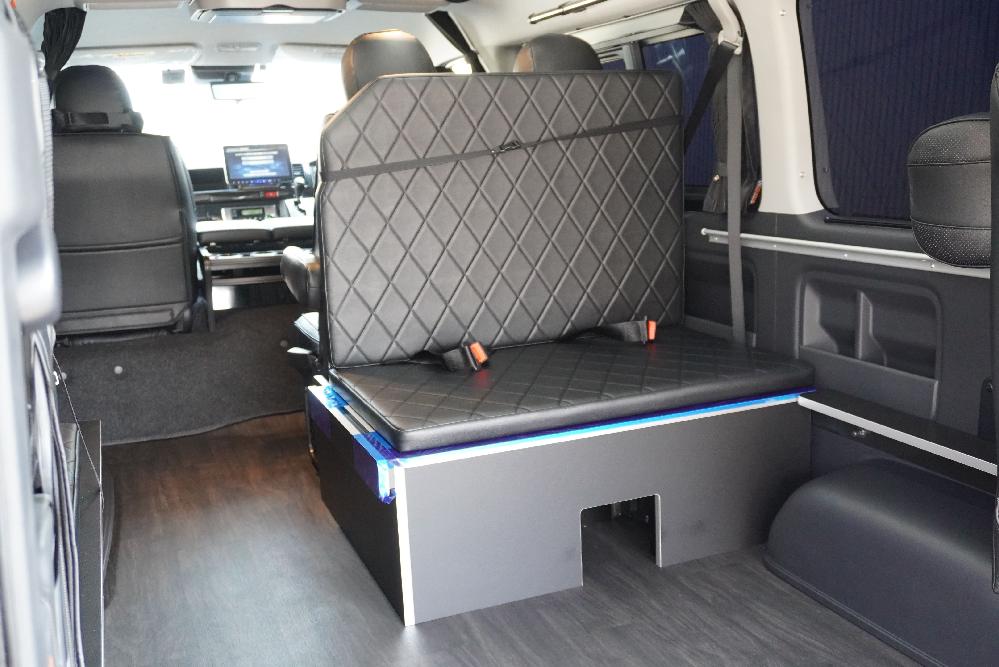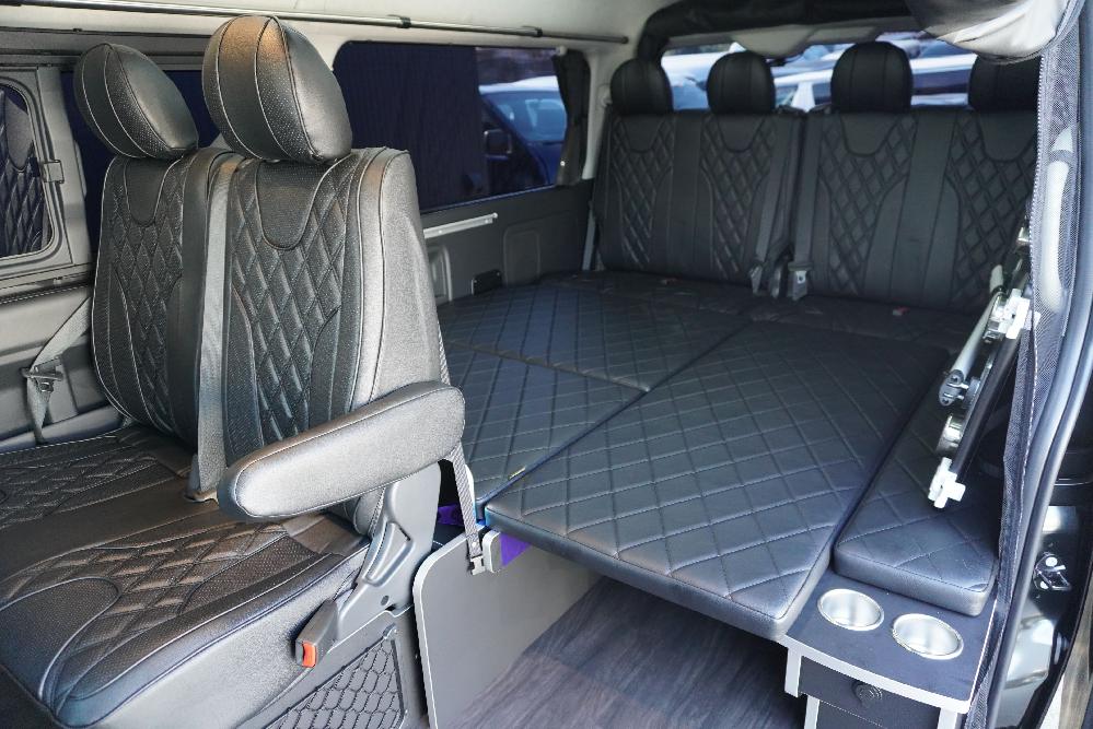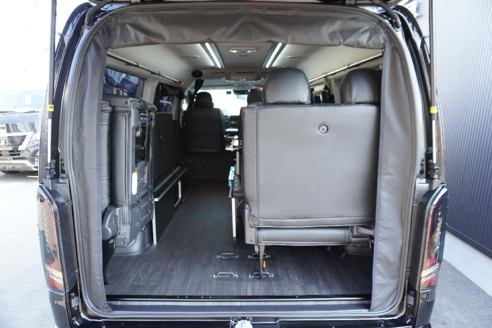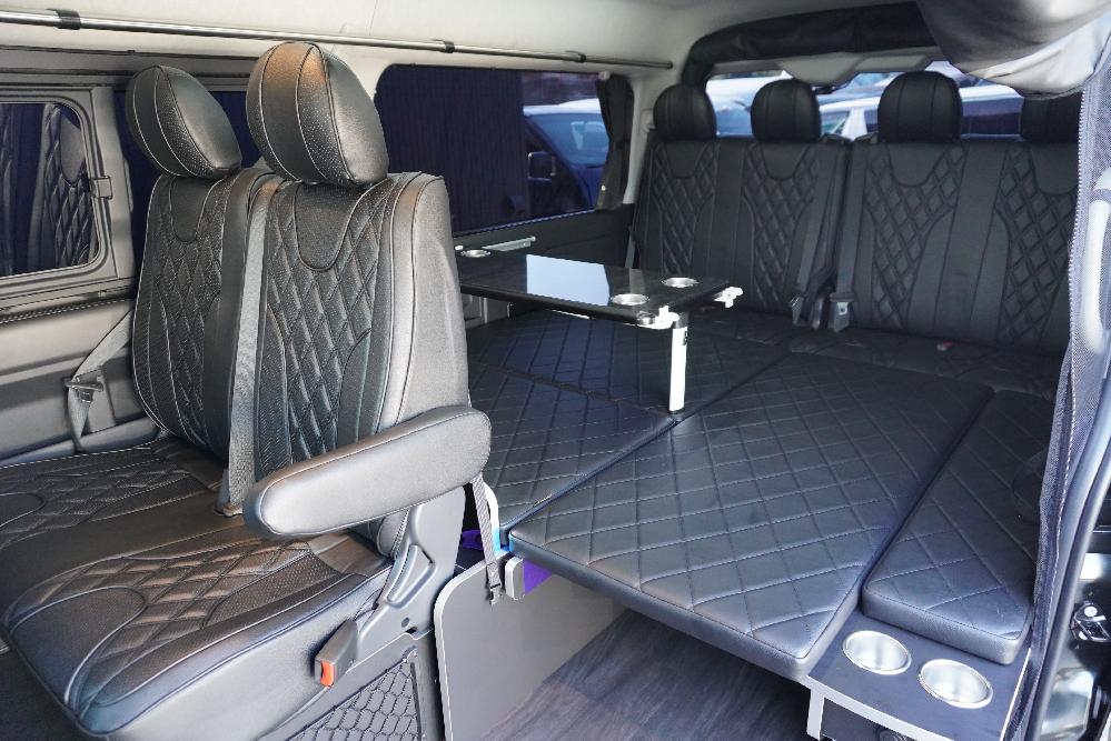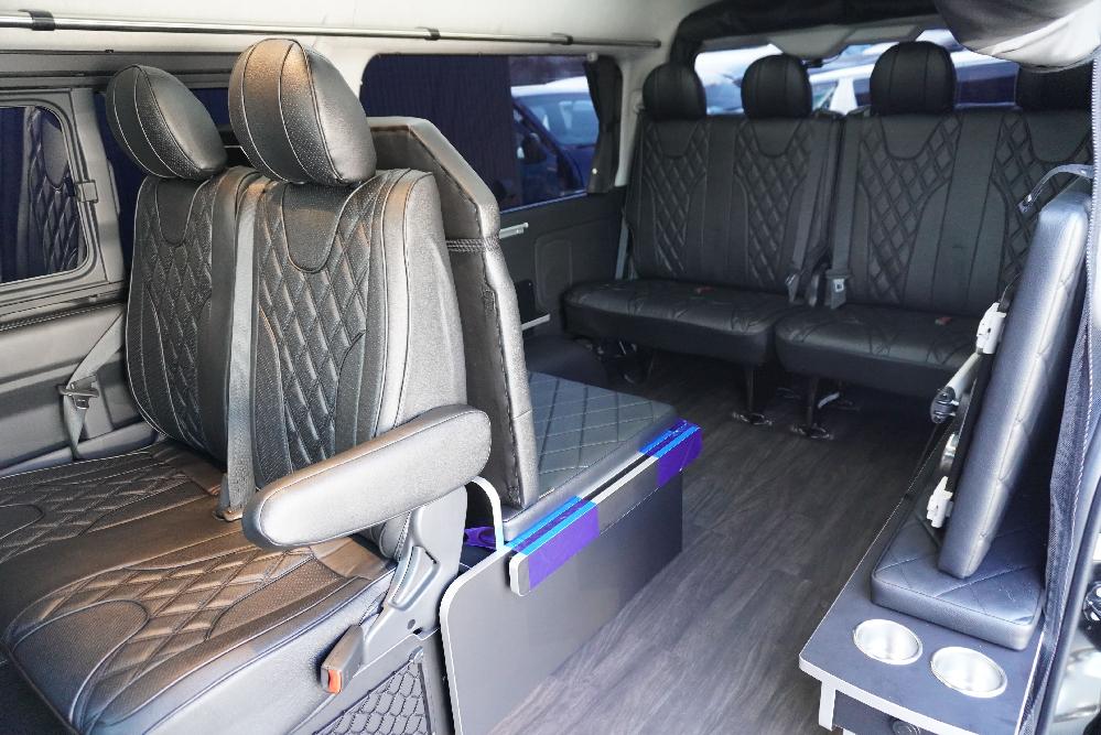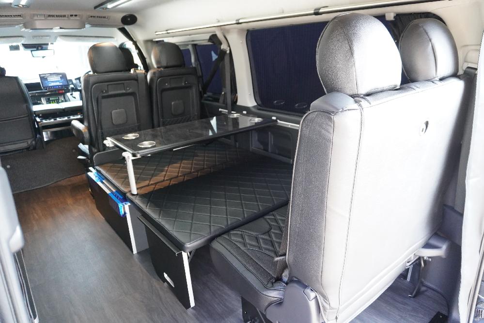 HOME > ギャラリー:IF-WB8 : ハイエースワゴンGL前向き8名後ろ向き2名10人乗り対面ラウンジベット家具 > IF-WB8 200系ハイエースワゴンGL ワイドボディー 前向き8名後ろ向き2名10人乗り対面ラウンジベッド家具施工
