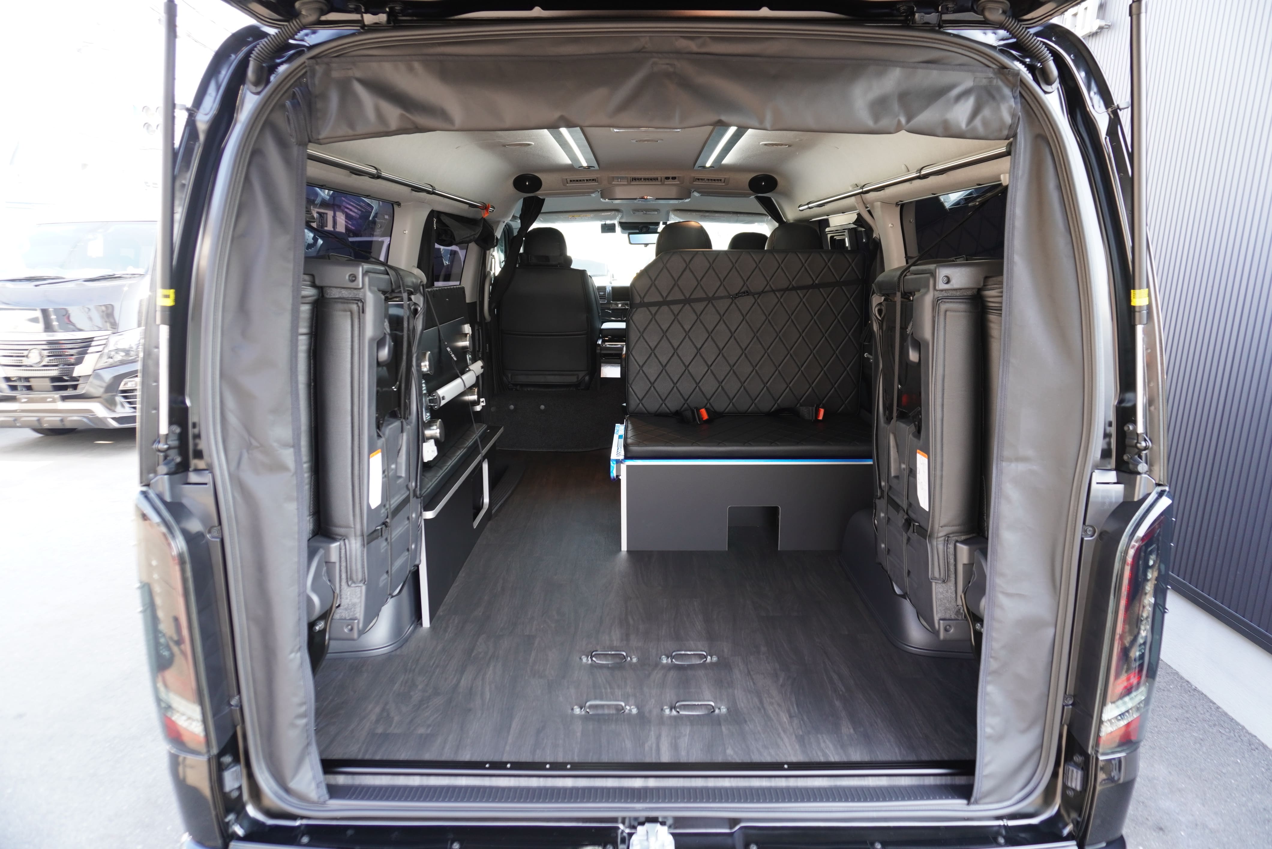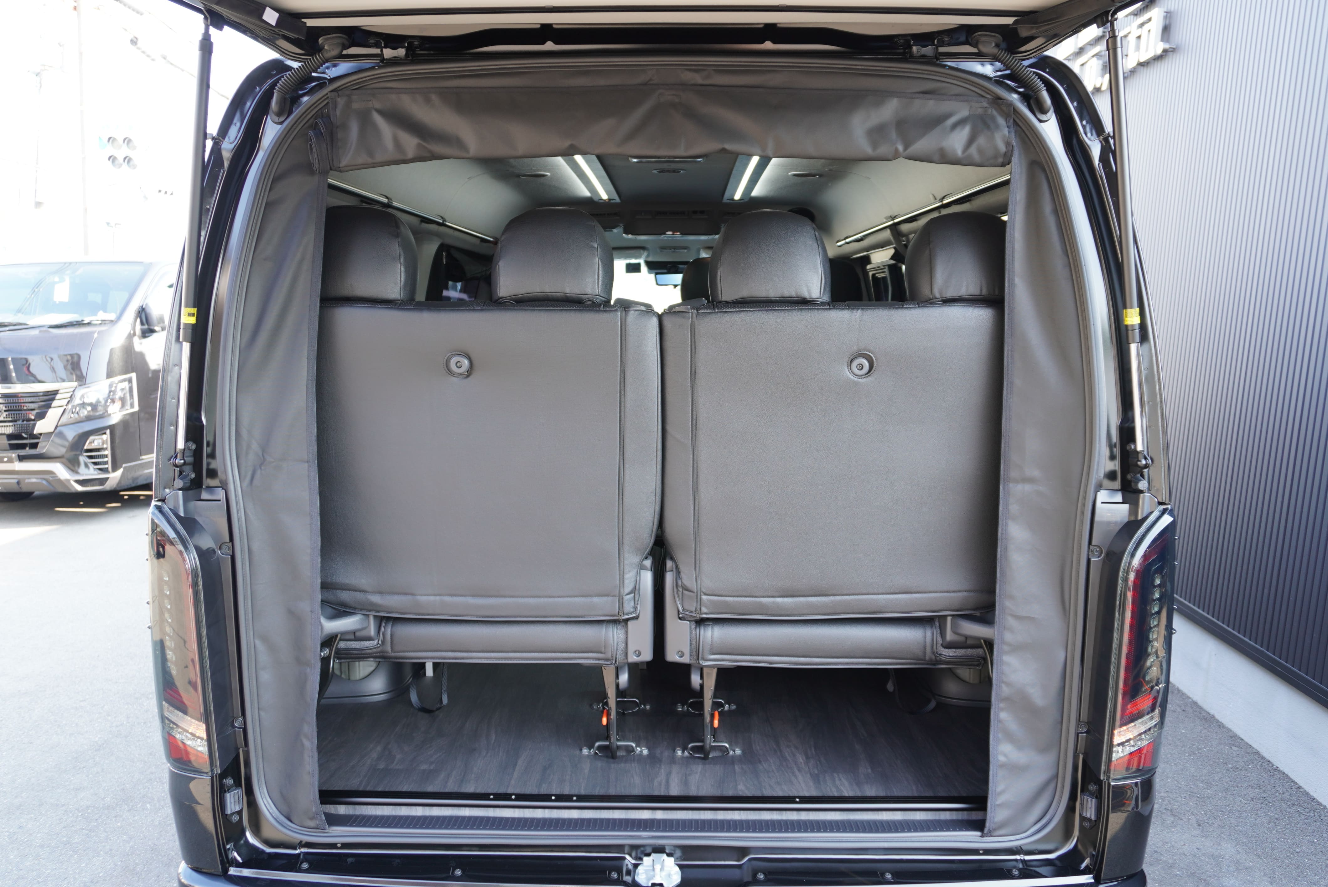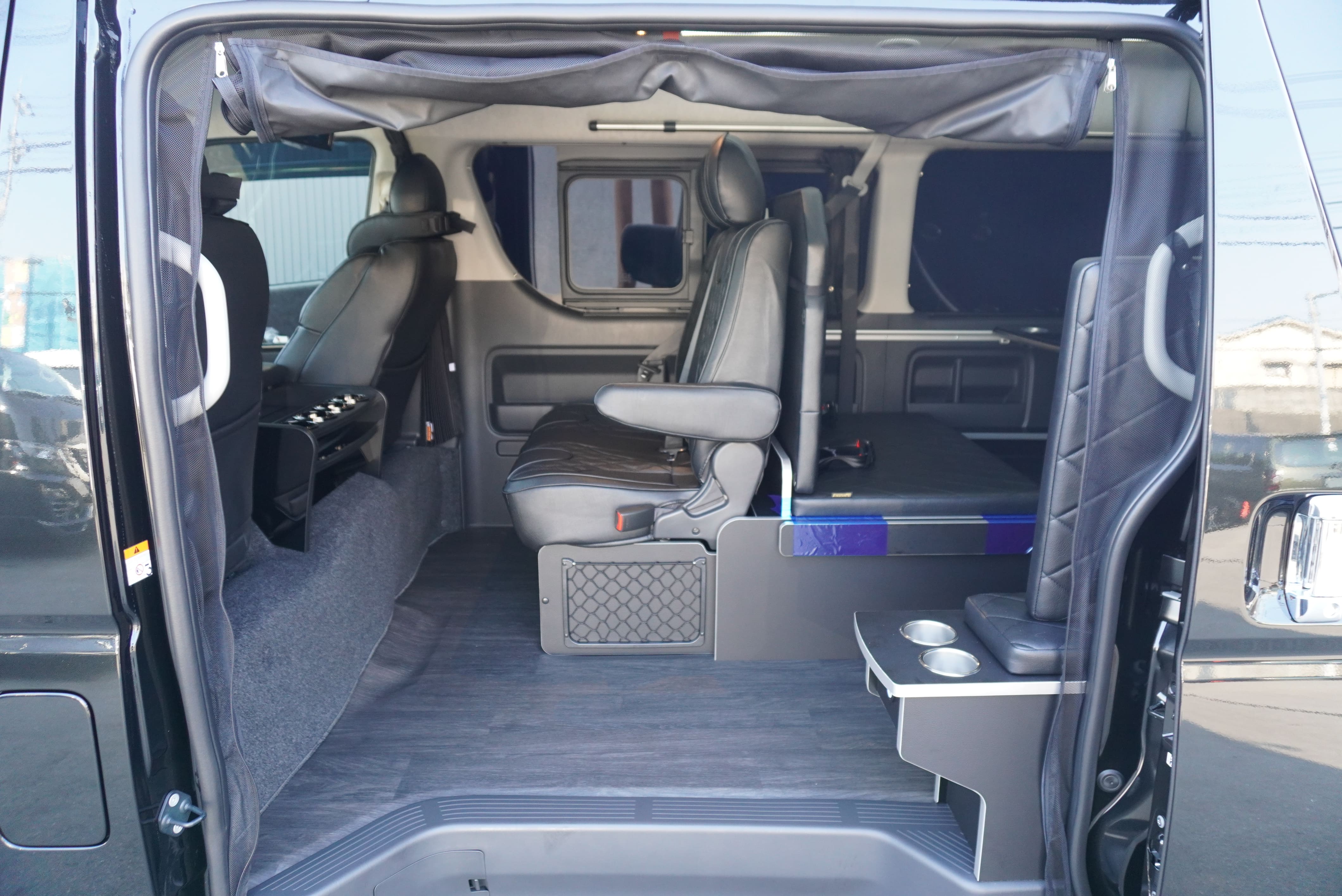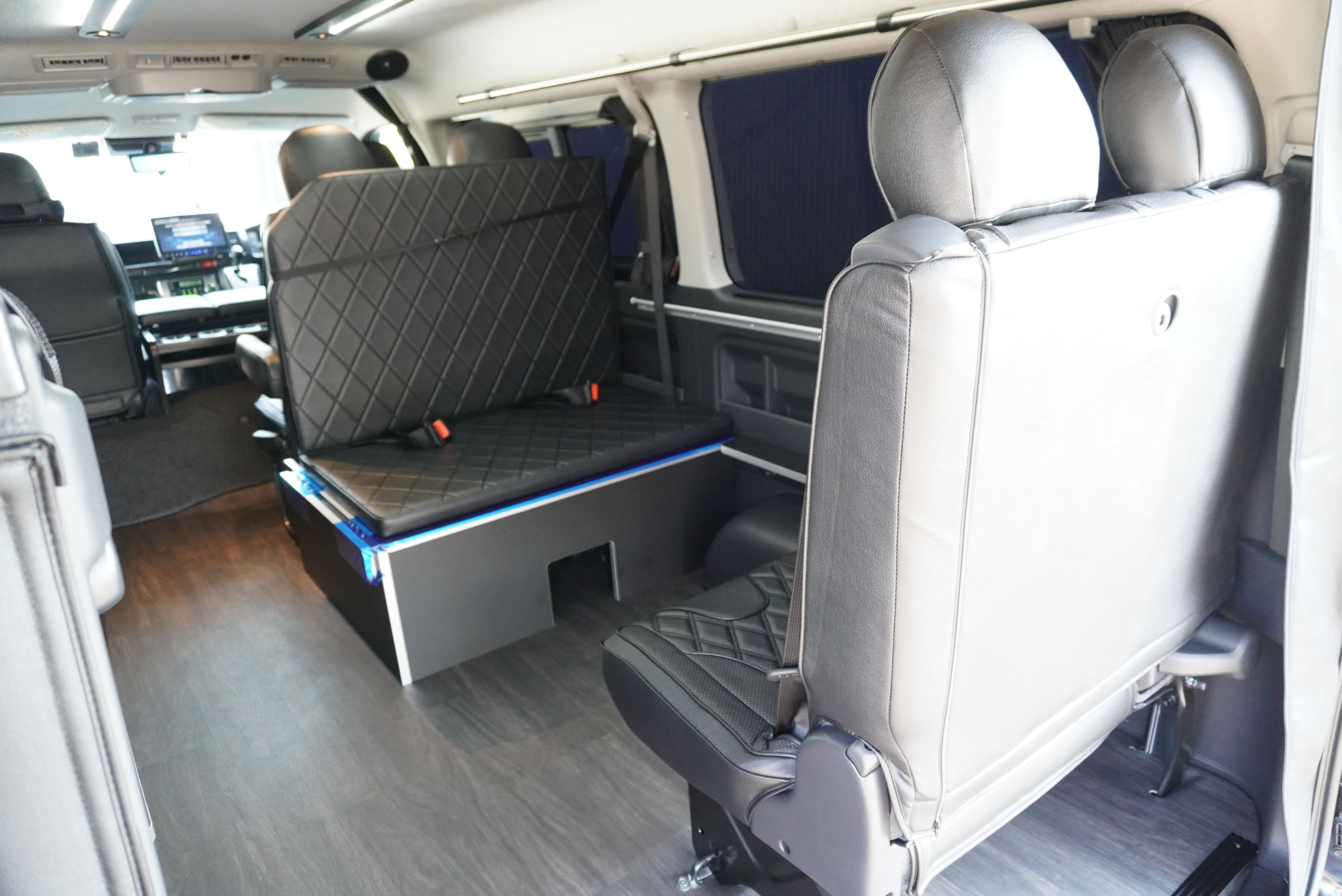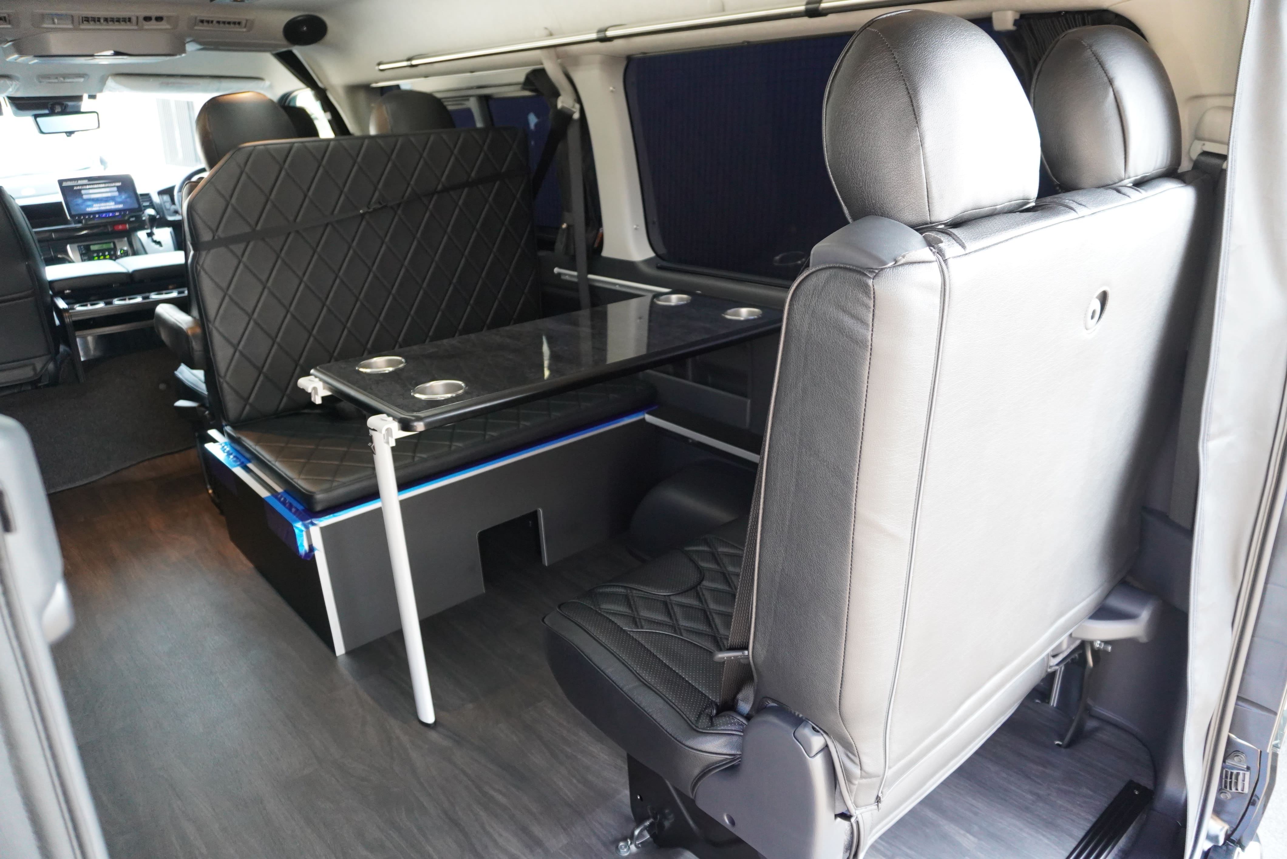 HOME > ギャラリー:IF-WB8 : ハイエースワゴンGL前向き8名後ろ向き2名10人乗り対面ラウンジベット家具 > IF-WB8 200系ハイエースワゴンGL ワイドボディー 前向き8名後ろ向き2名10人乗り対面ラウンジベッド家具施工