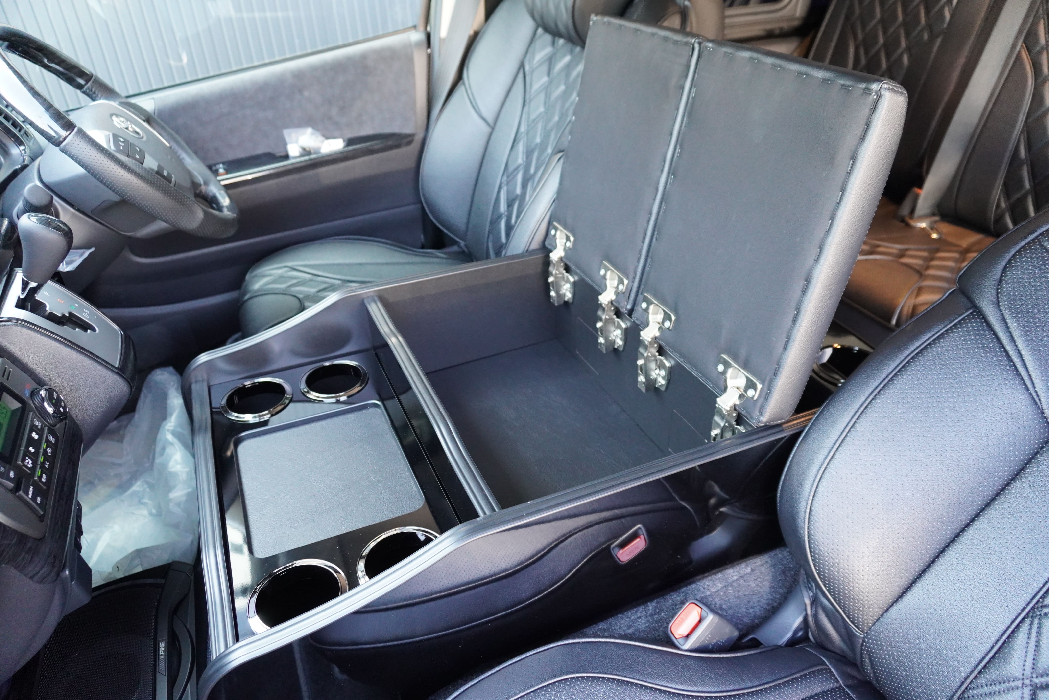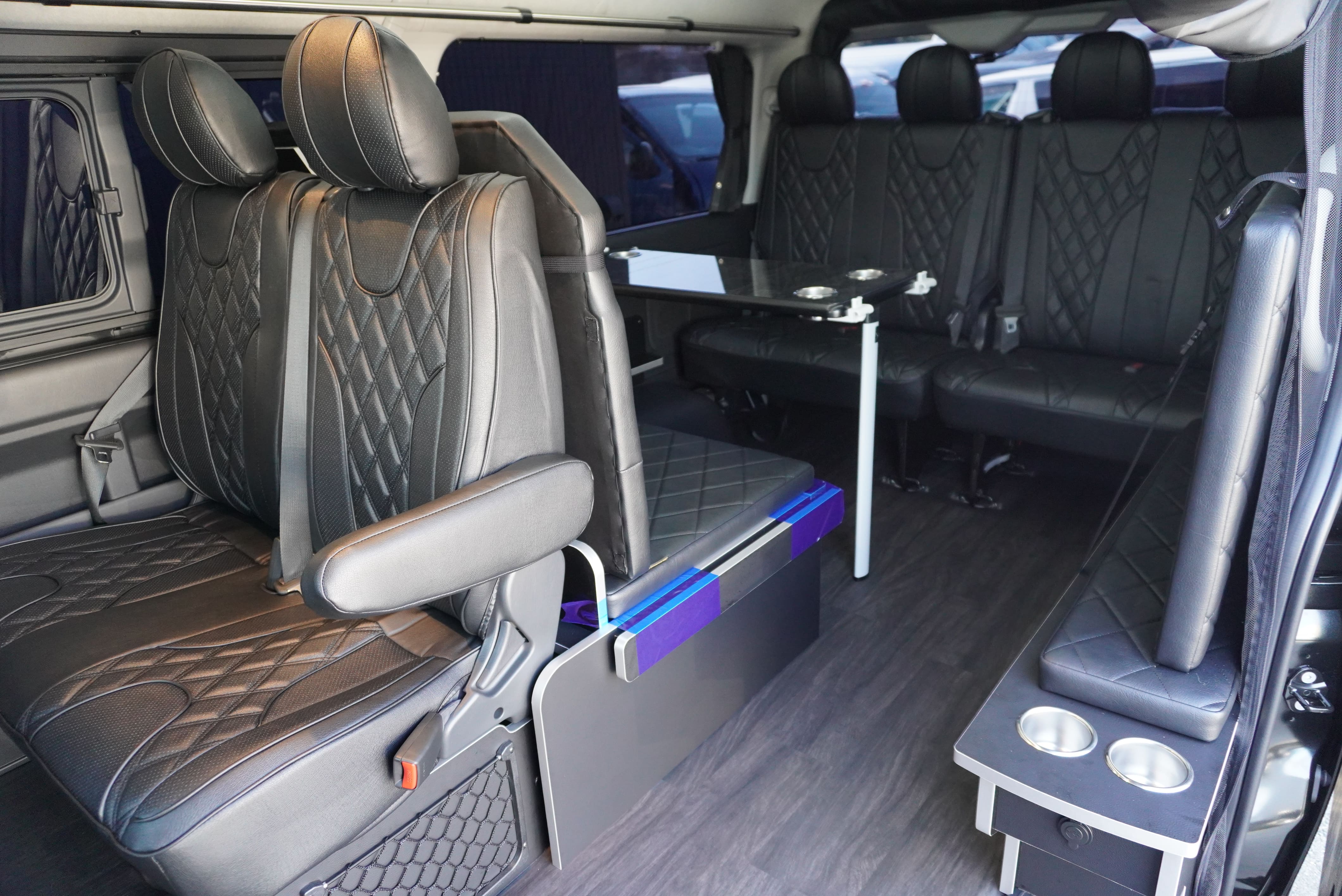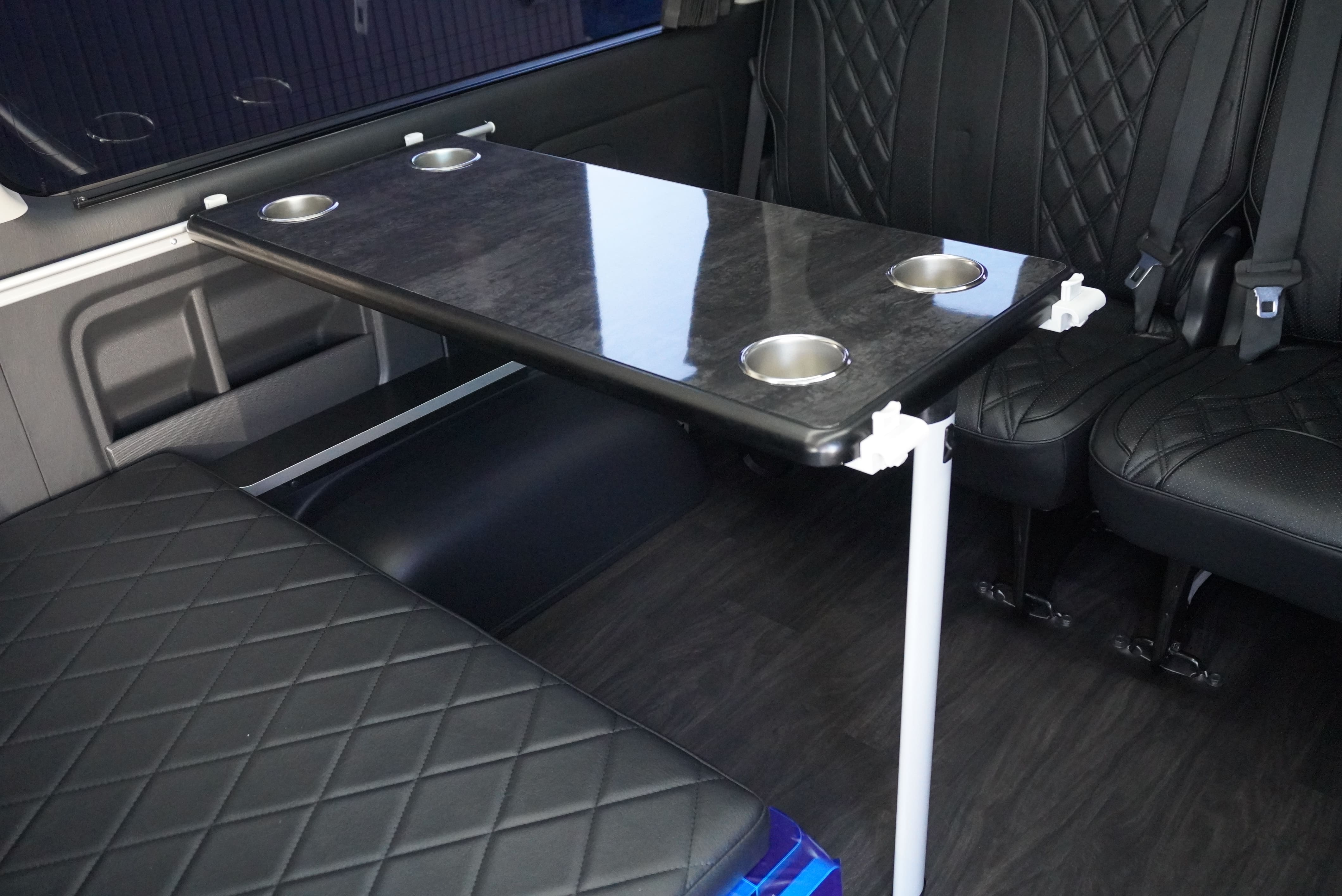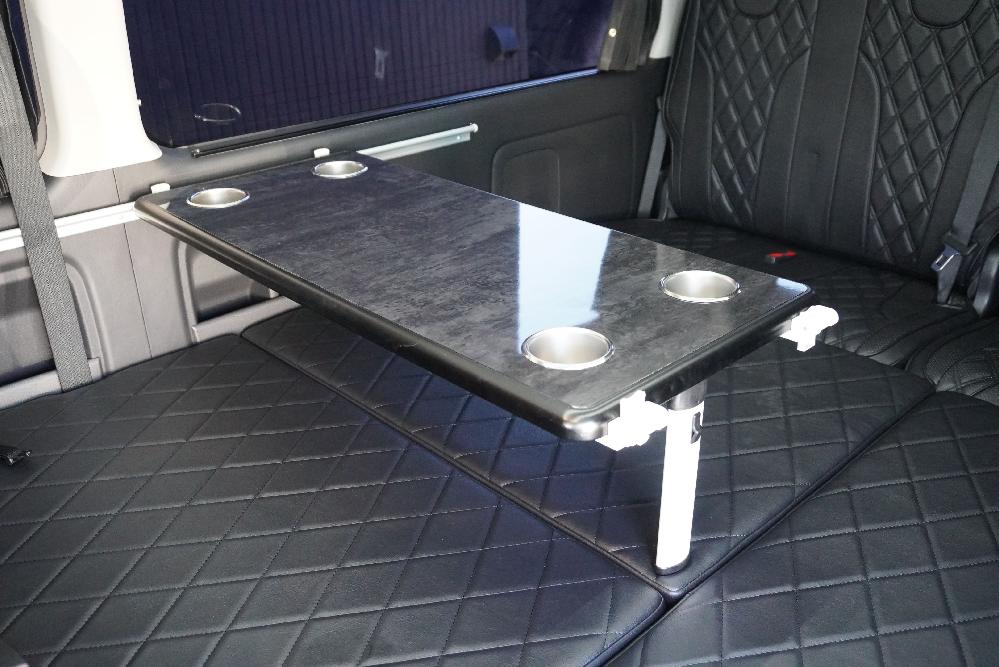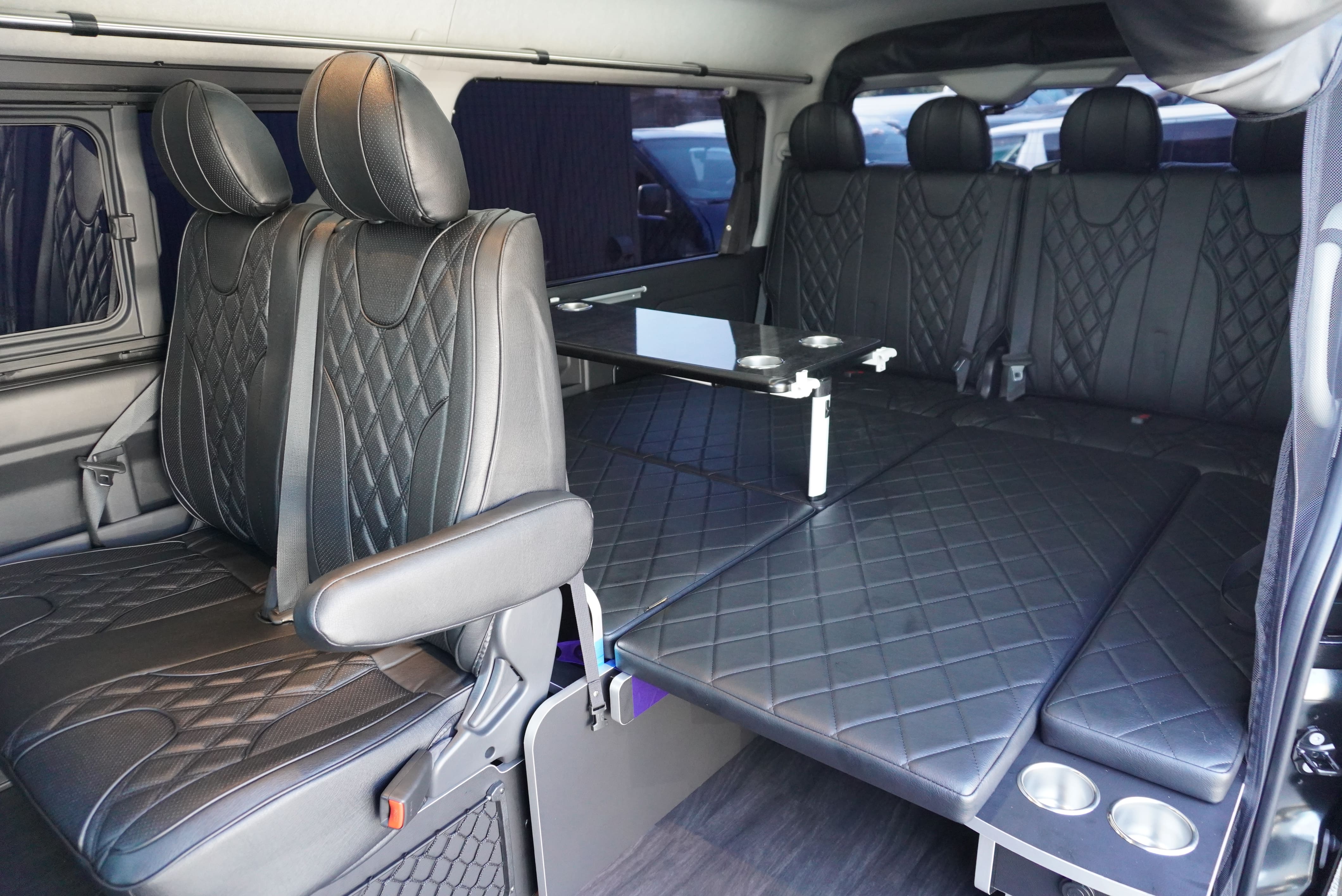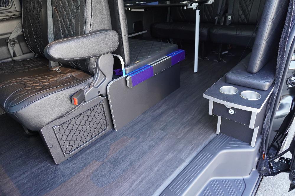 オプションサイドレールテーブル(ロングレッグ) 対面ラウンジ展開 2列目ワゴンGL純正2名シート 3列目ワゴンGL純正シート取り外し IF-WB8後ろ向き2名専用ベット家具