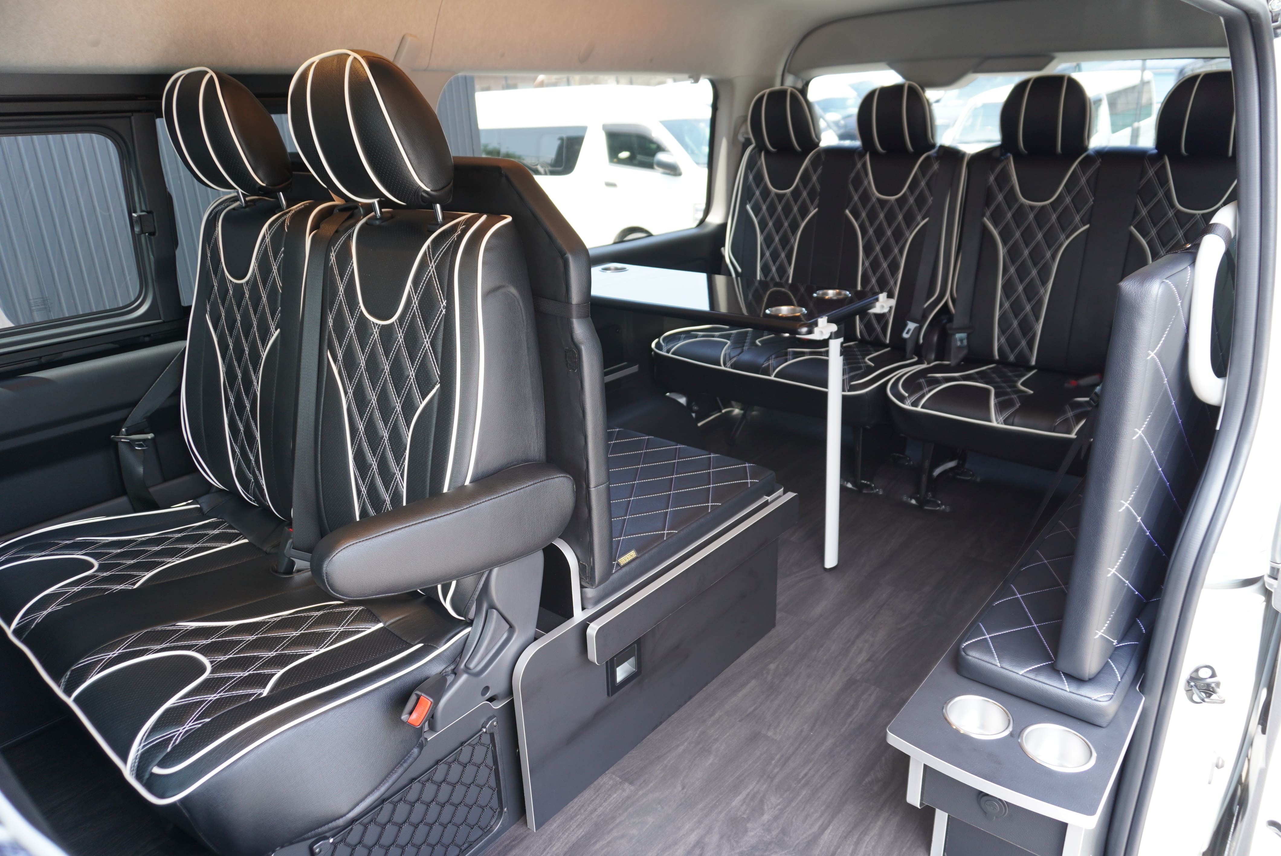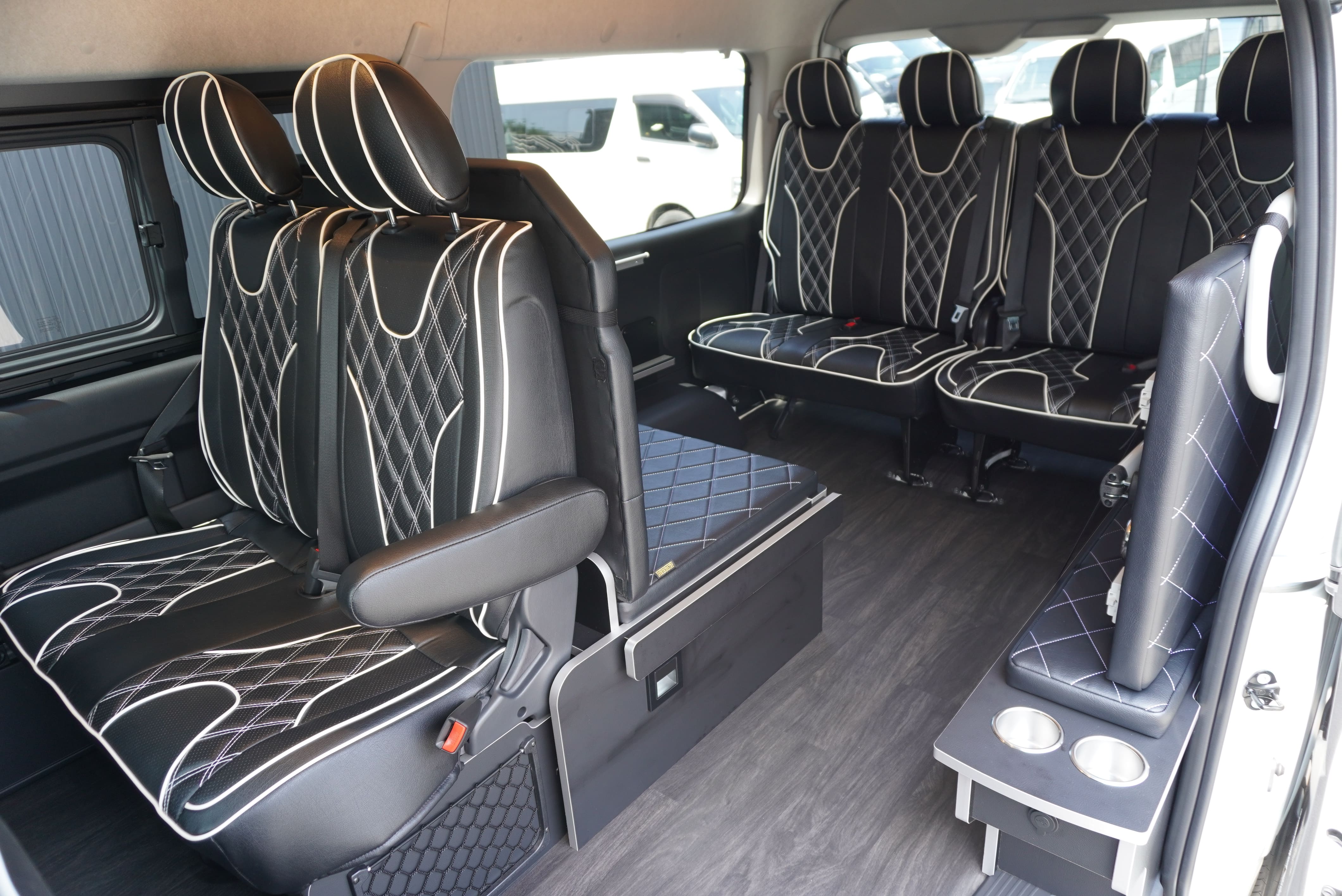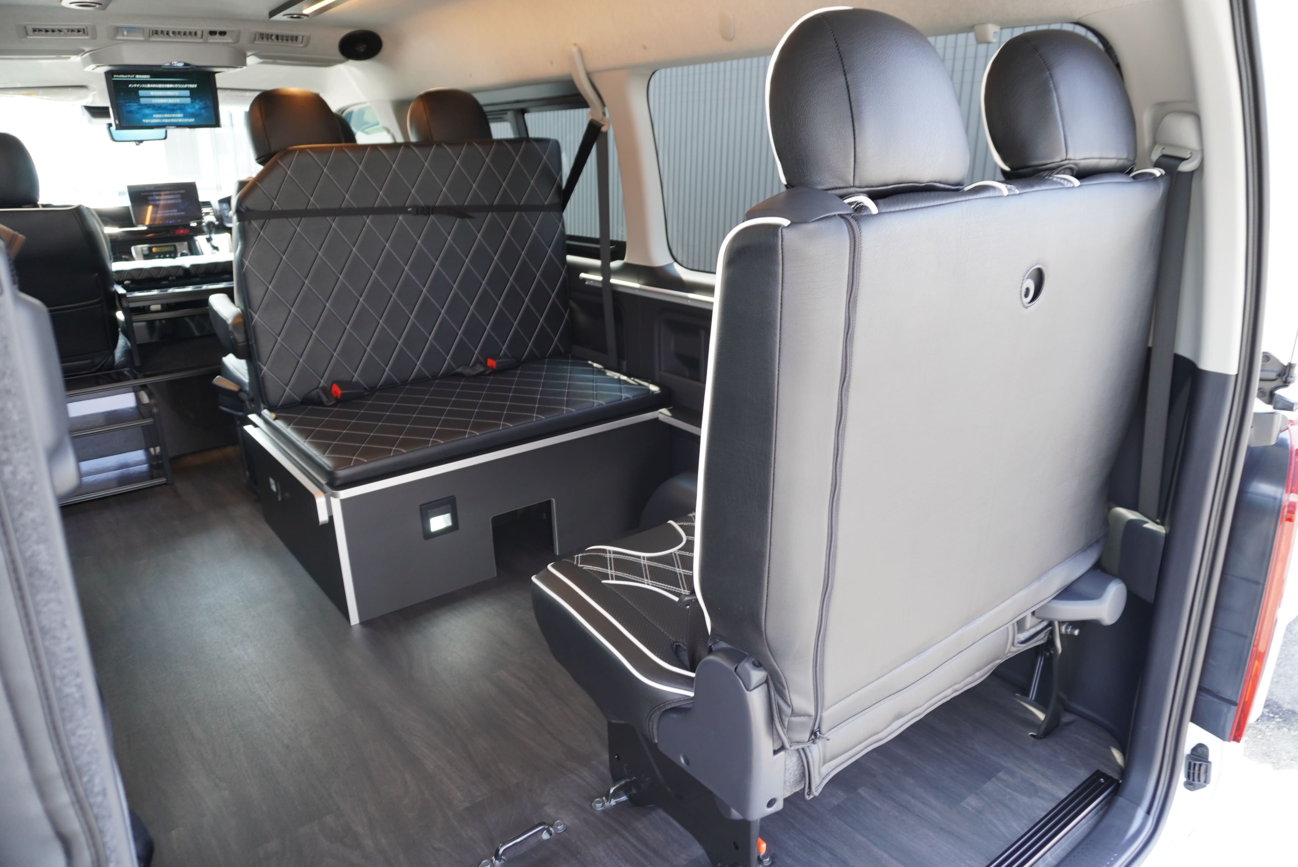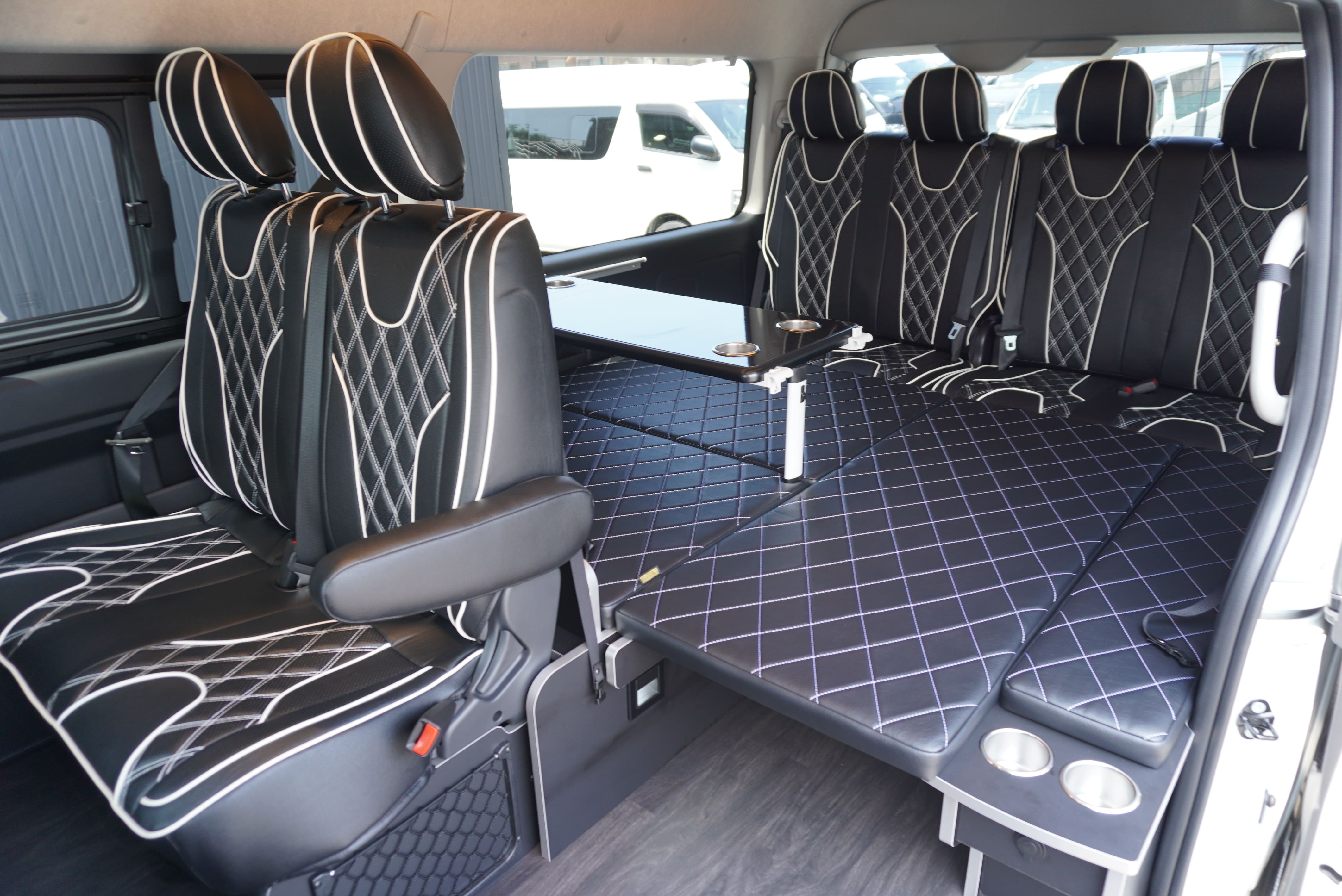 HOME > ギャラリー:IF-WB8 : ハイエースワゴンGL前向き8名後ろ向き2名10人乗り対面ラウンジベット家具 > IF-WB8リビングサルーン 200系ハイエースワゴンGL ワイドボディー 前向き8名後ろ向き2名10人乗り対面ラウンジベッド家具施工