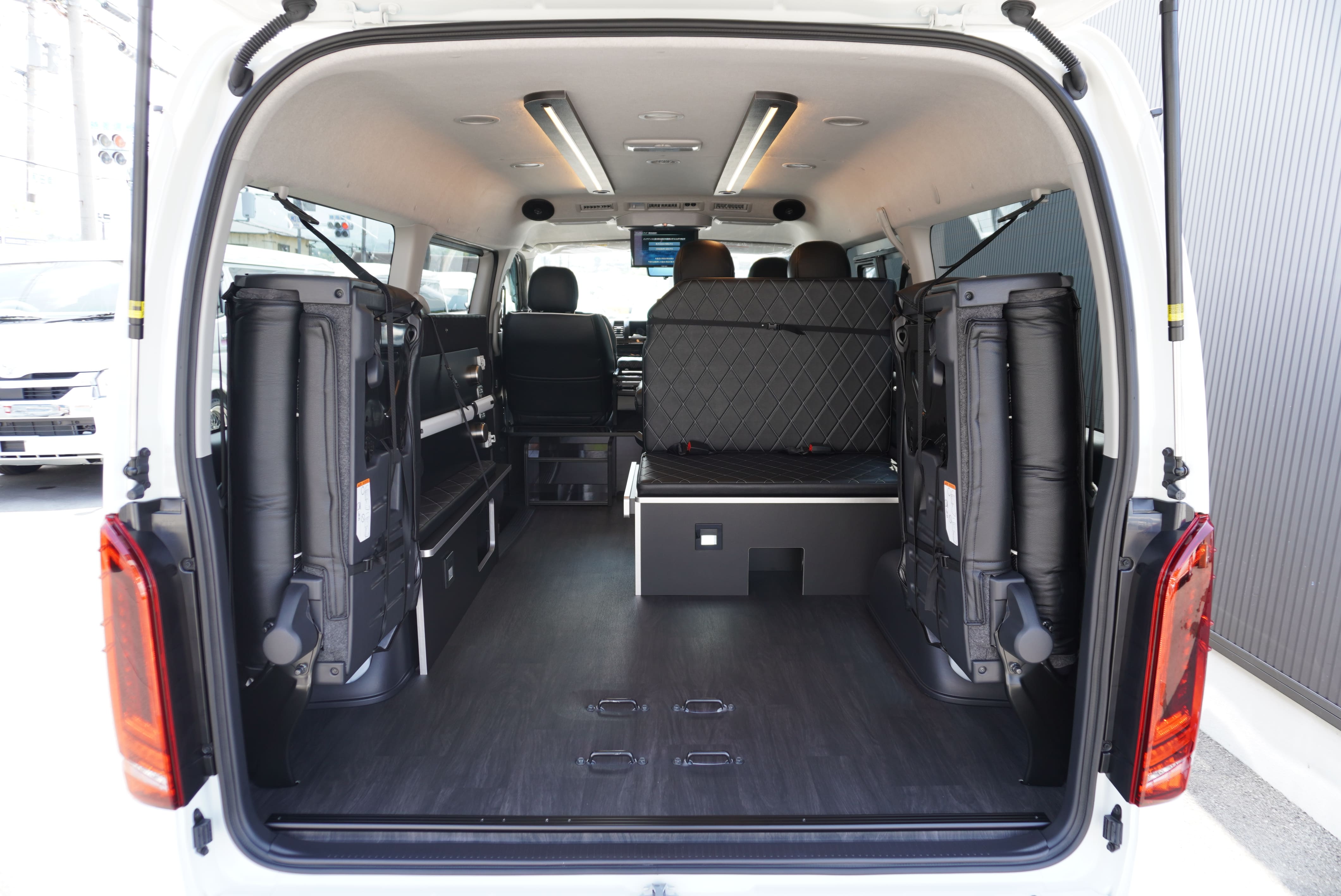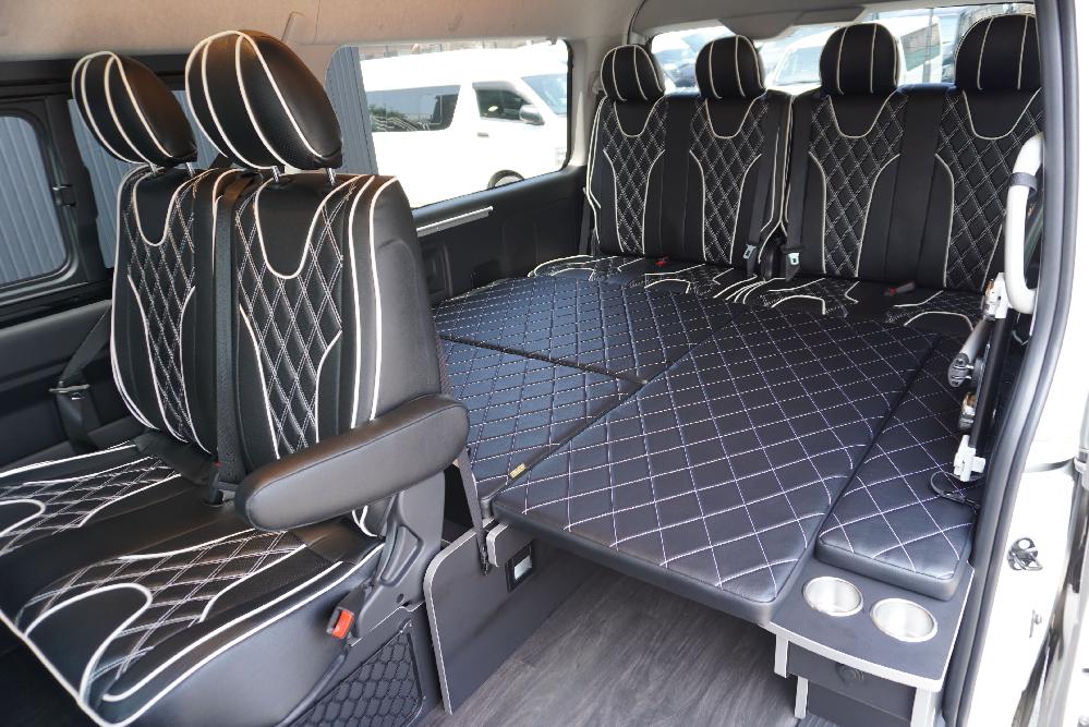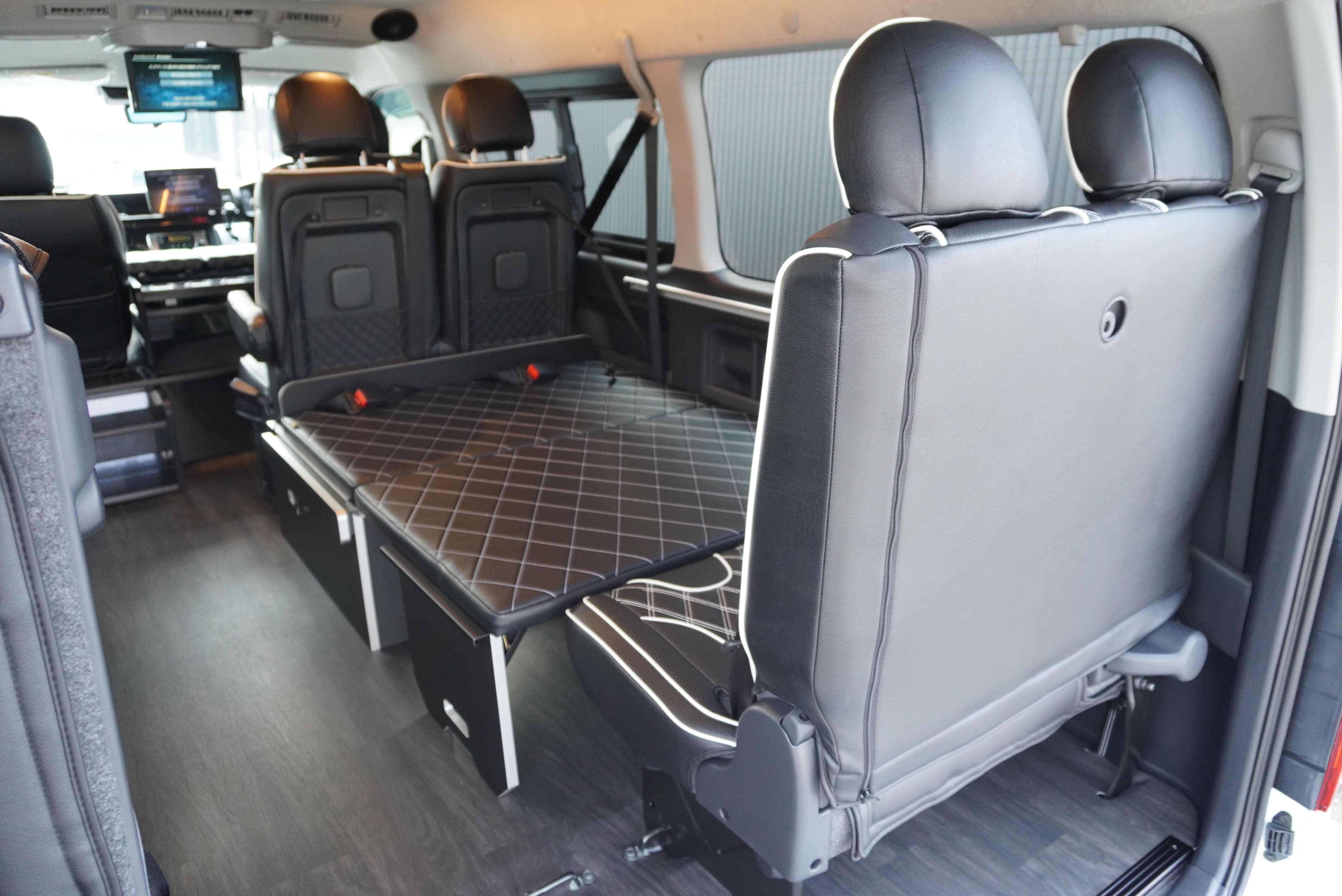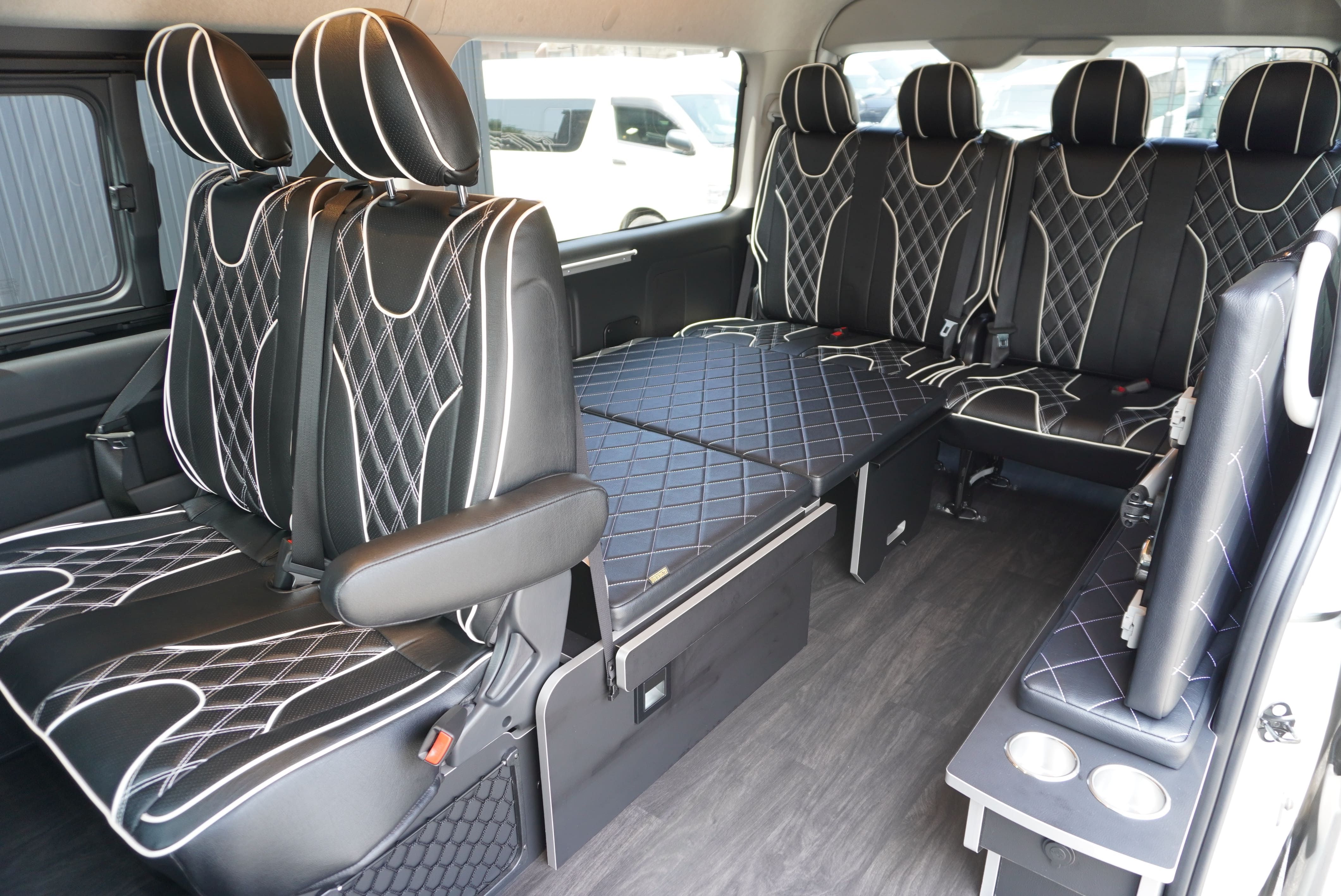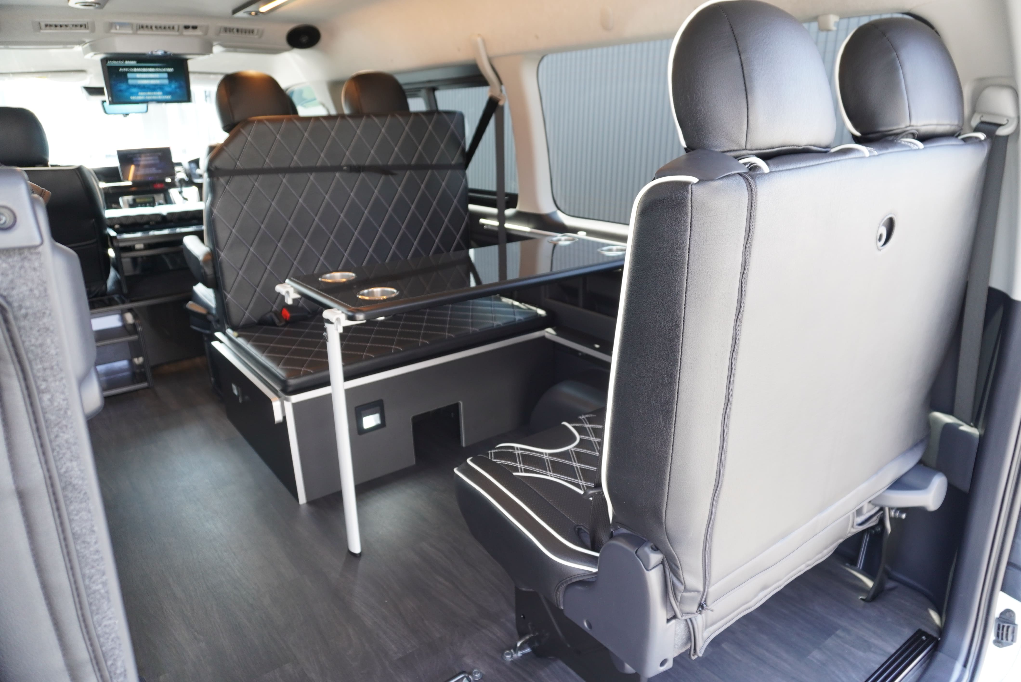 HOME > ギャラリー:IF-WB8 : ハイエースワゴンGL前向き8名後ろ向き2名10人乗り対面ラウンジベット家具 > IF-WB8リビングサルーン 200系ハイエースワゴンGL ワイドボディー 前向き8名後ろ向き2名10人乗り対面ラウンジベッド家具施工