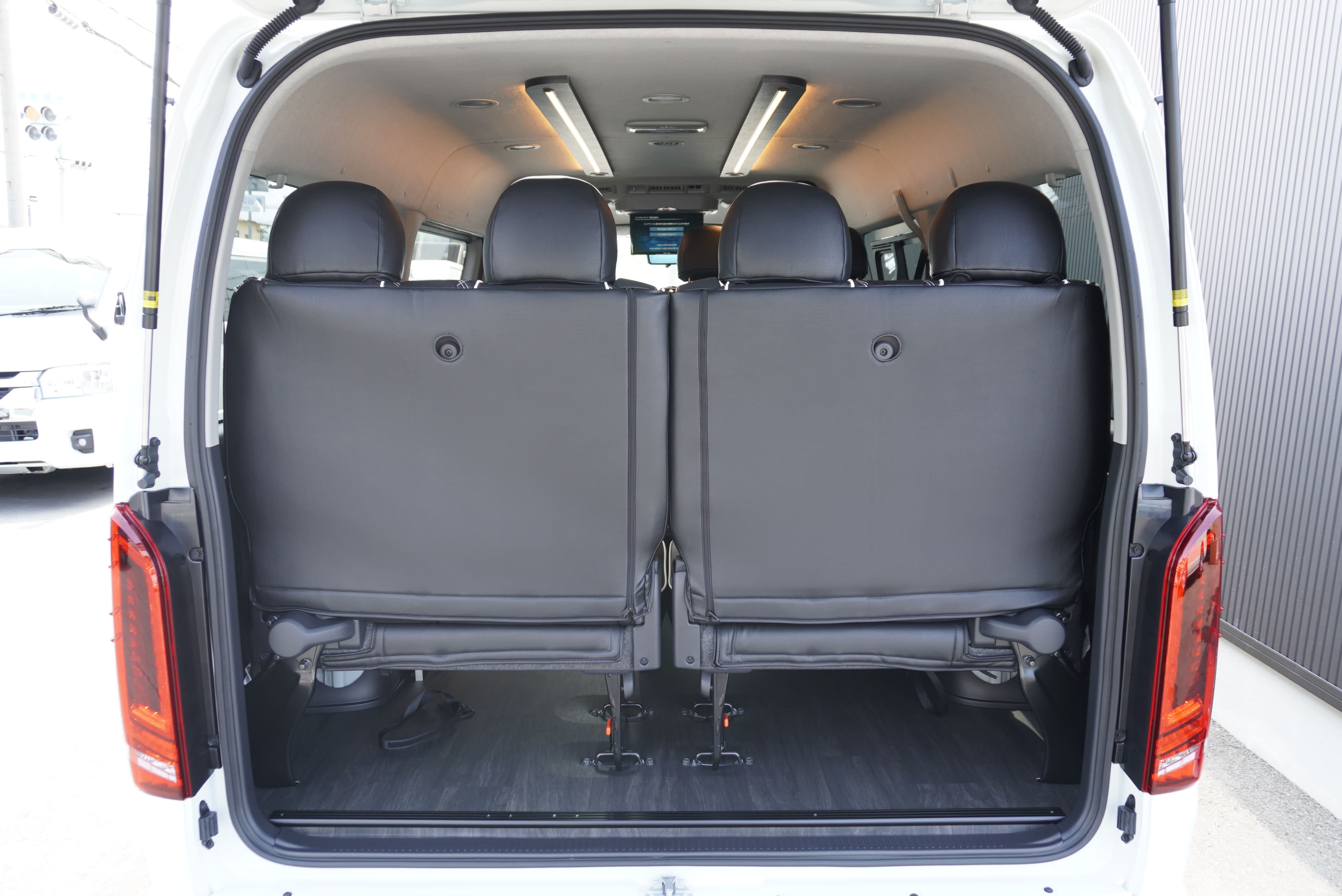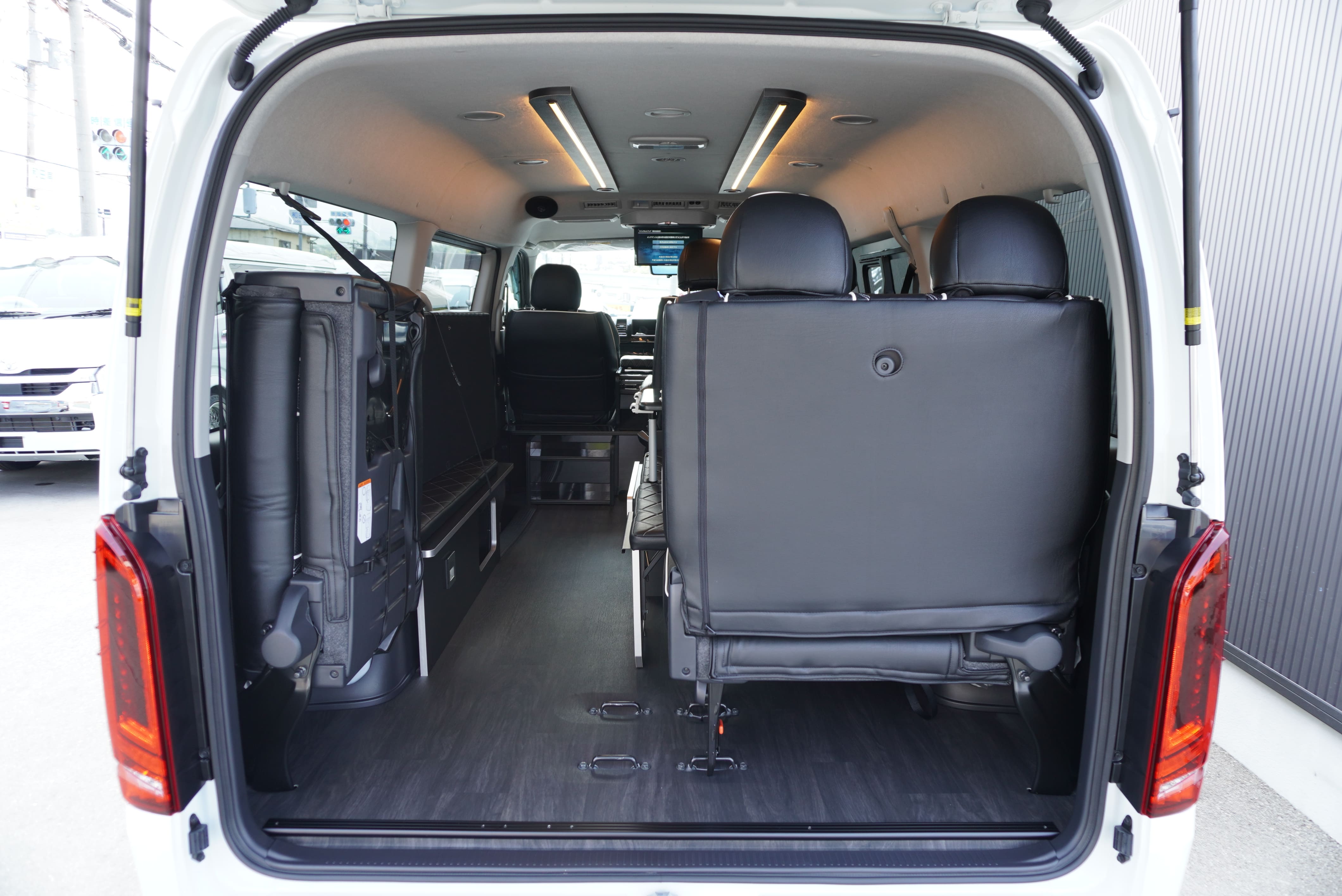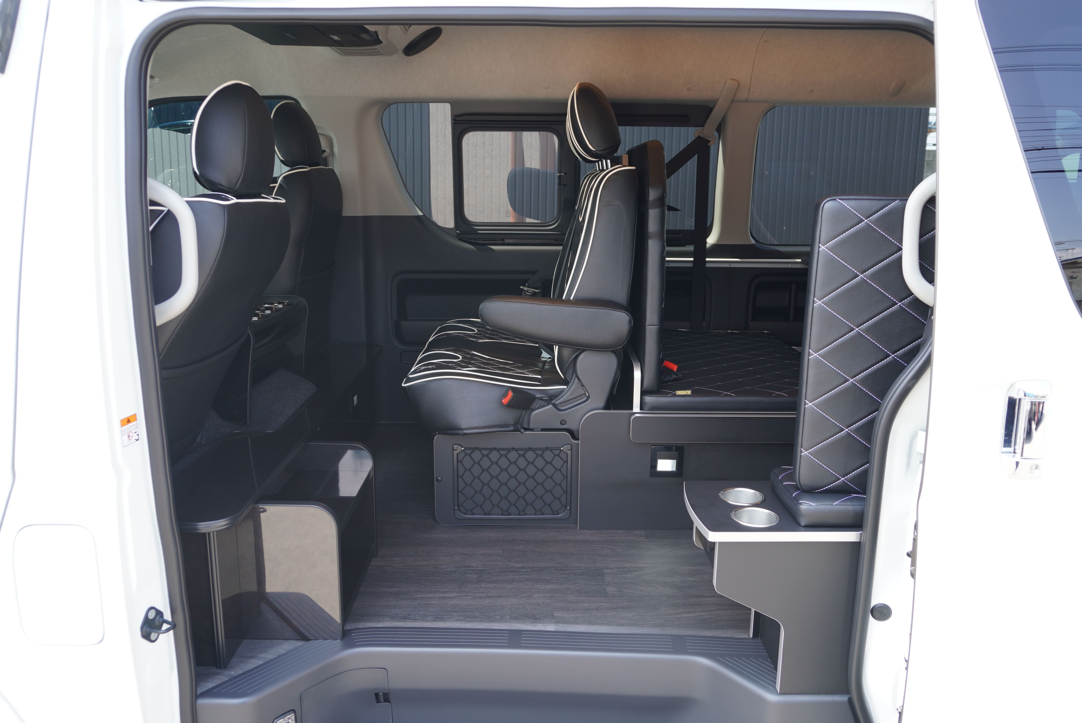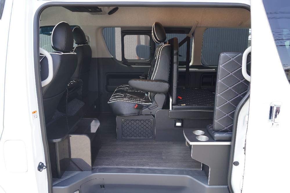 HOME > ギャラリー:IF-WB8 : ハイエースワゴンGL前向き8名後ろ向き2名10人乗り対面ラウンジベット家具 > IF-WB8リビングサルーン 200系ハイエースワゴンGL ワイドボディー 前向き8名後ろ向き2名10人乗り対面ラウンジベッド家具施工