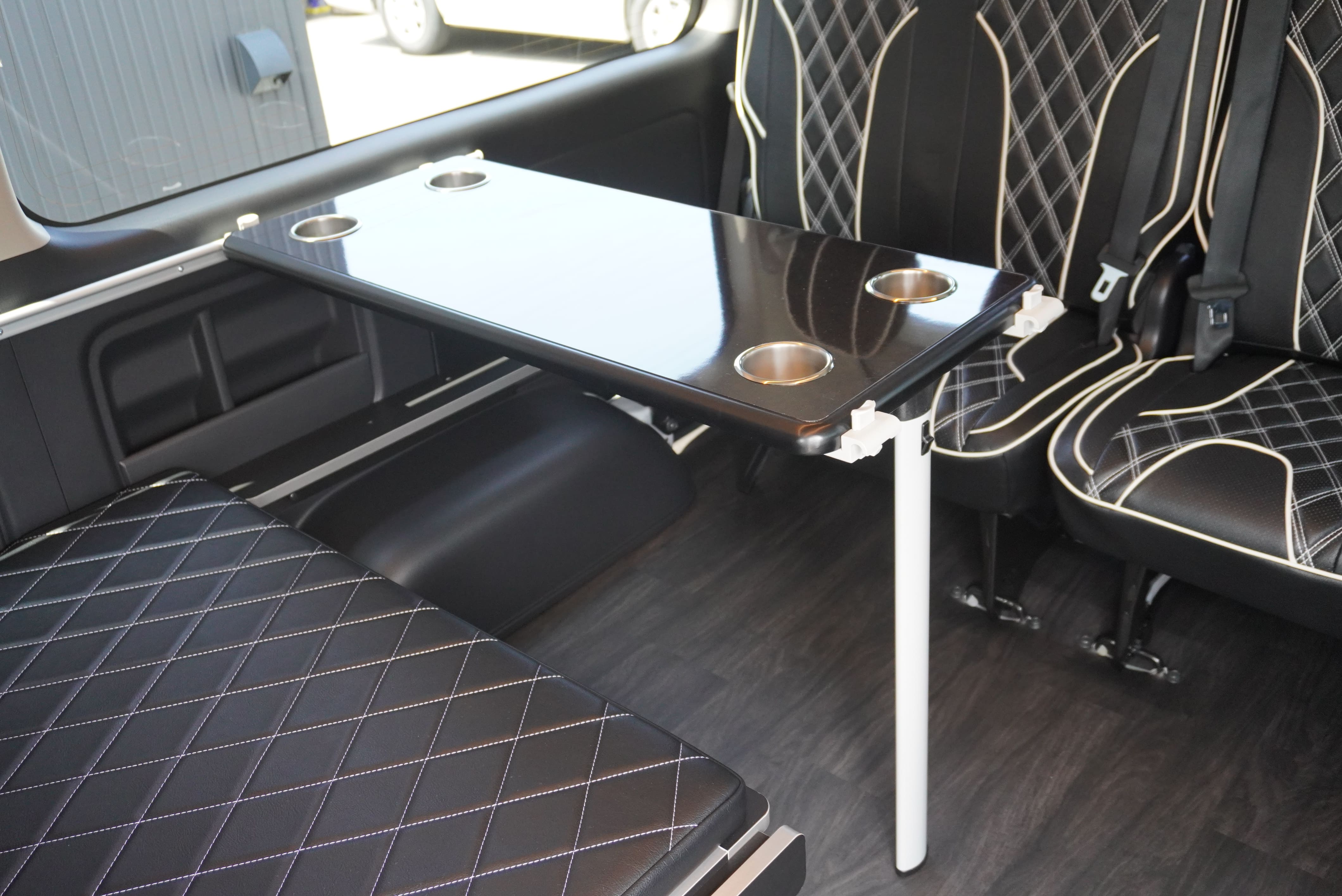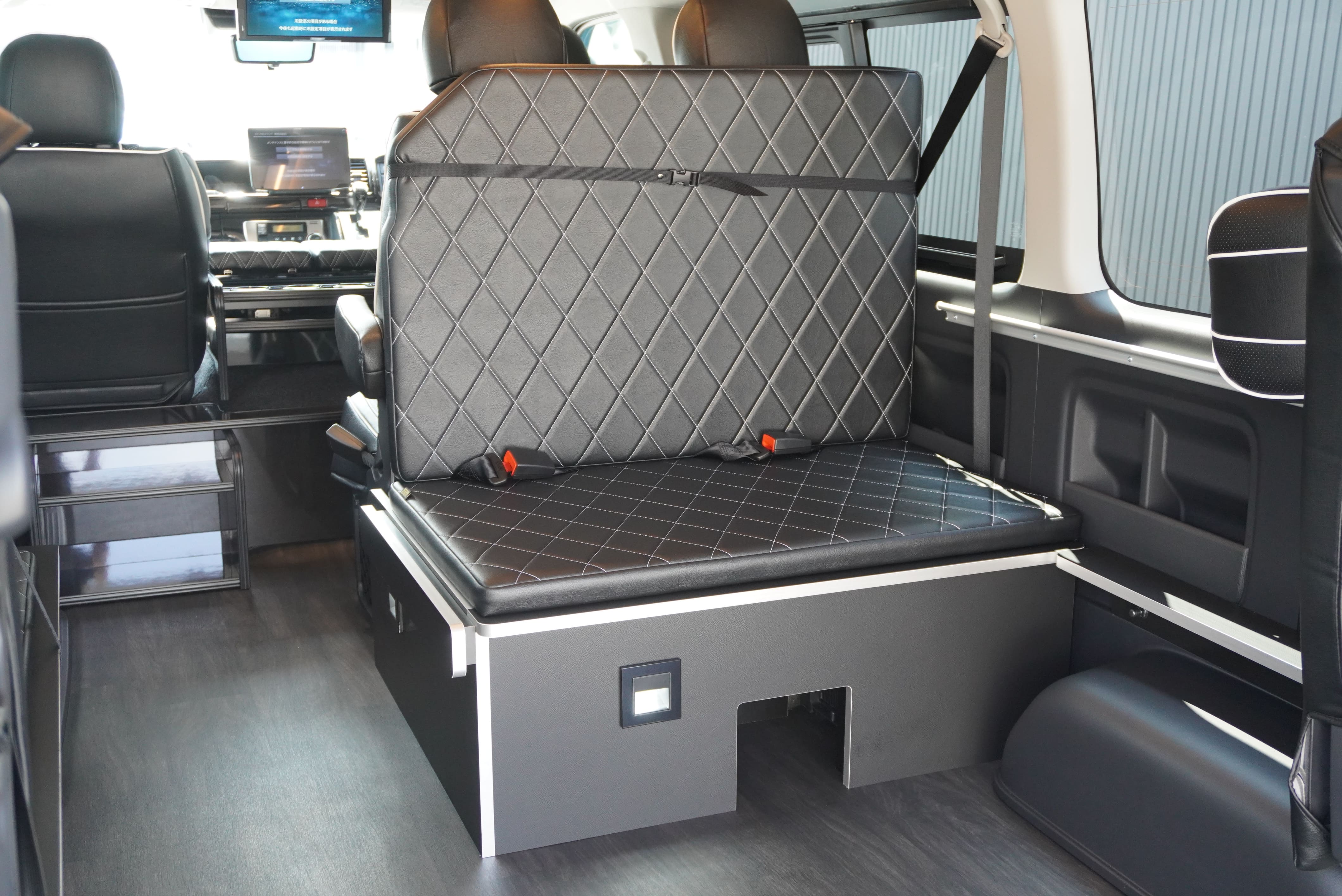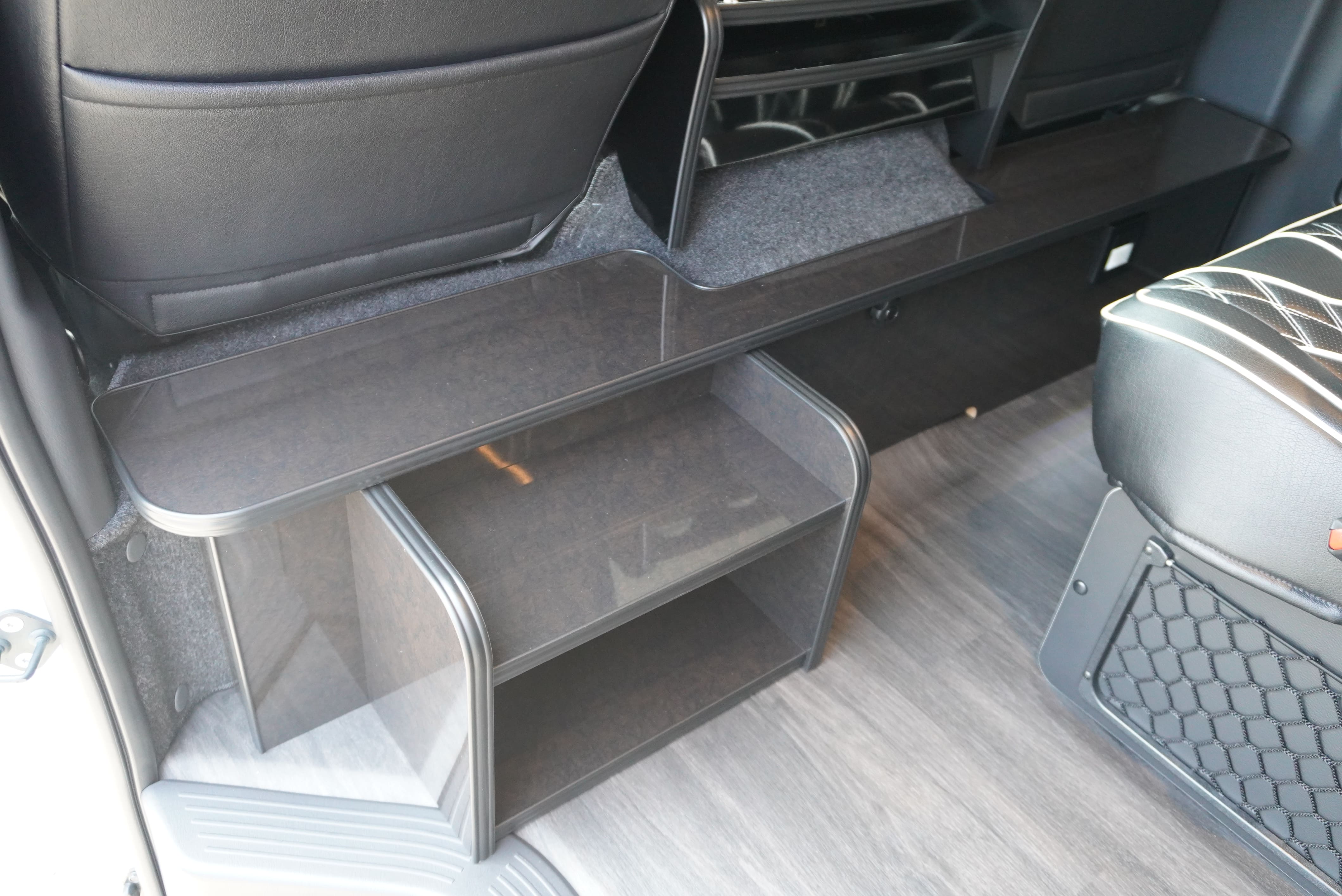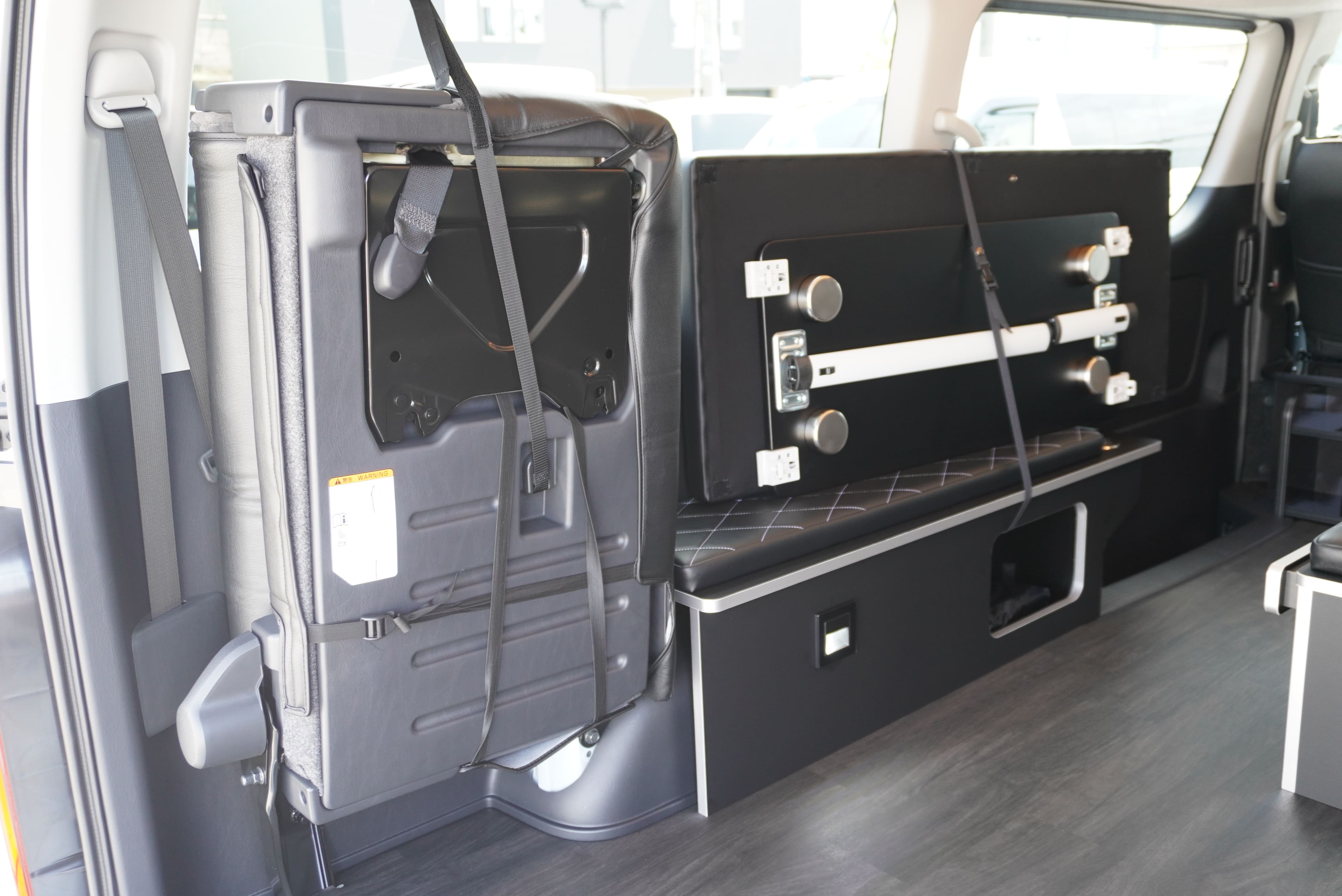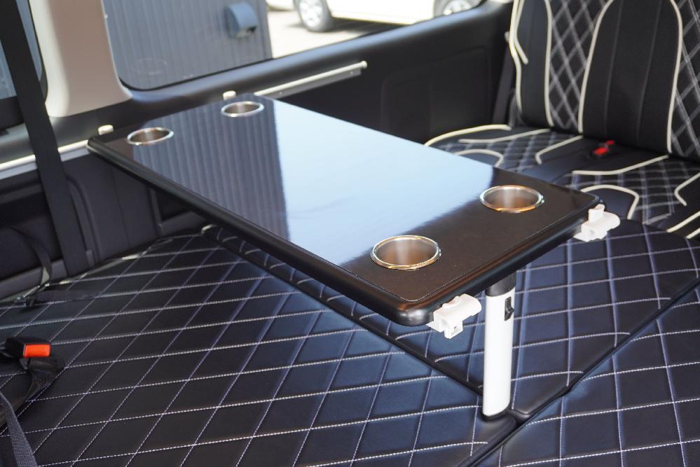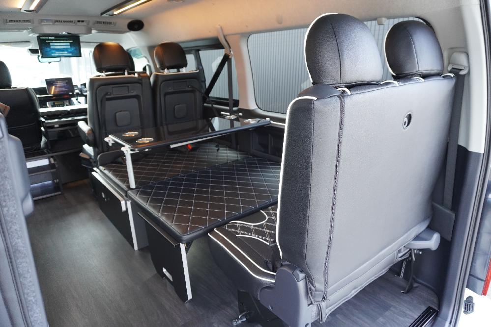 オプションサイドレールテーブル(ロングレッグ) 対面ラウンジ展開 2列目ワゴンGL純正2名シート 3列目ワゴンGL純正シート取り外し IF-WB8後ろ向き2名専用ベット家具 通路足下間接照明