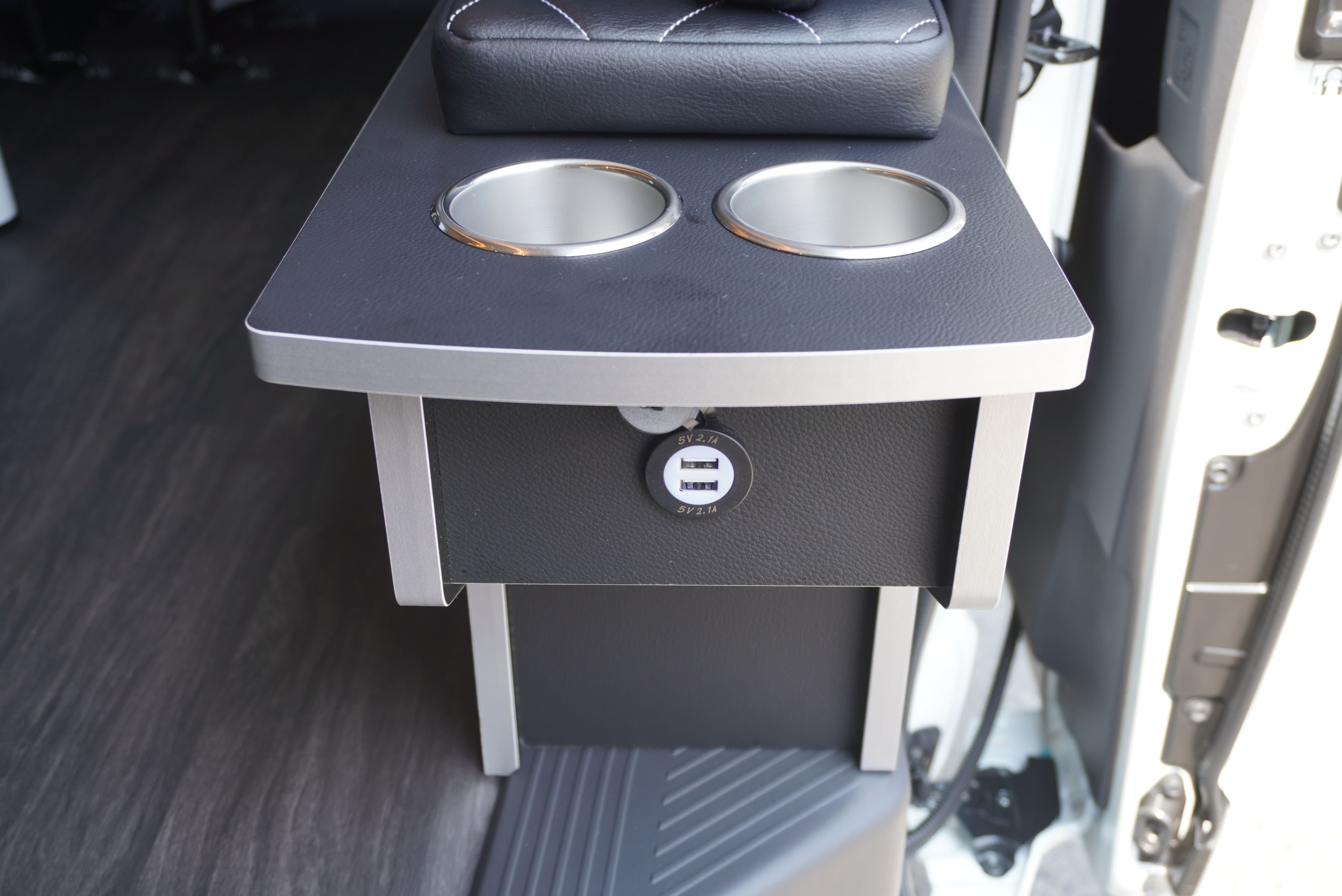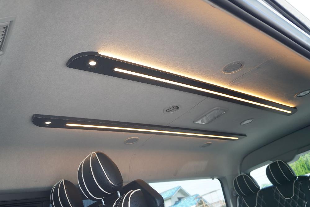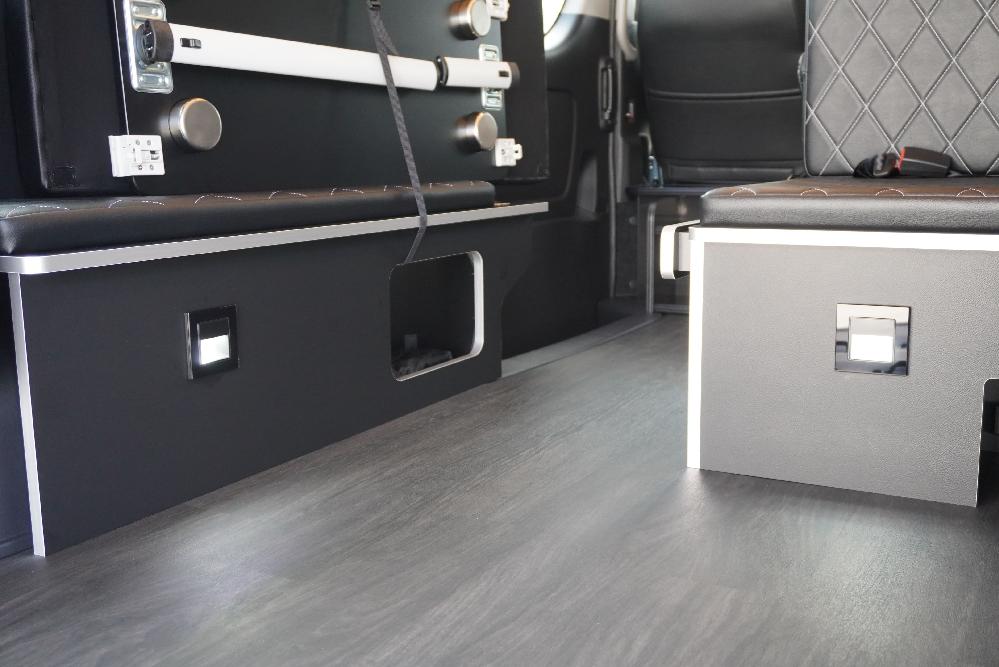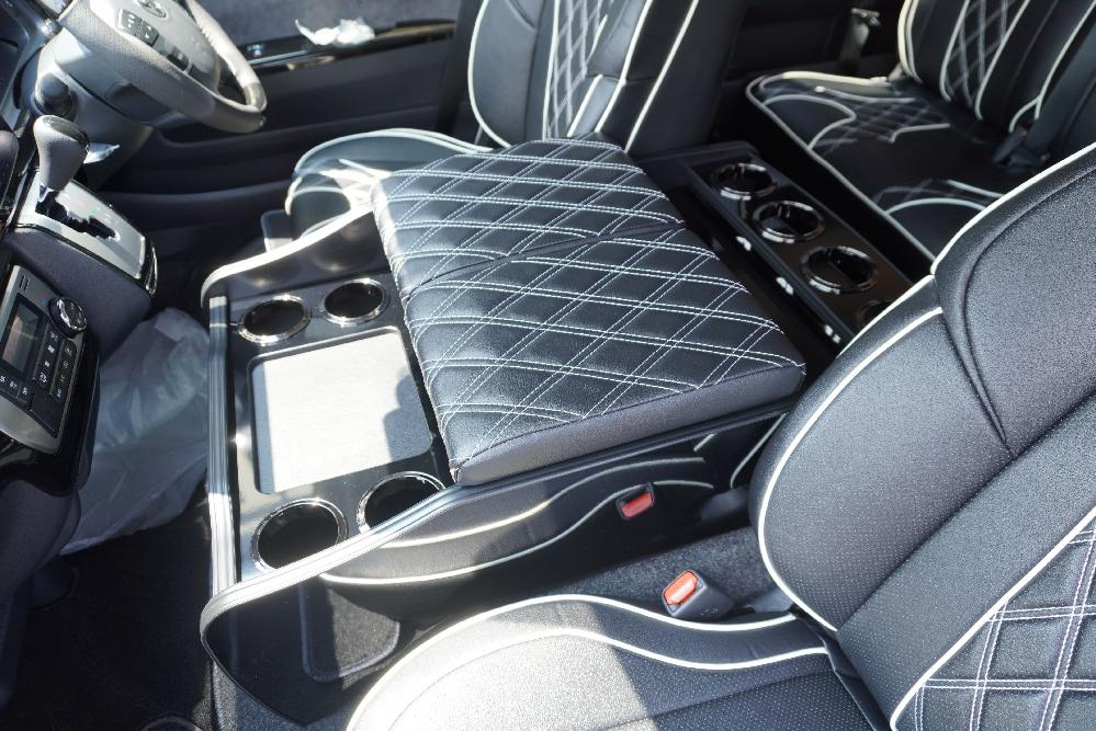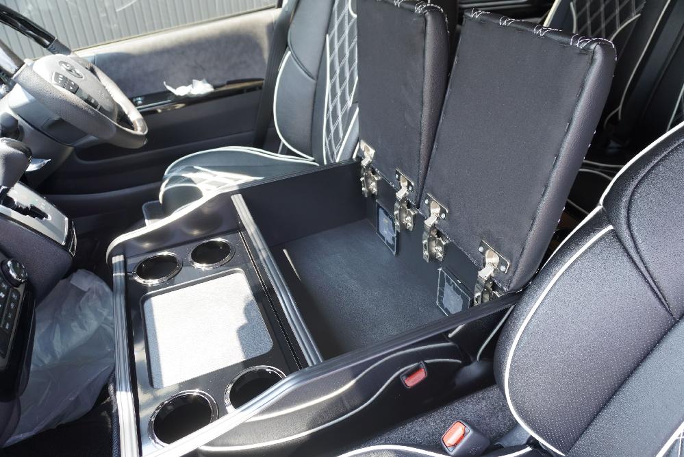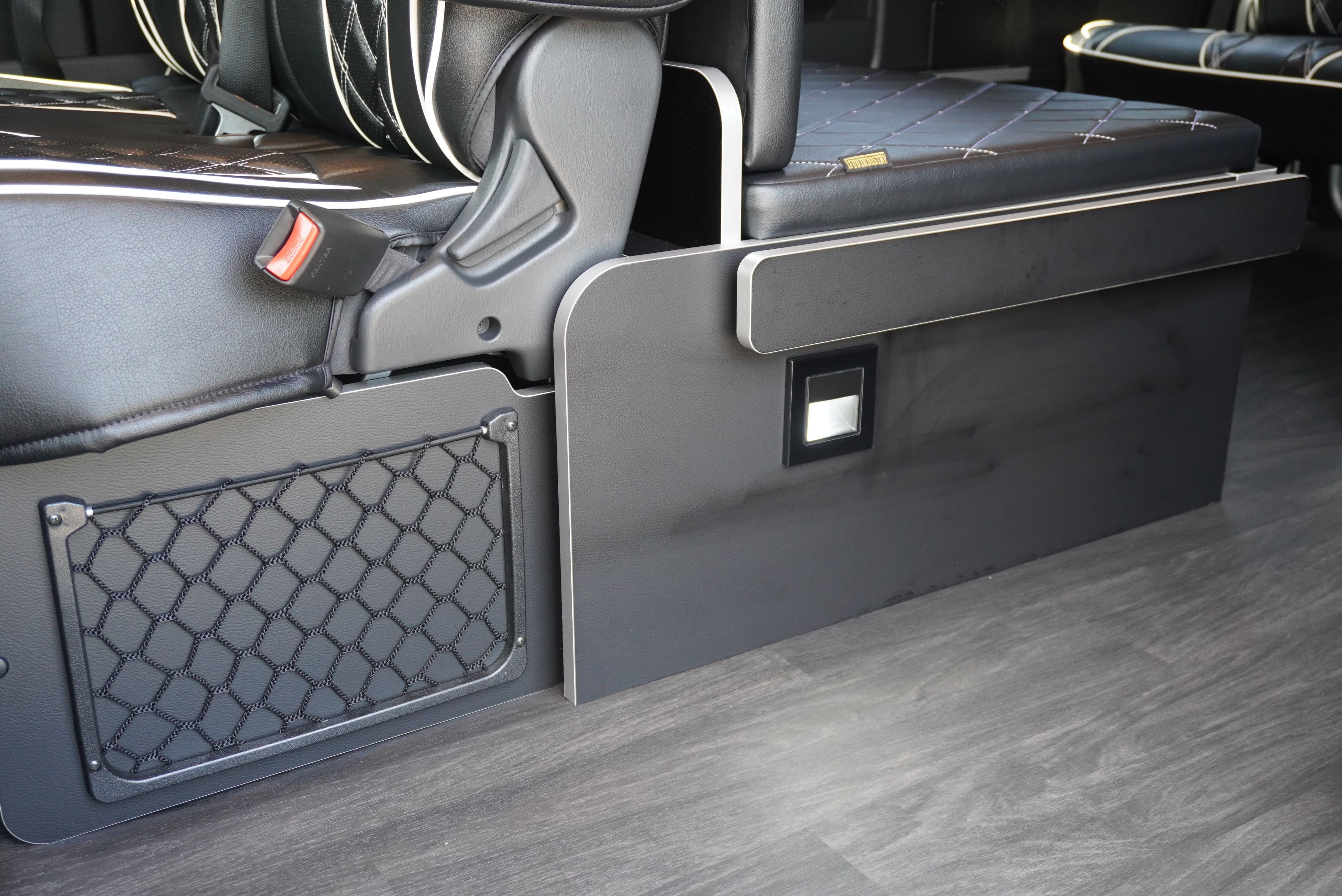 オプションサイドレールテーブル(ロングレッグ) 対面ラウンジ展開 2列目ワゴンGL純正2名シート 3列目ワゴンGL純正シート取り外し IF-WB8後ろ向き2名専用ベット家具 通路足下間接照明